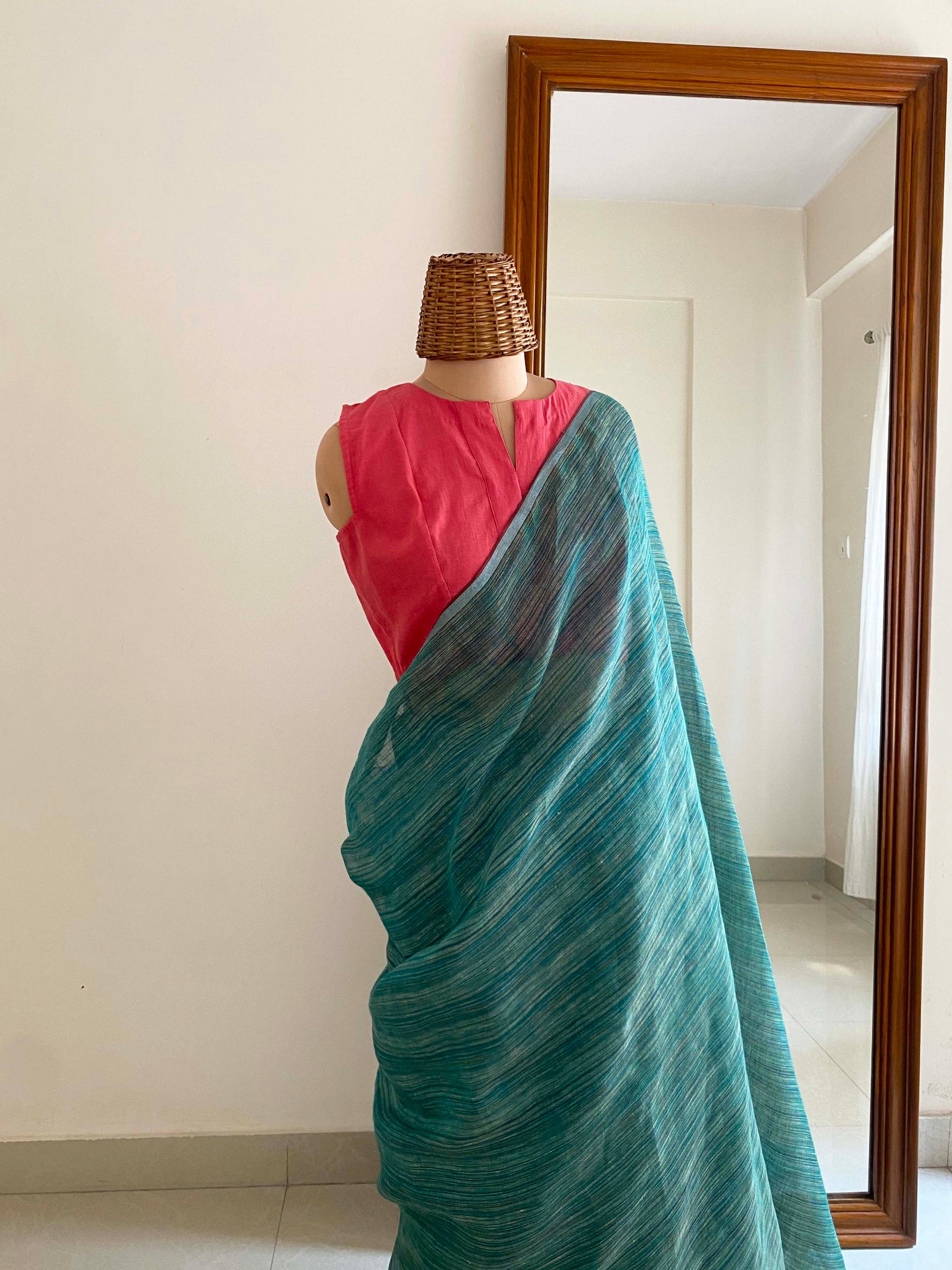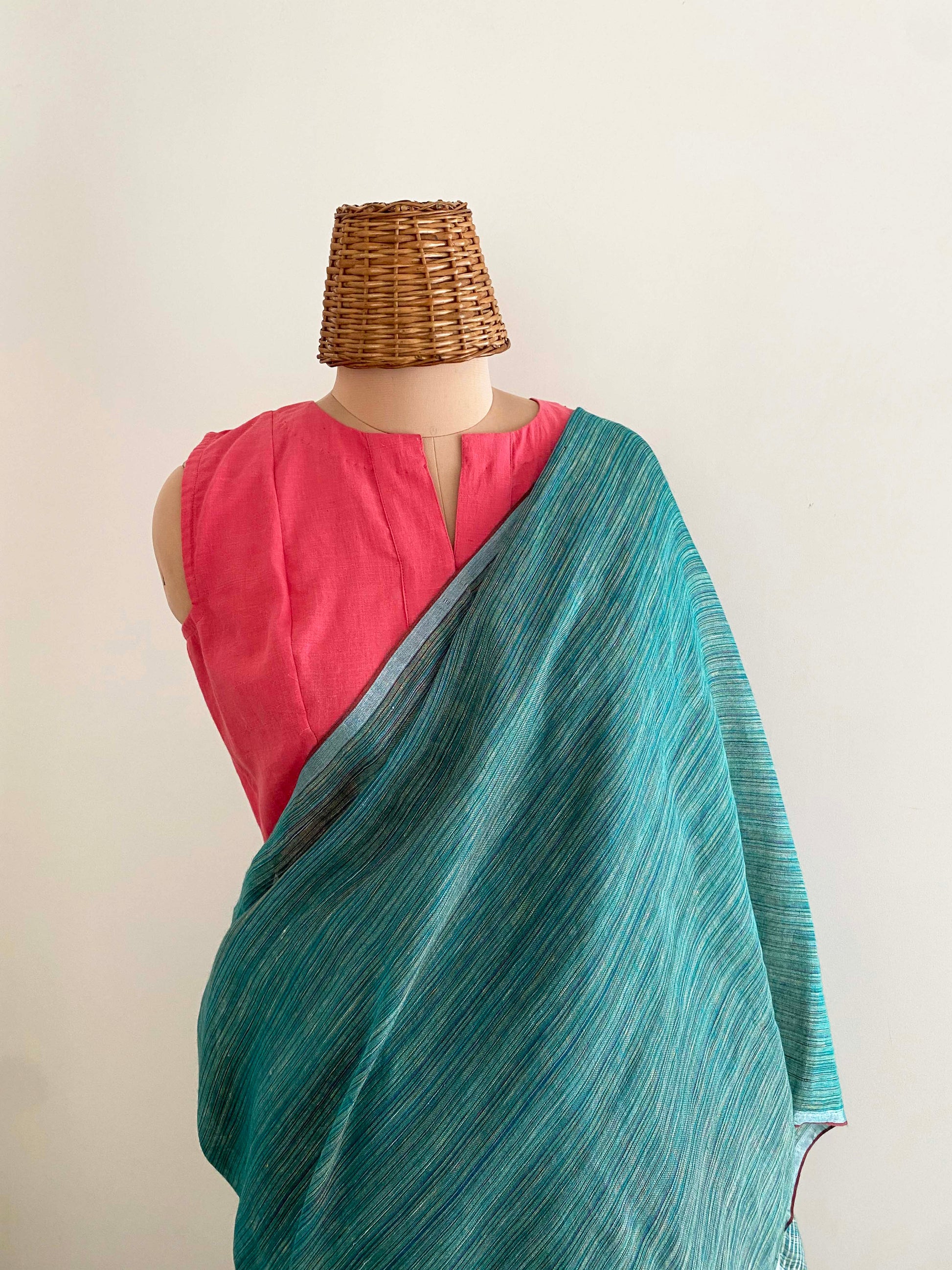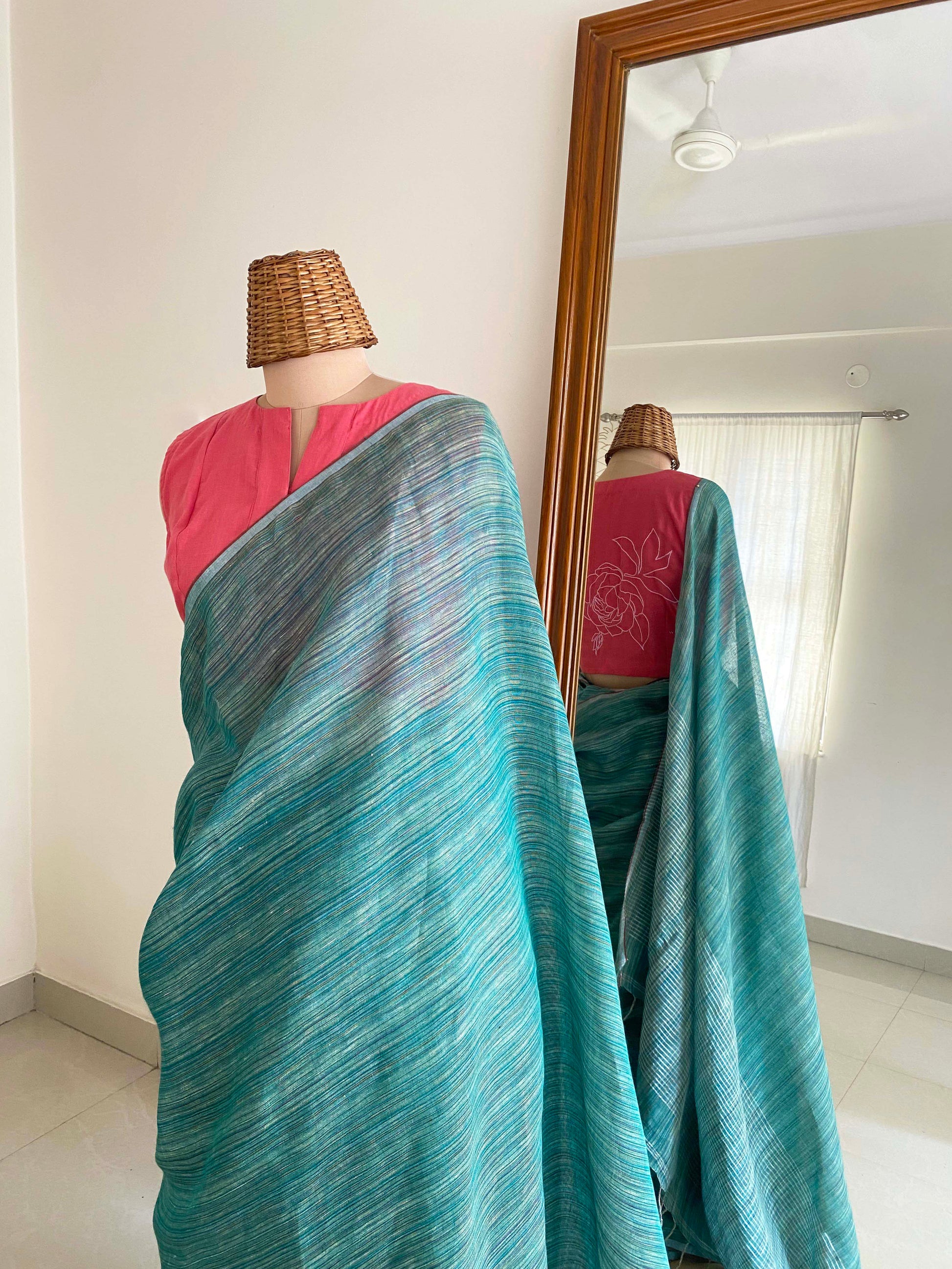 Our Recycled khadi saree in stripes of multiple hues ranging from greens to hints of yellows has been handwoven using recycled yarns from all our previous collections.