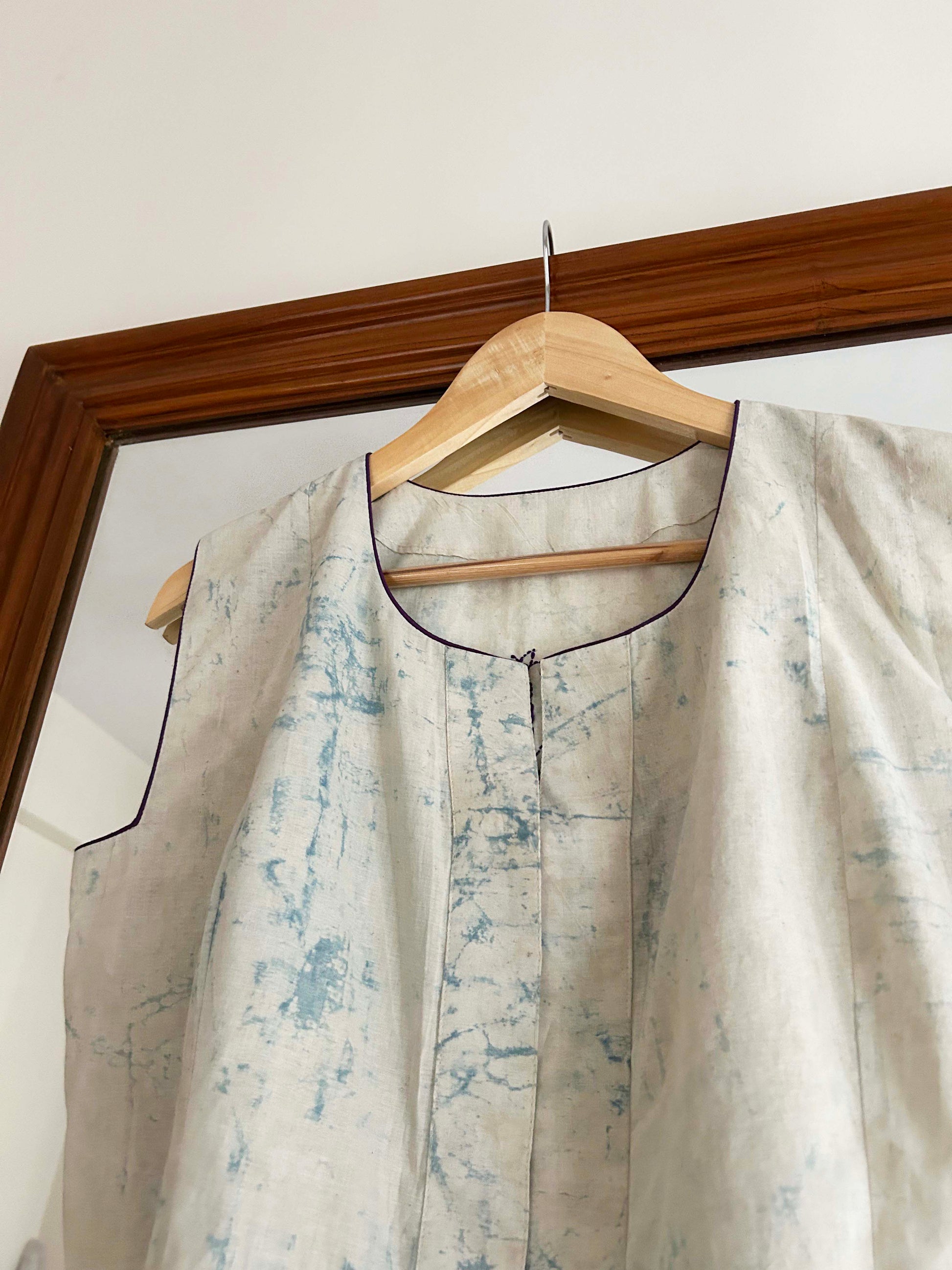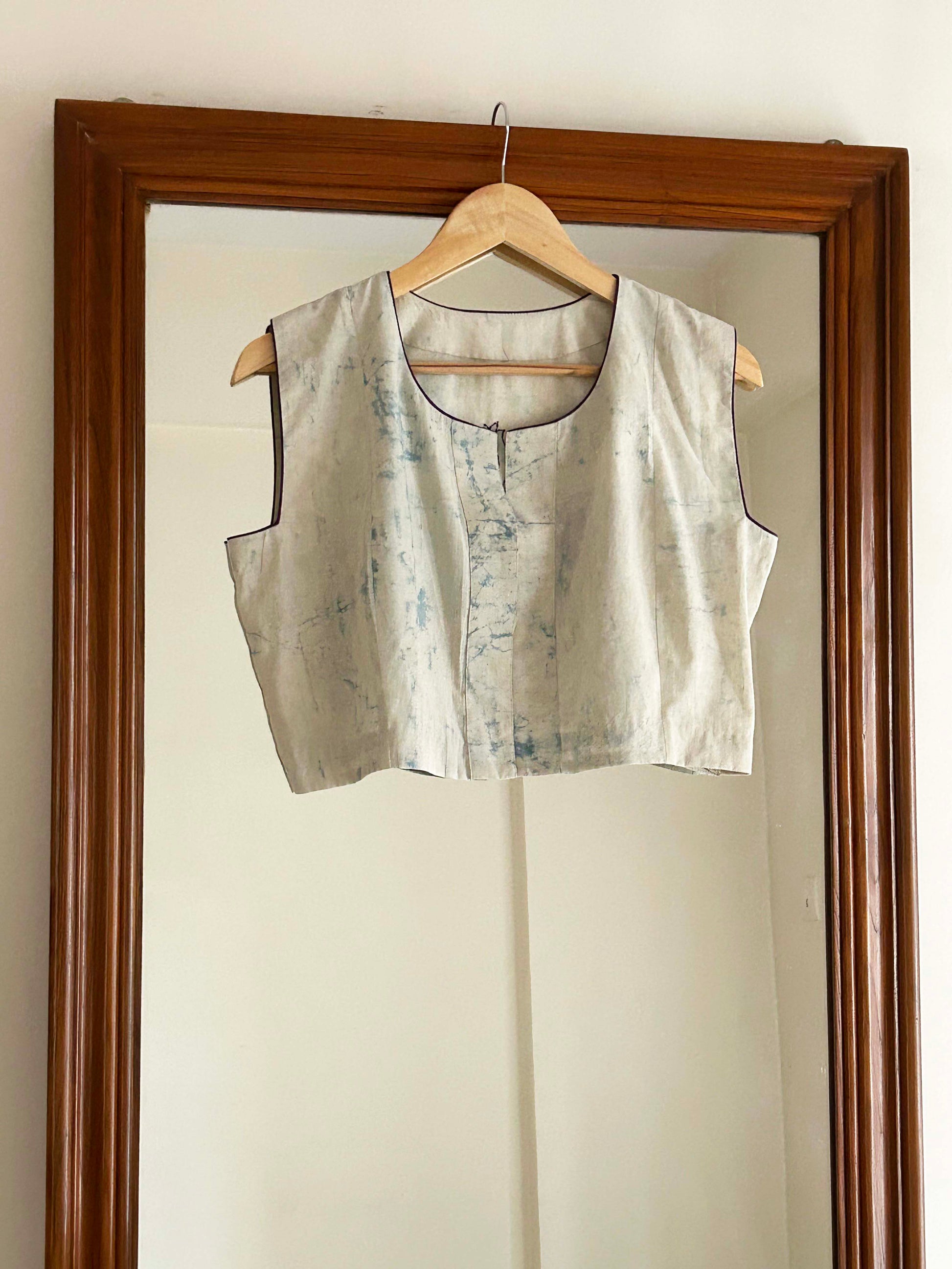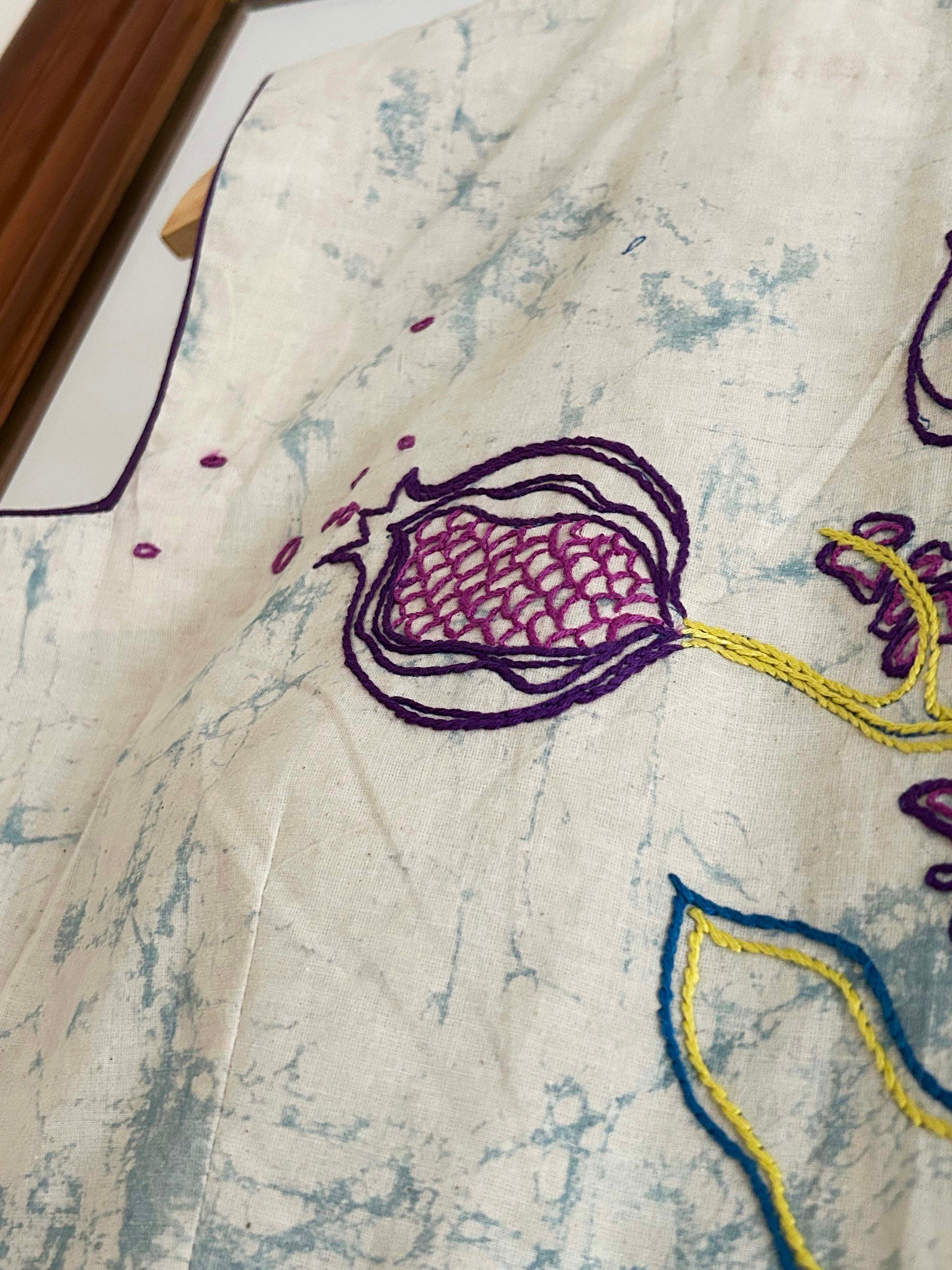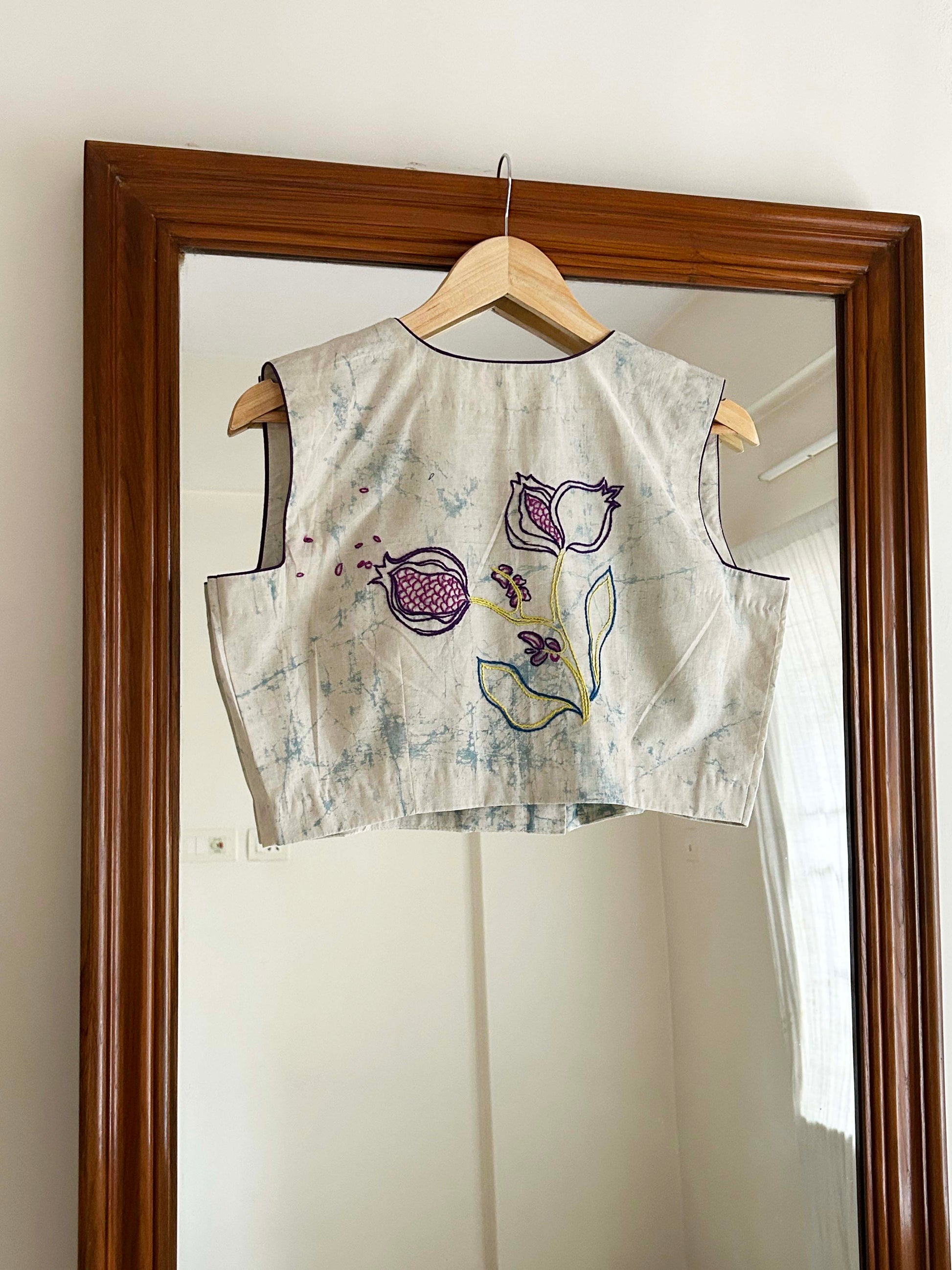 Our playful blouse comes in a tone of BLUE shade with embroidery of Anar at the back and piping in the front, the piece is accentuated with a soft gleam of glamour.