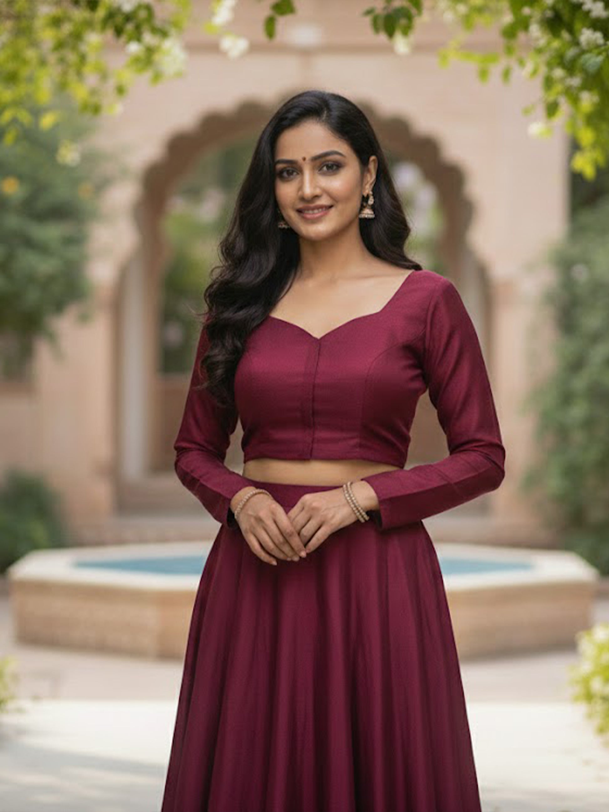 A fine silk blouse in a beautiful tone of red that features a beautiful sweetheart neck.