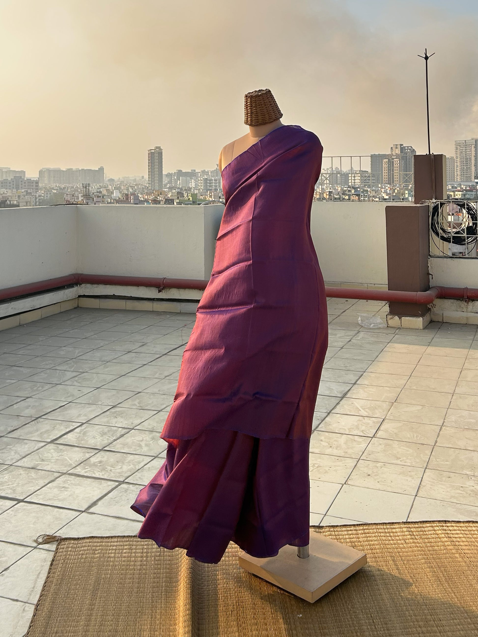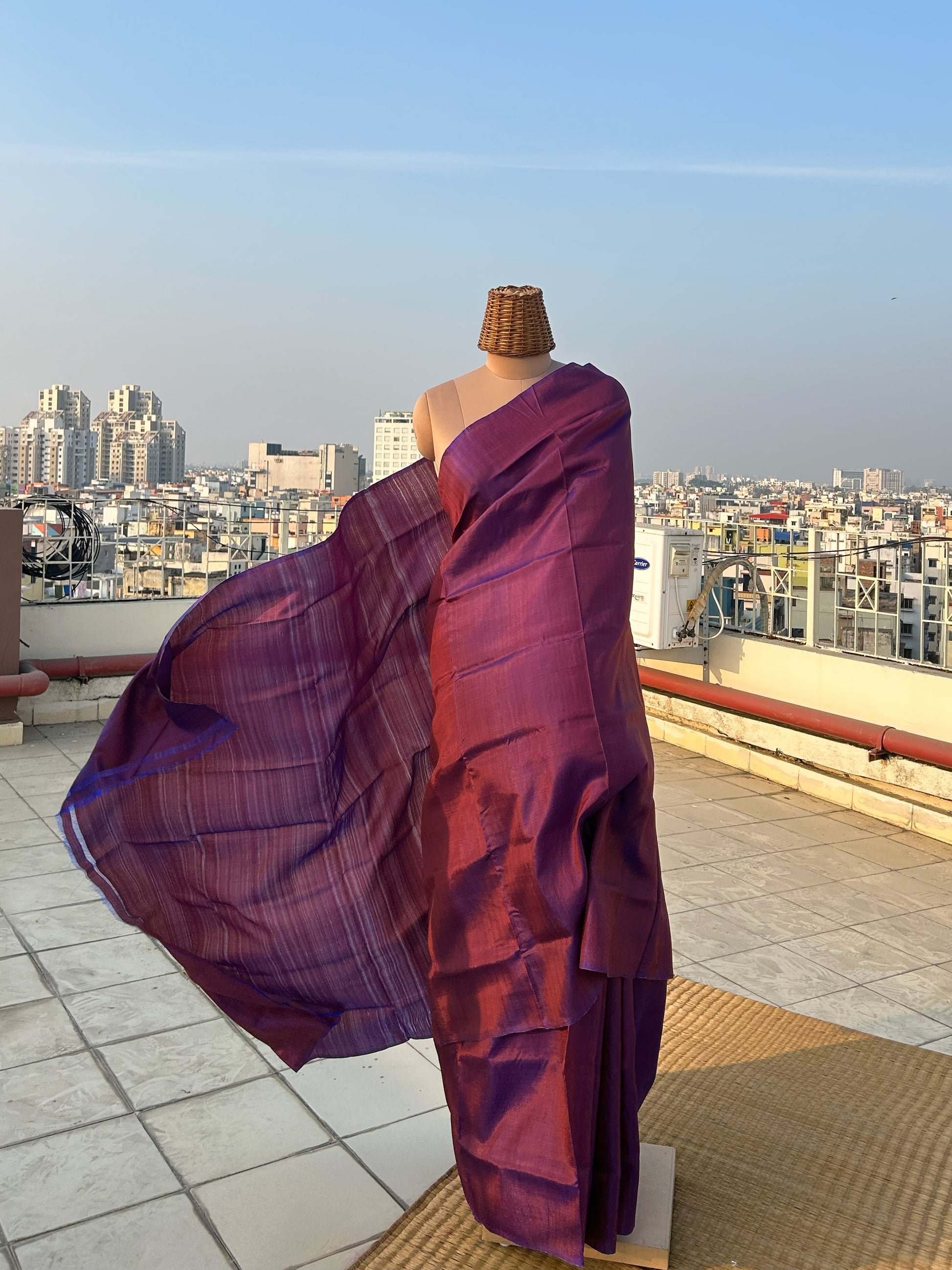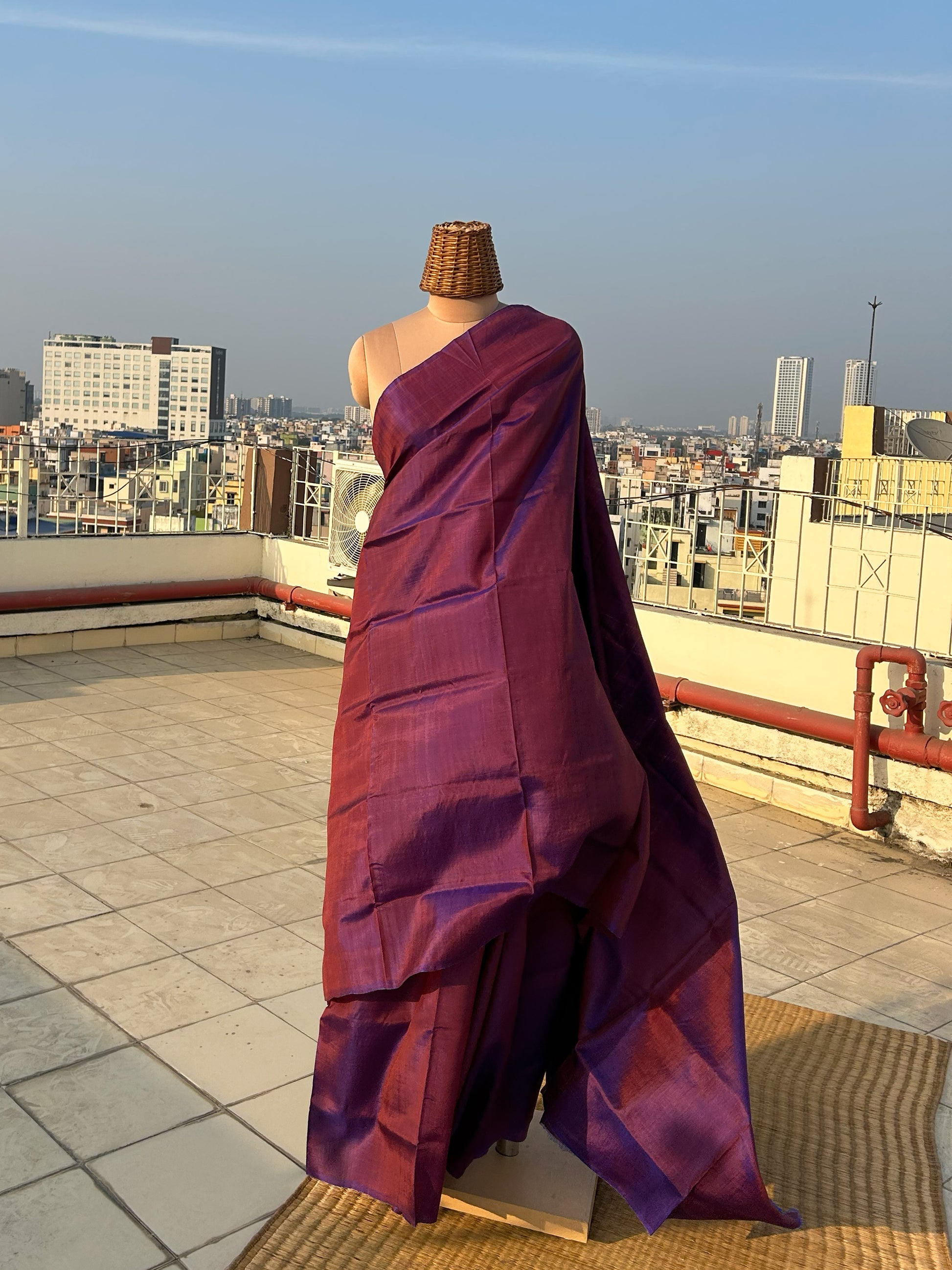 5.5 meters of mulberry silk saree in berry purple colour that comes with a matching silk blouse piece. Please note that there may be slight variations in colour since each of our pieces are handcrafted.