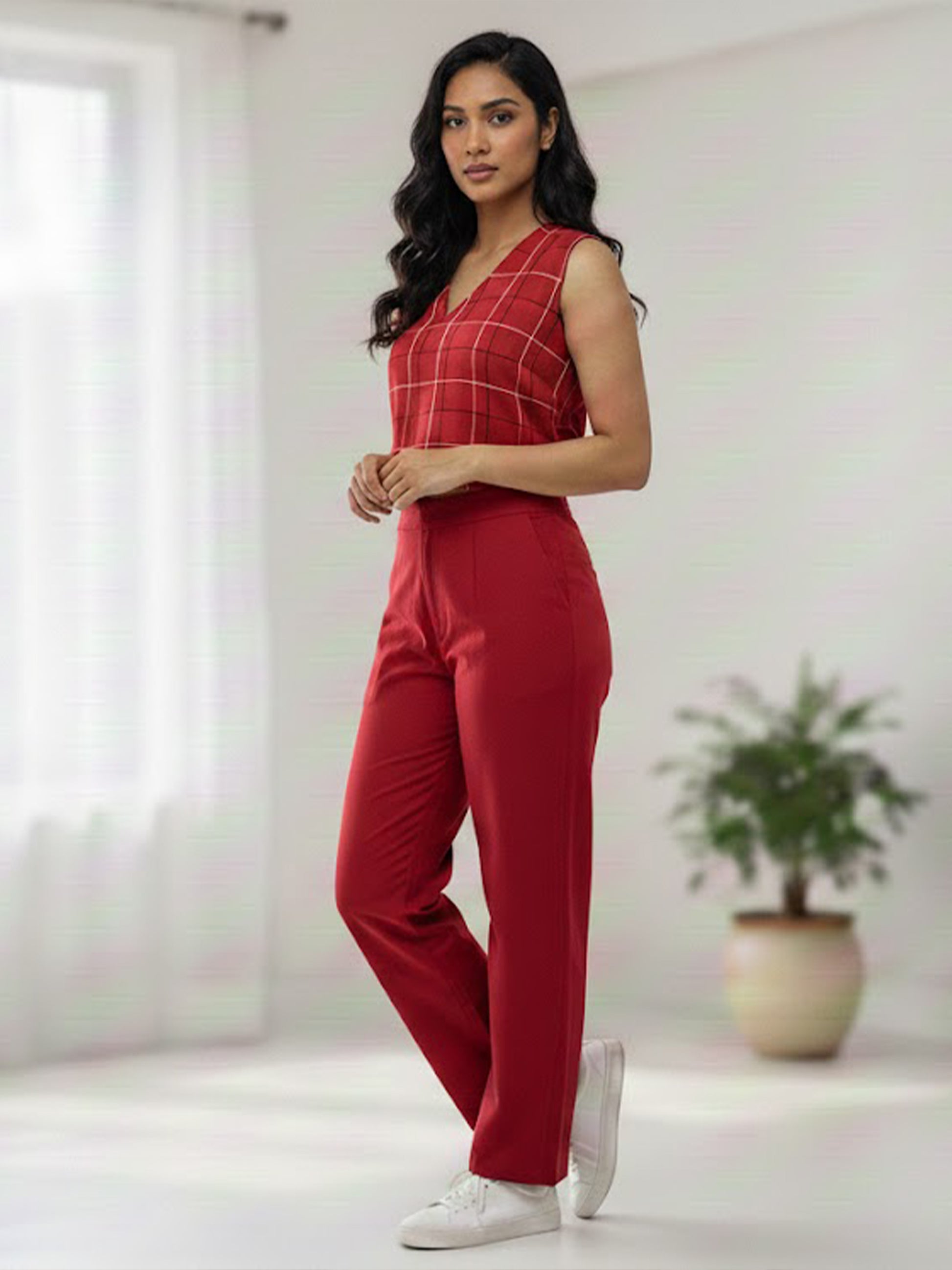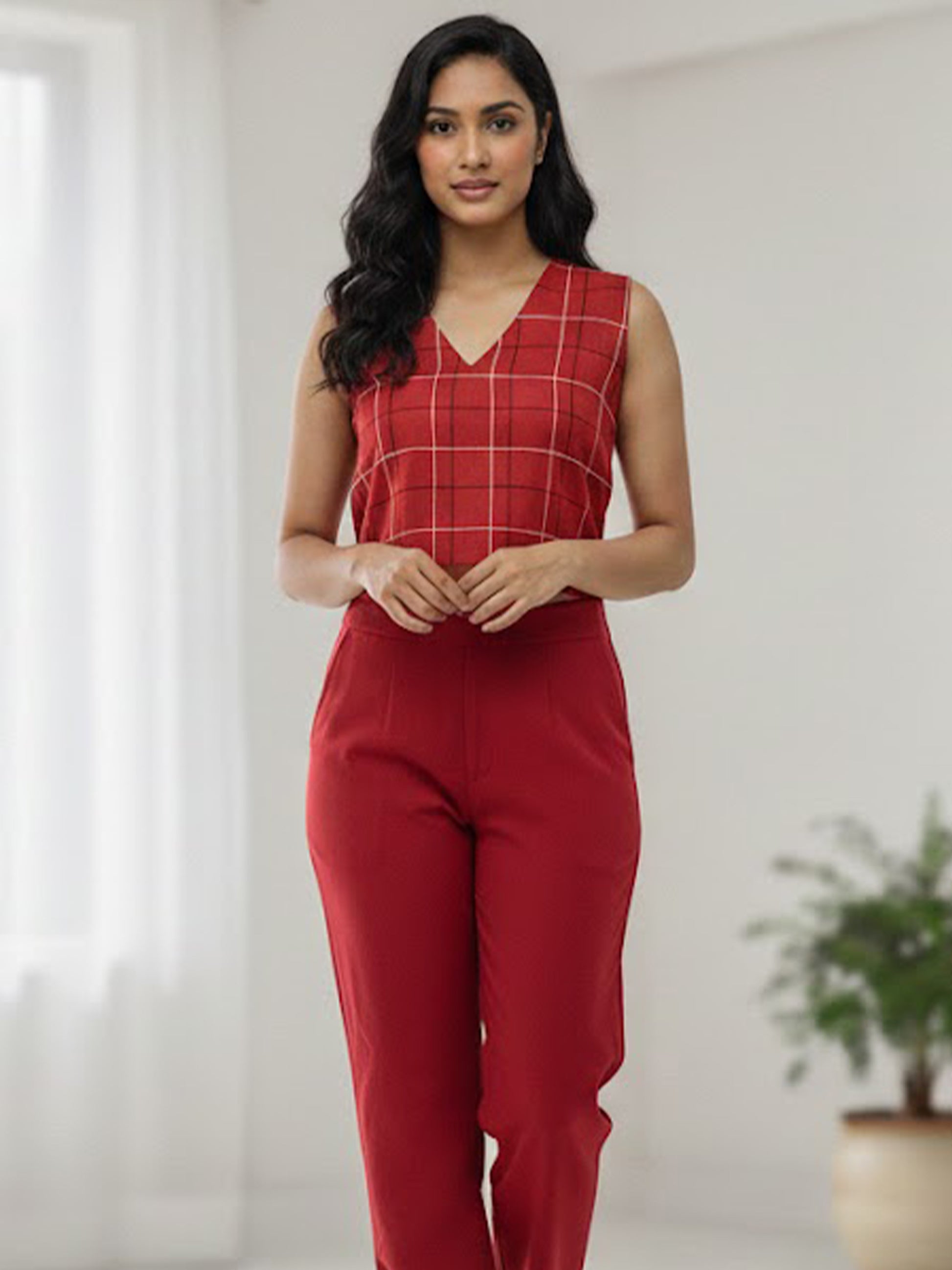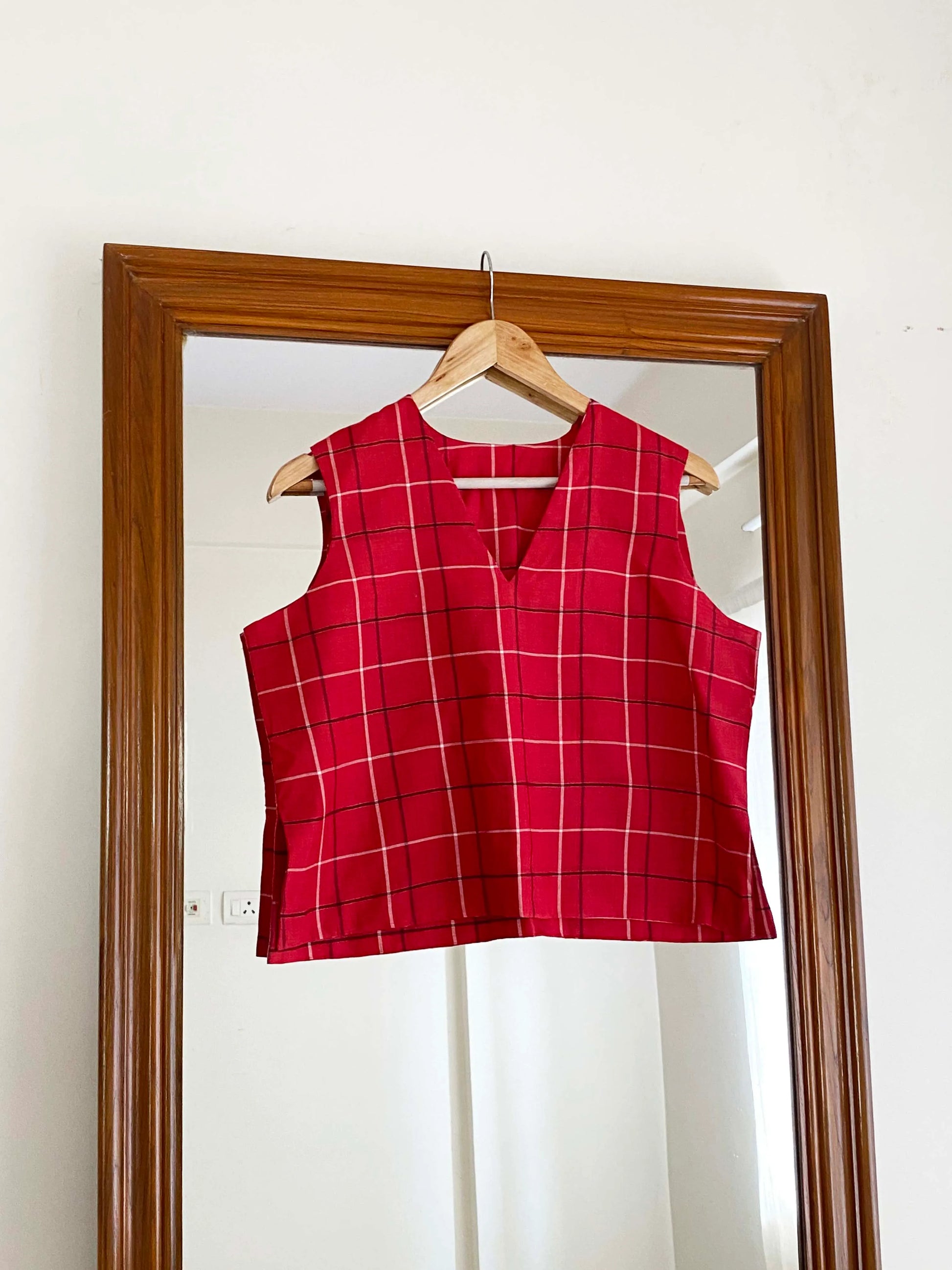 The top in a gorgeous shade of ruby red with fine stripes of ox blood and white is handwoven in fine tussar and handspun khadi.