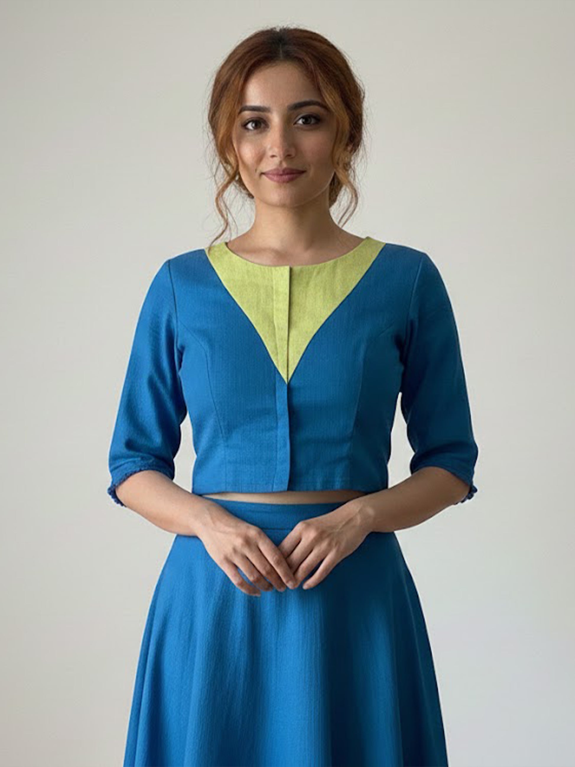 Our blouse features a silhouette in color blocking style of blue and lime green checks, with a V neckline and raw edges at the sleeves.
