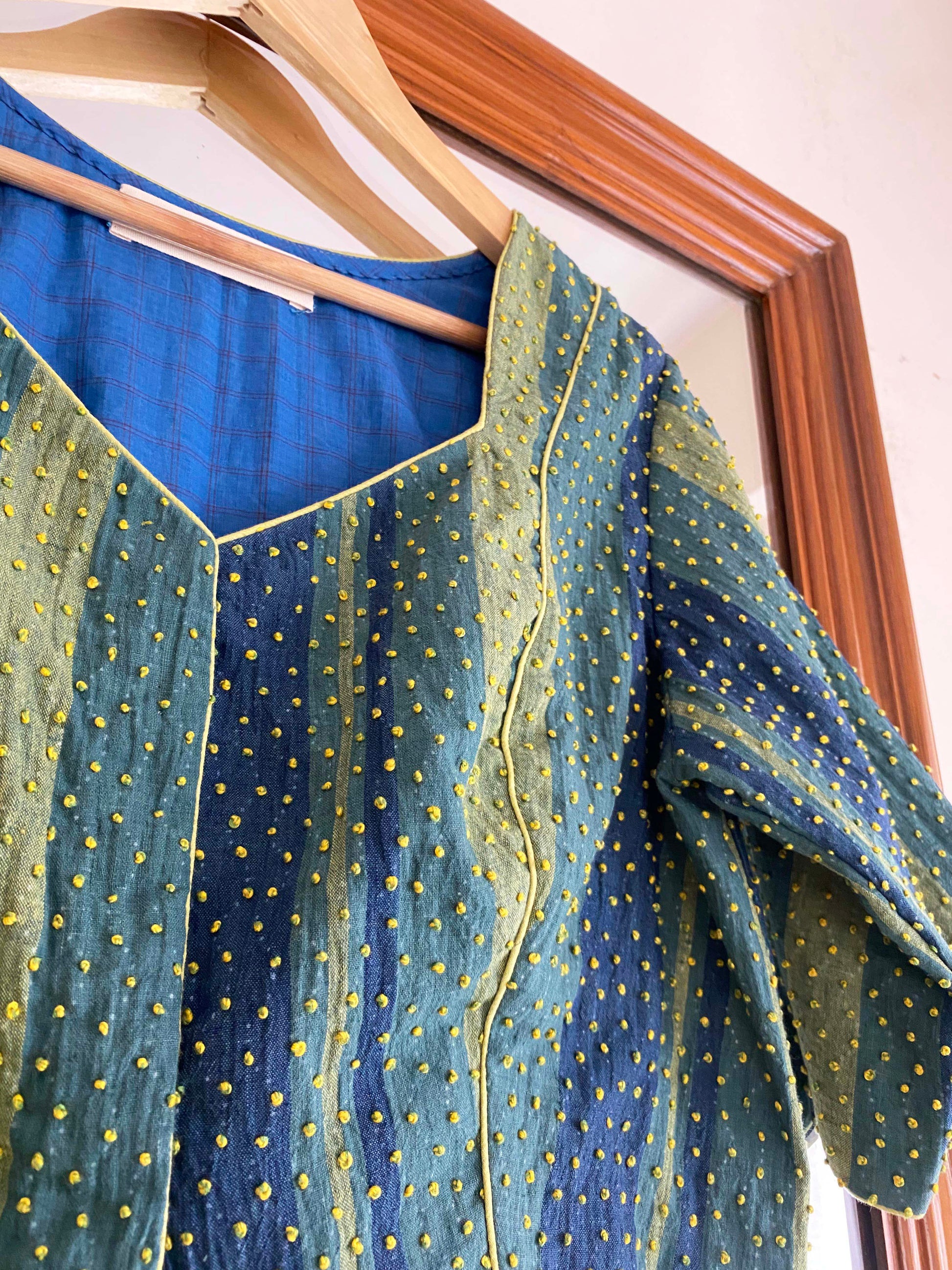 An green stripe cotton blouse with meticulous French knot work all over, accentuated by a yellow piping is a luxurious and playful piece perfect for special occasions.