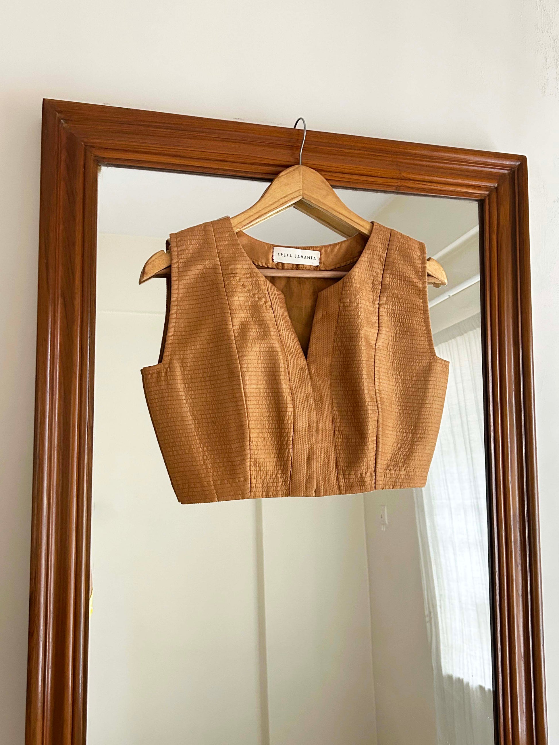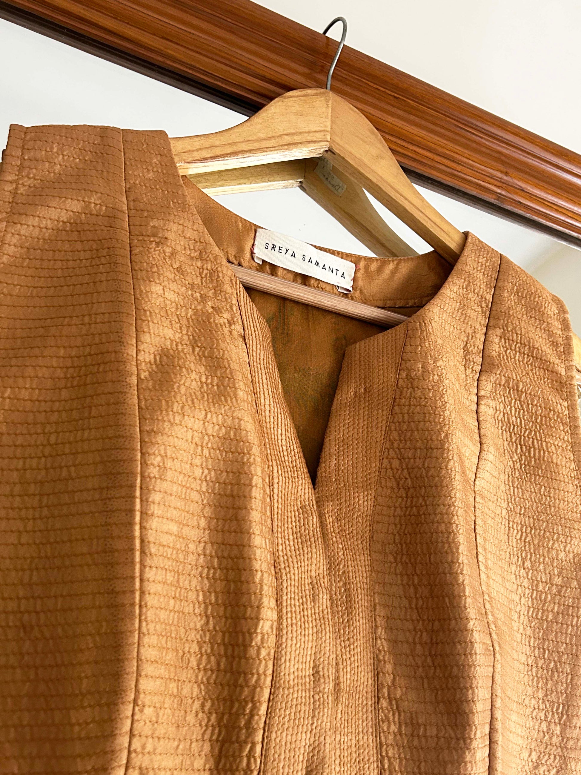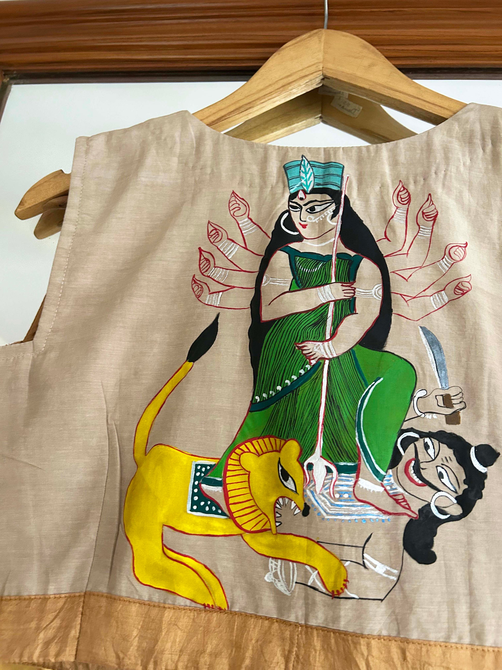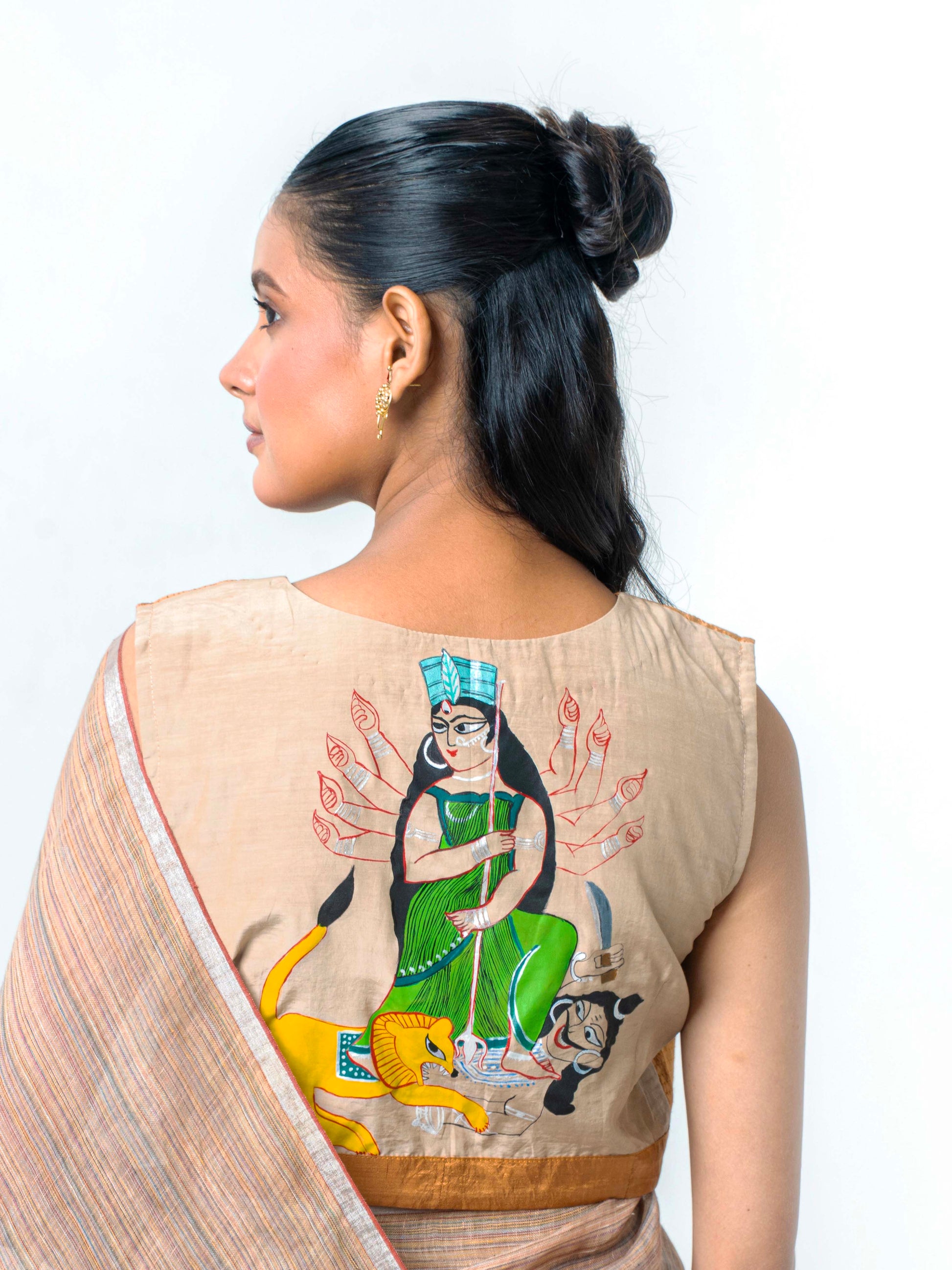 Our hand painted blouse comes in a golden bronze shade with hand painting of Durga at the back and quilted pure silk on the front.