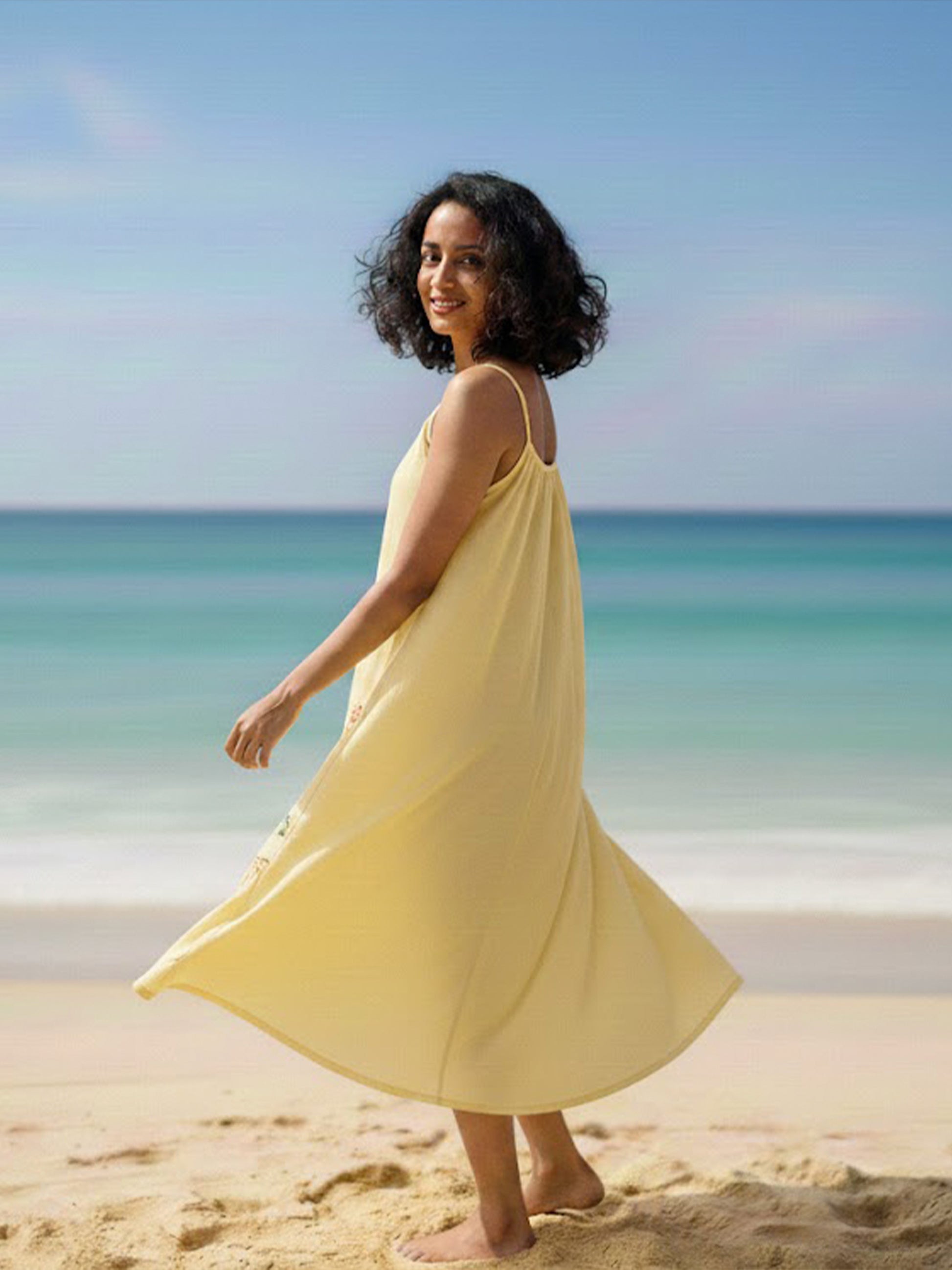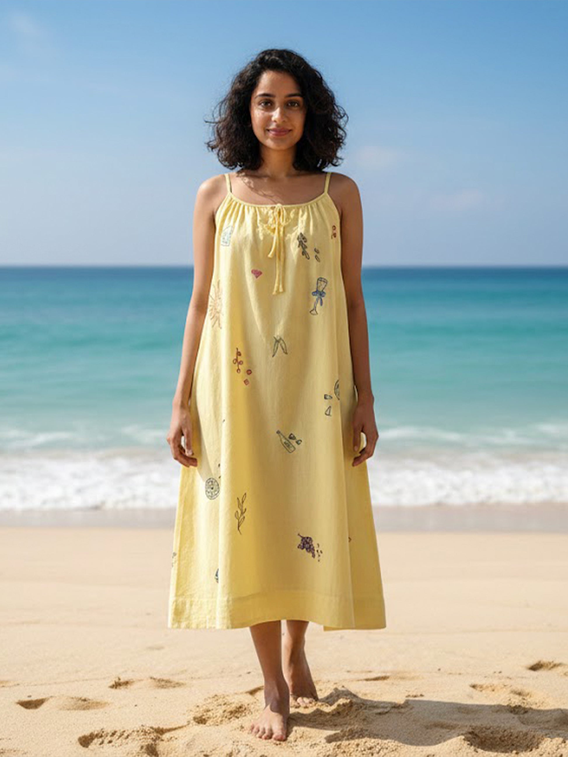 A dress that carries vacation’s playful spirit, embroidered with memories you’d never want to leave behind. The dress fits upto bust size 42"