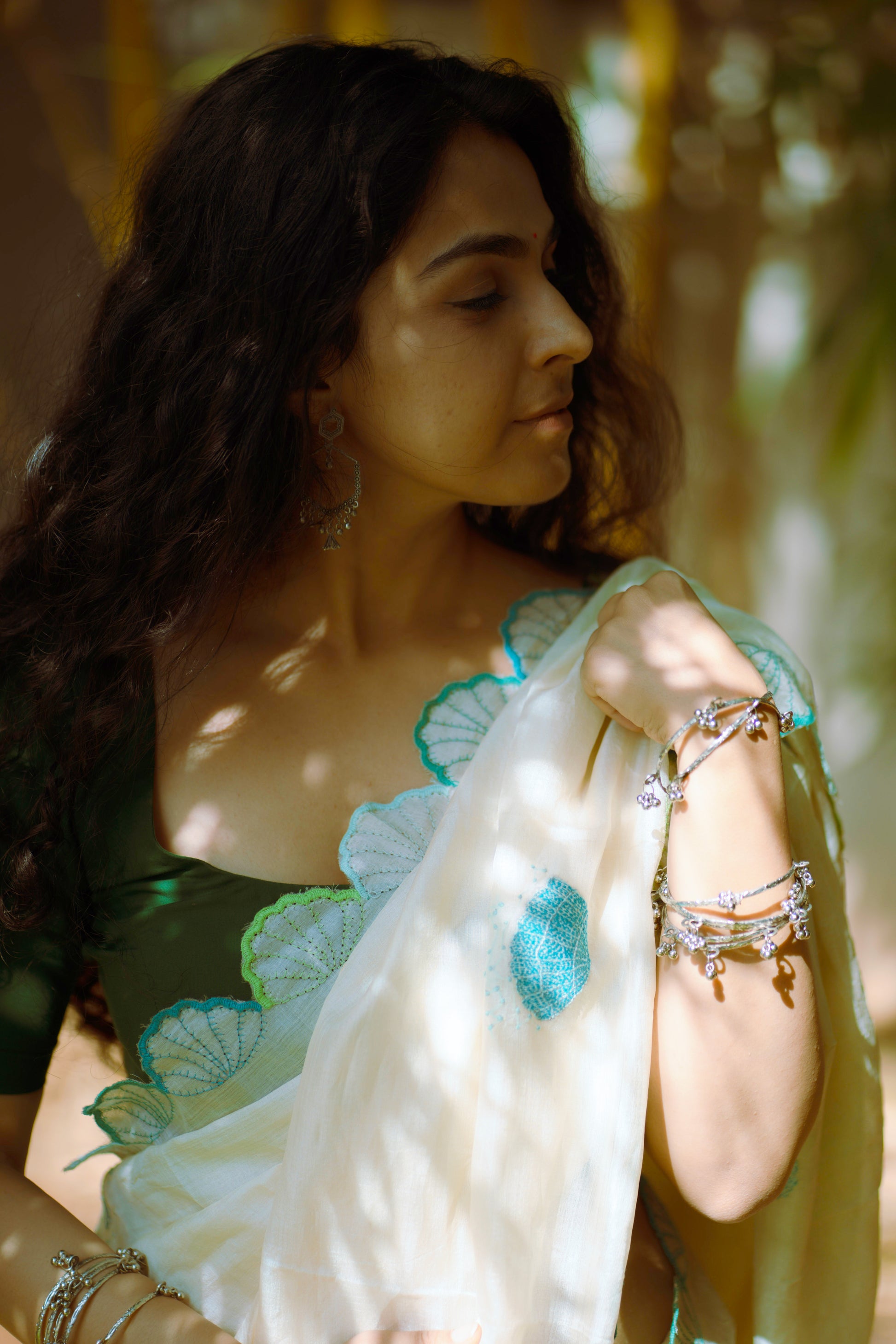 Embrace the charm of the ocean with this exquisite tussar silk saree, featuring intricate sea shell motifs and hand-embroidered scalloped borders all done using the technique of chikankari. A graceful blend of luxury and simplicity, perfect for any occasion. 🐚✨
