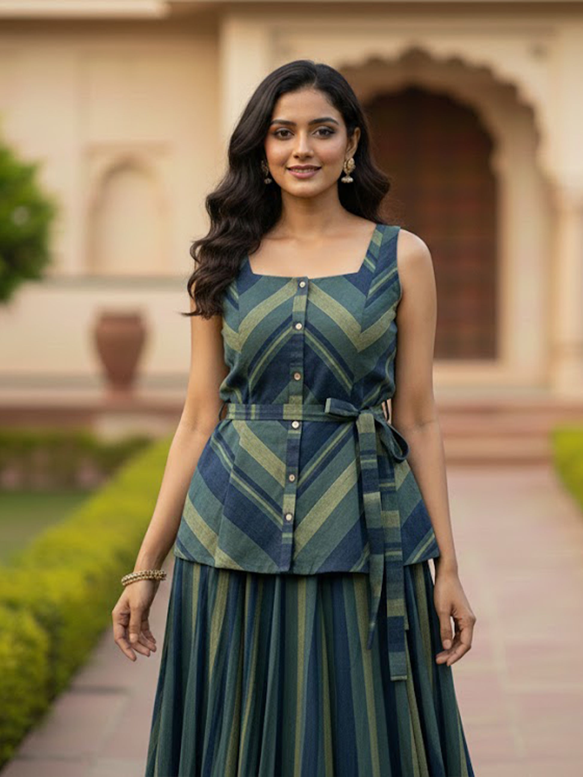 Our blouse features a beautiful pattern of stripes with fitting at the top and gradually flaring up towards the bottom .