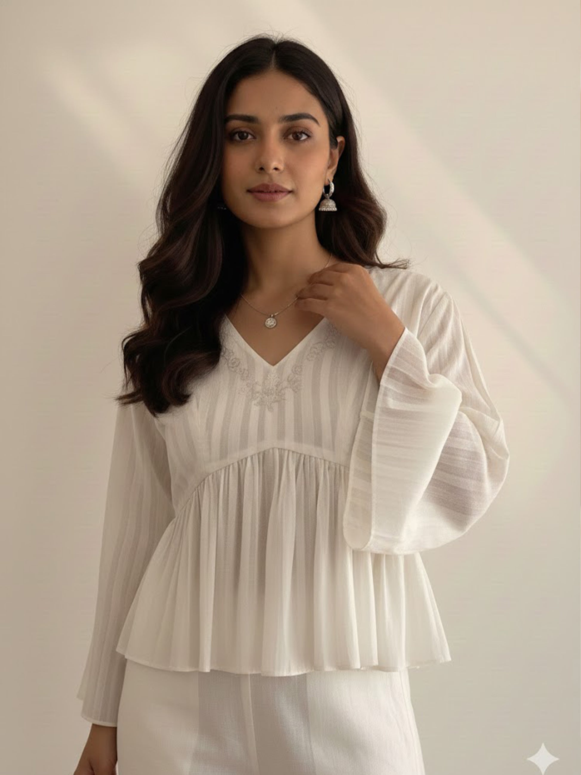 Intricacy meets comfort with our 'Julia' peplum top in Khadi muslin. Handwoven in an ivory hue with a striped pattern and enhanced with white on white, intricate Chikankari embroidered V-neckline and three-quartered sleeves - this pieces is one of it's own kind.