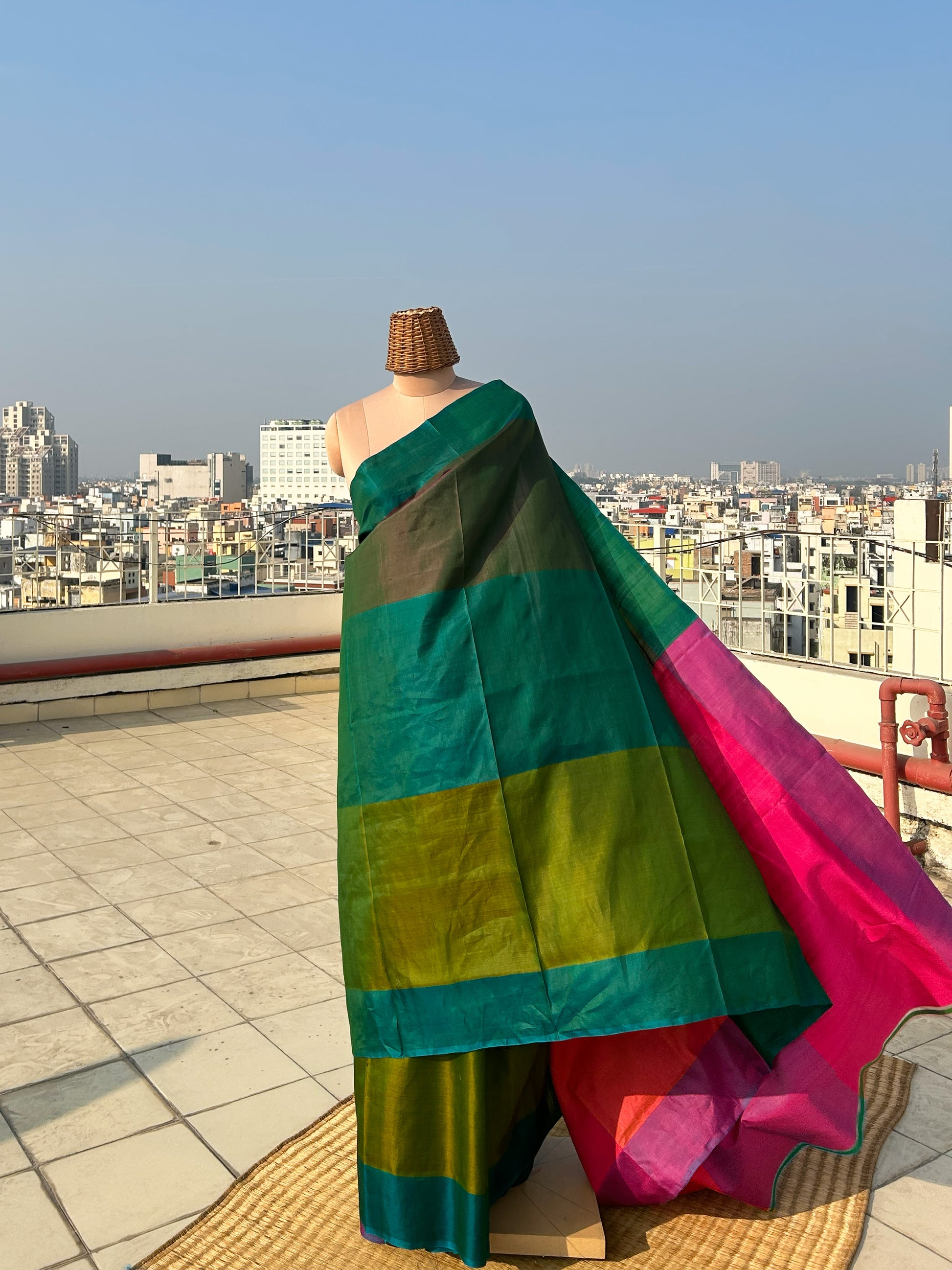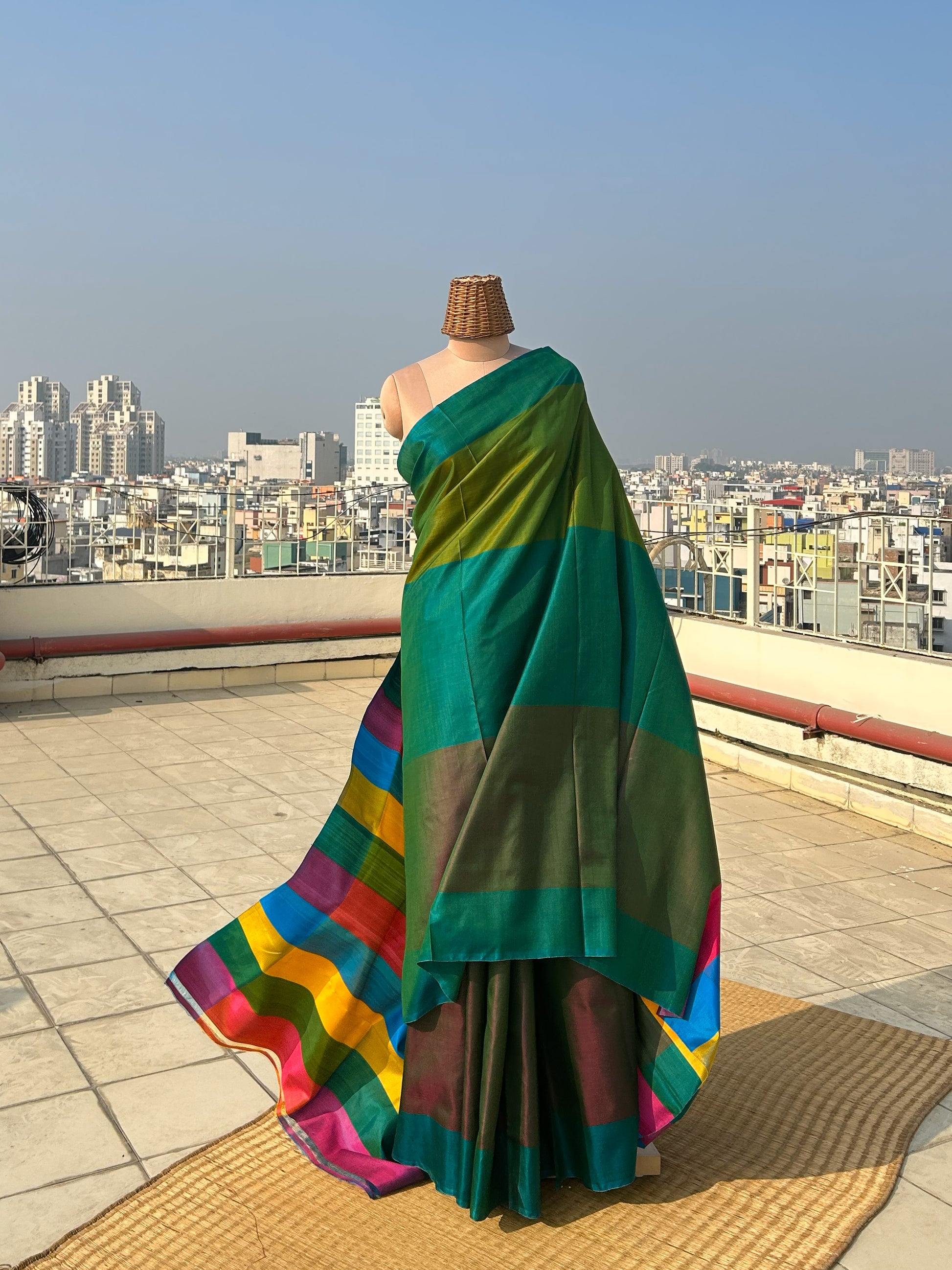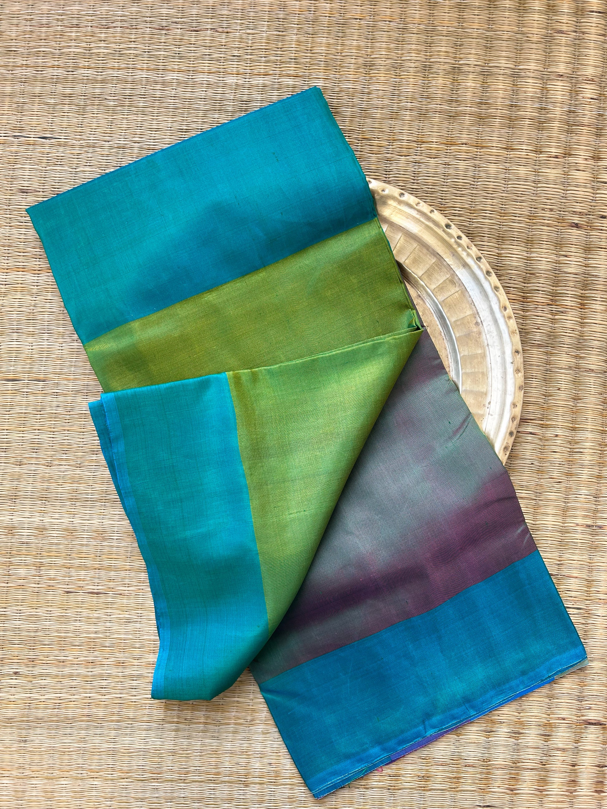 5.5 meters of mulberry silk saree in shades of green. It is a reversible saree where you may wear any of the side as pallu and make the other side as blouse. Please note that there may be slight variations in colour since each of our pieces are handcrafted.