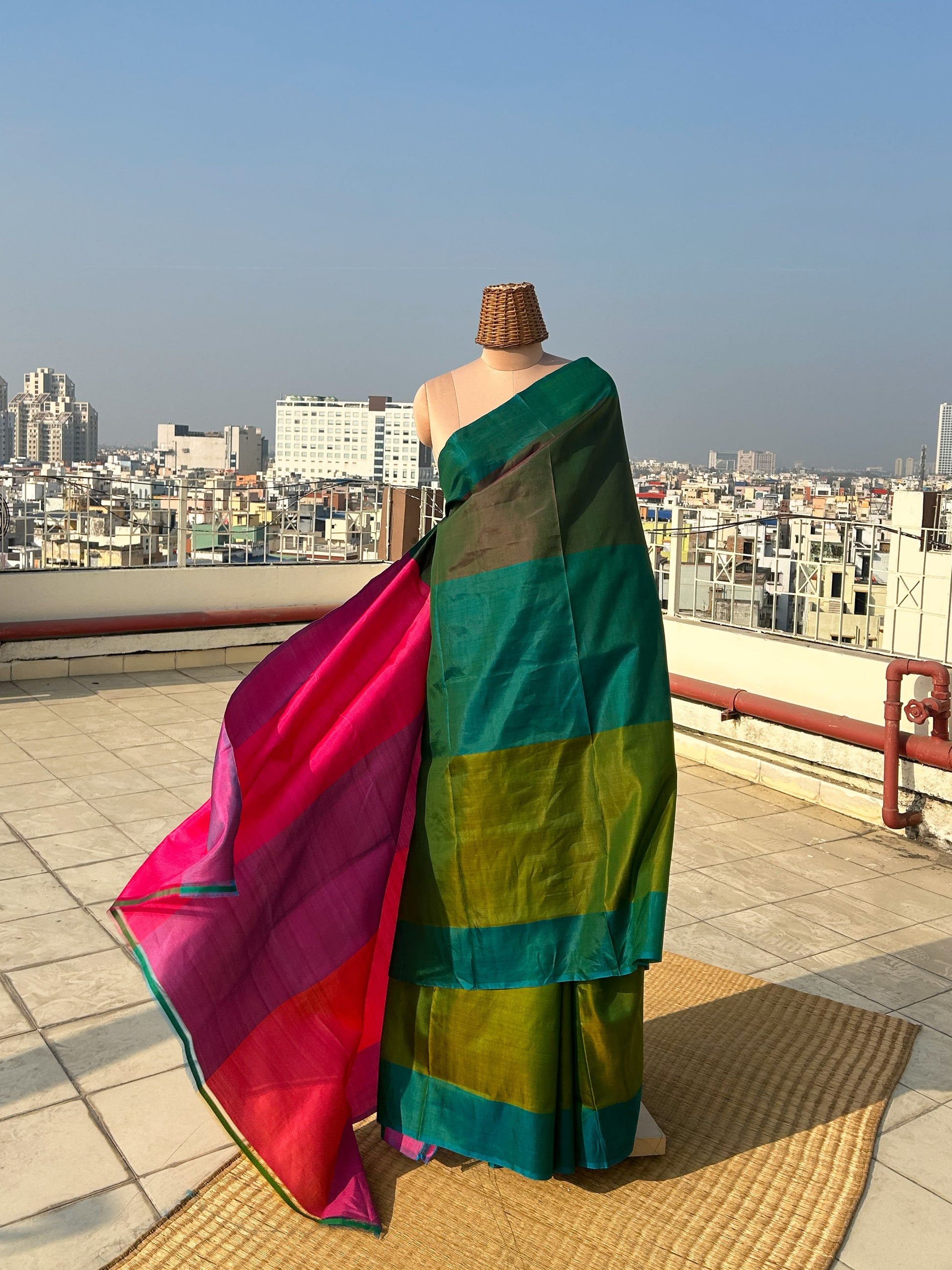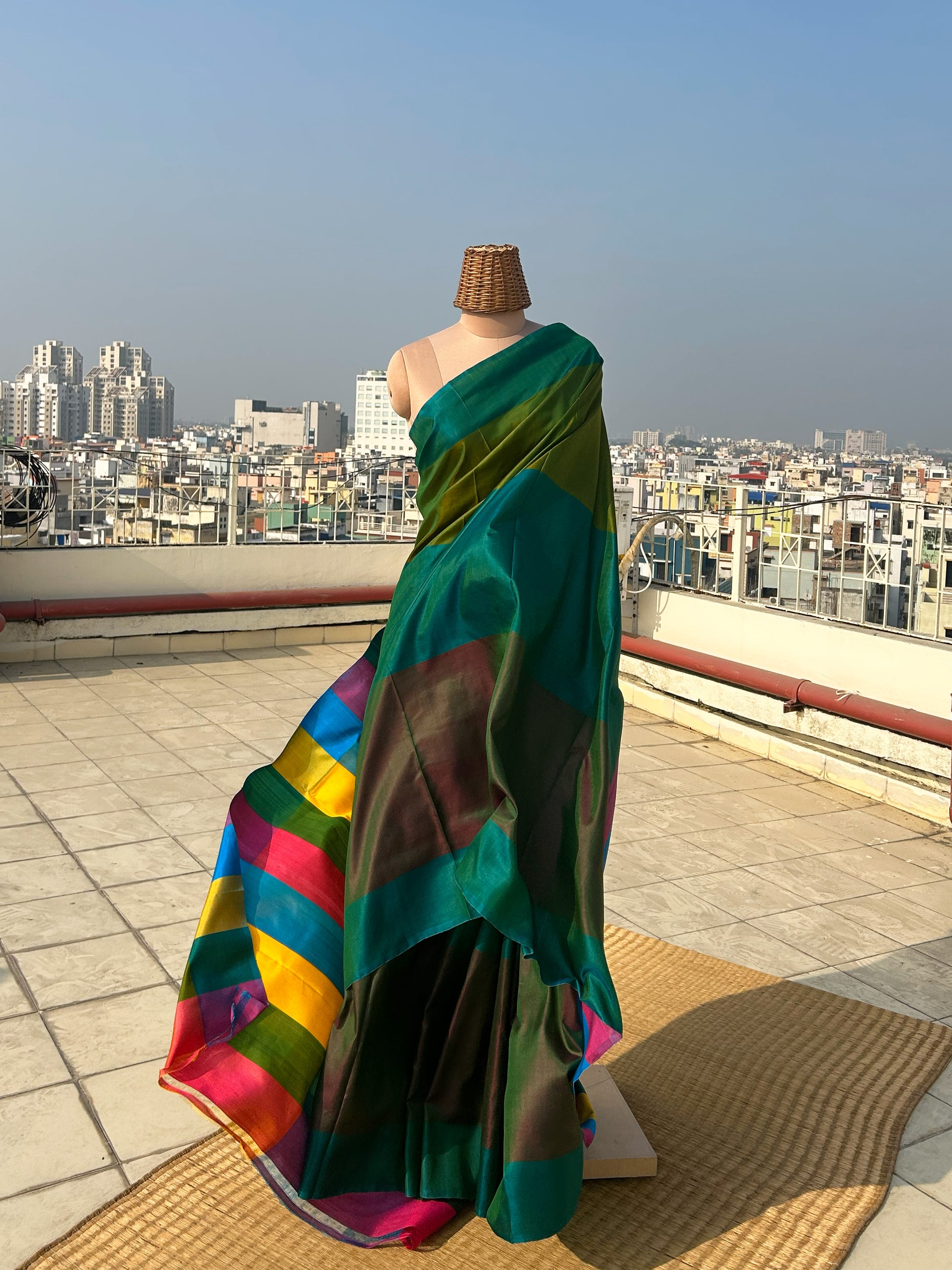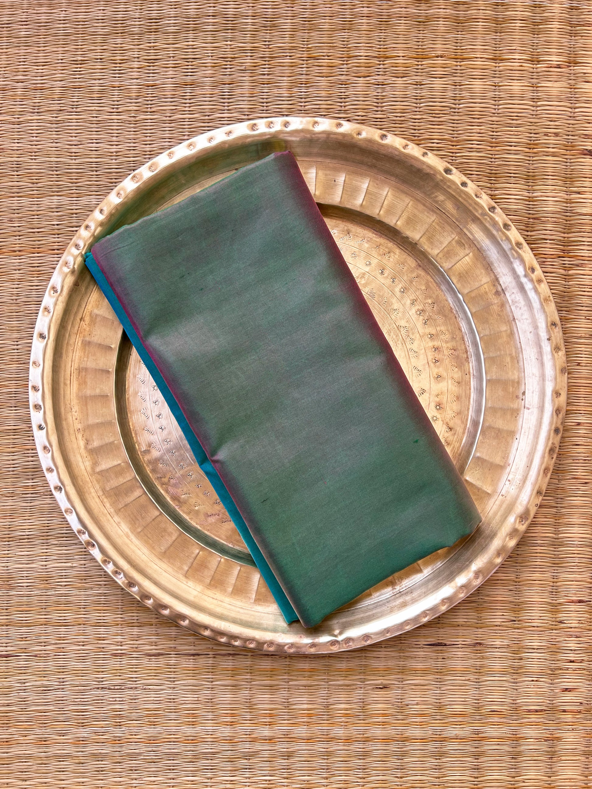 5.5 meters of mulberry silk saree in shades of green. It is a reversible saree where you may wear any of the side as pallu and make the other side as blouse. Please note that there may be slight variations in colour since each of our pieces are handcrafted.