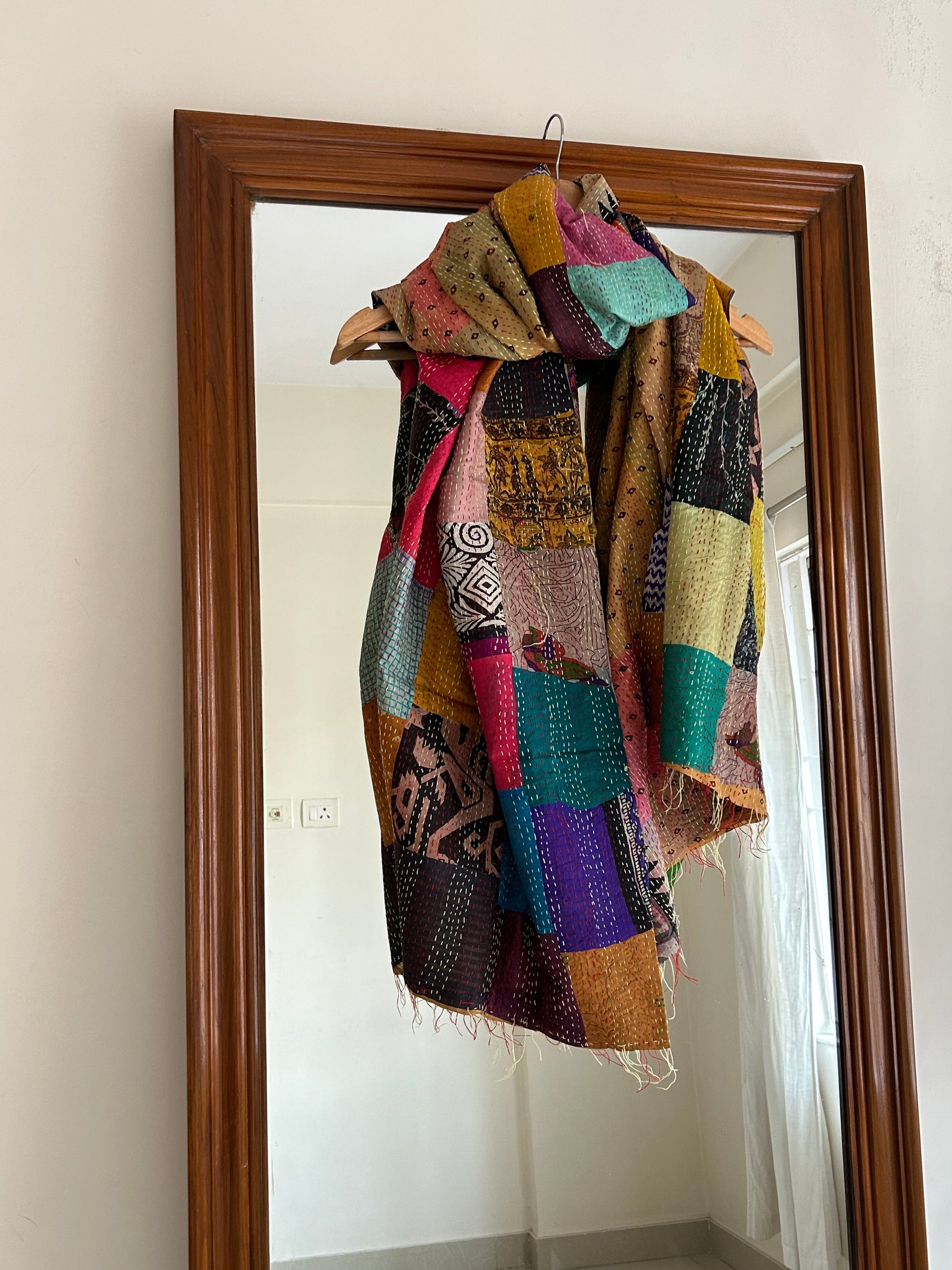 Crafted from recycled silk sarees, this kantha patchwork scarf features vibrant multicolor patches on one side and a solid hue on the other. Intricate kantha stitching runs throughout, making it a unique and sustainable addition to your collection.