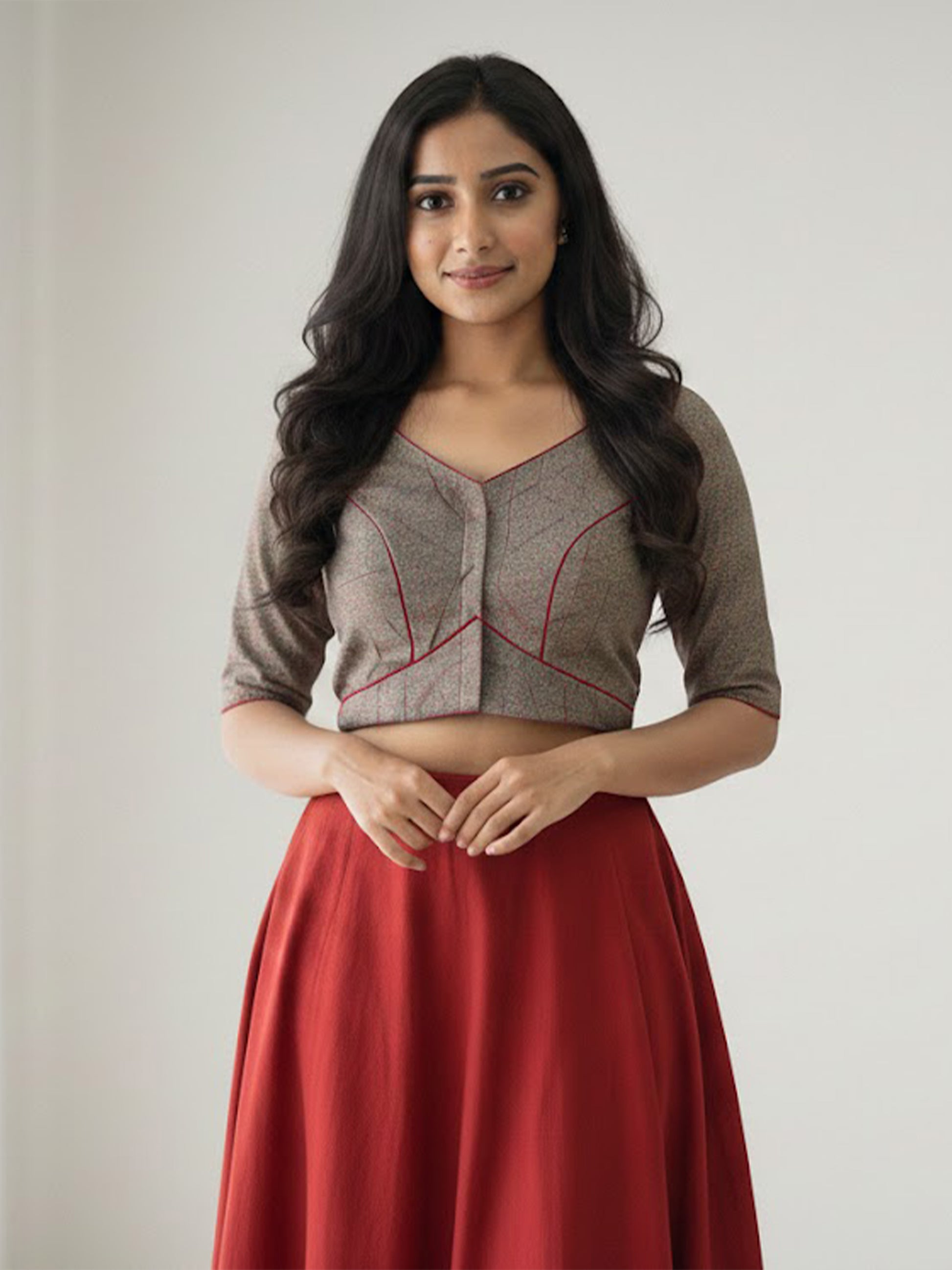 A Kantha silk blouse made out of recycled silk sarees using hand stitched kantha work. With kantha embroidery on the front and back along with a deep V neckline , this piece is the epitome of ease and understated luxe.