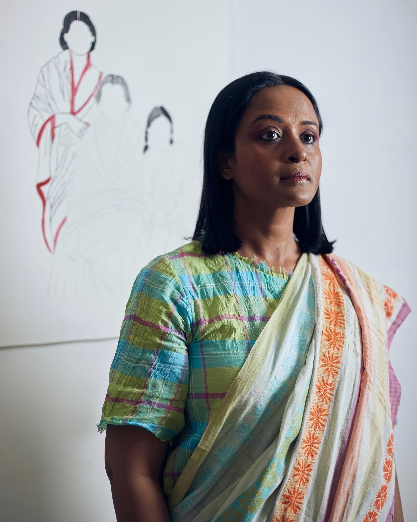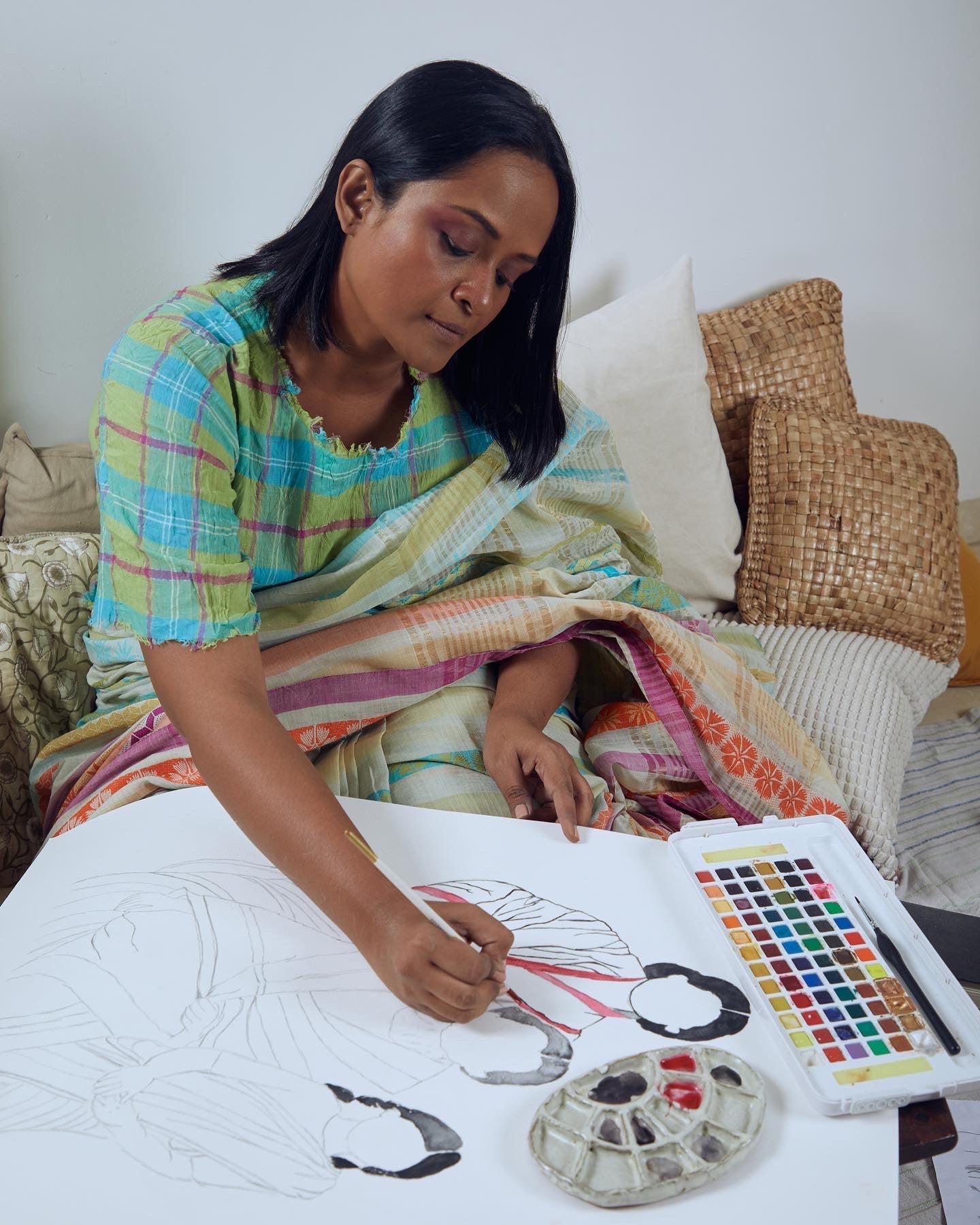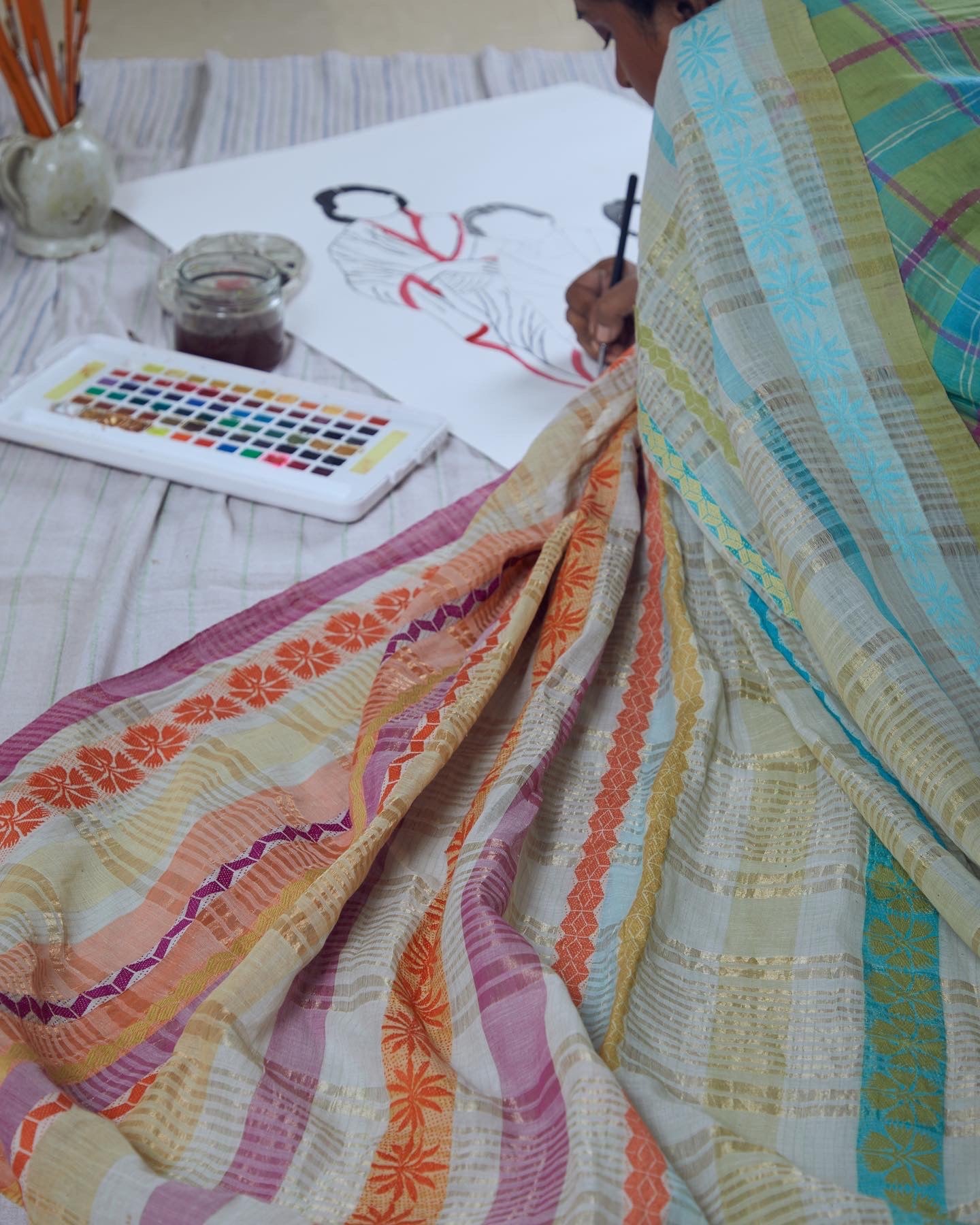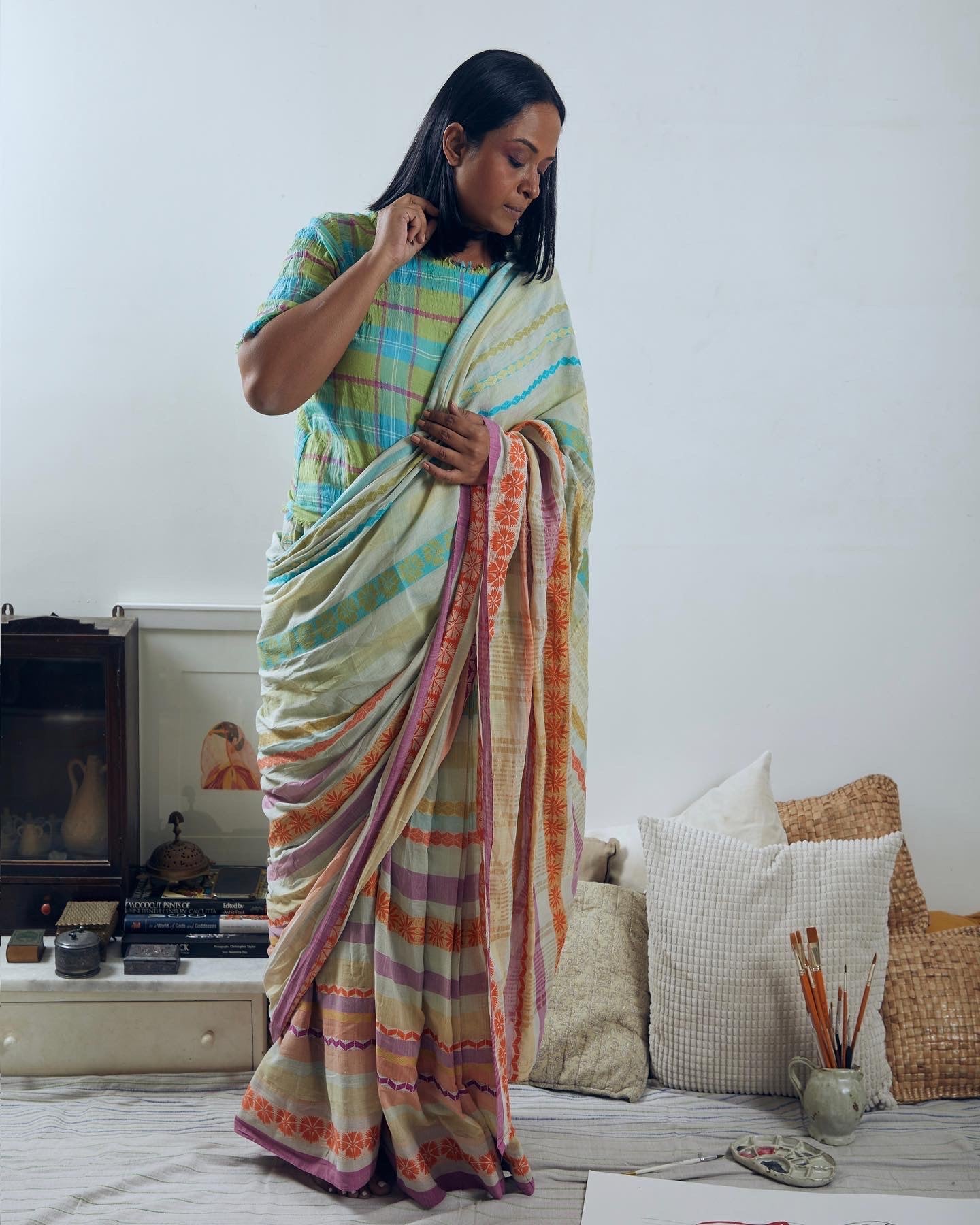 Our 'Leila' saree is our modern take on the traditional Tant of Bengal with handwoven motifs inspired by the coastline of South India with its swaying palm trees, mixed with an array of geometric motifs in colours ranging from subtle to pop. Thin zari stripes all along the pallu add a touch of gleam to this playful interpretation of the Tant saree.