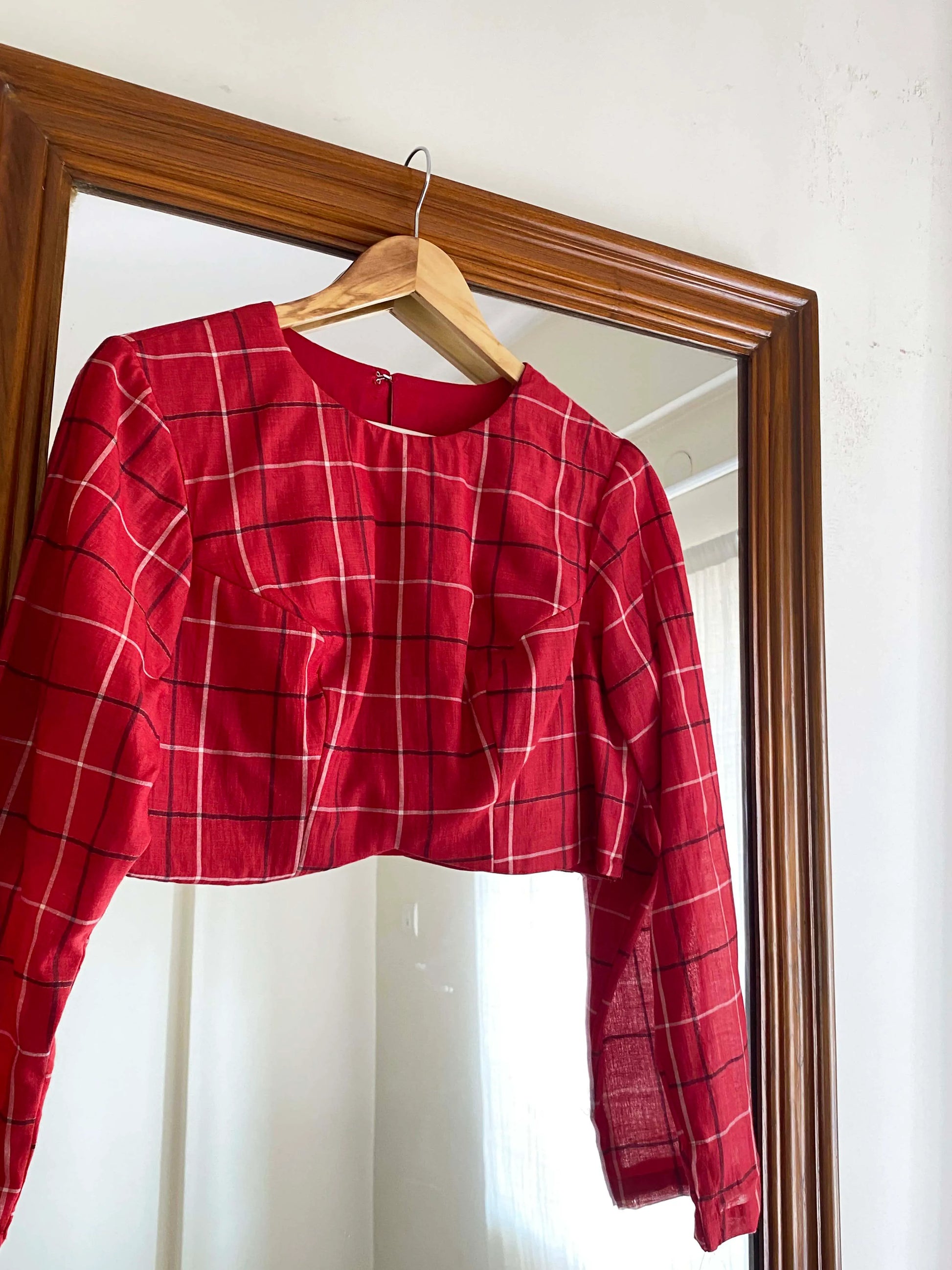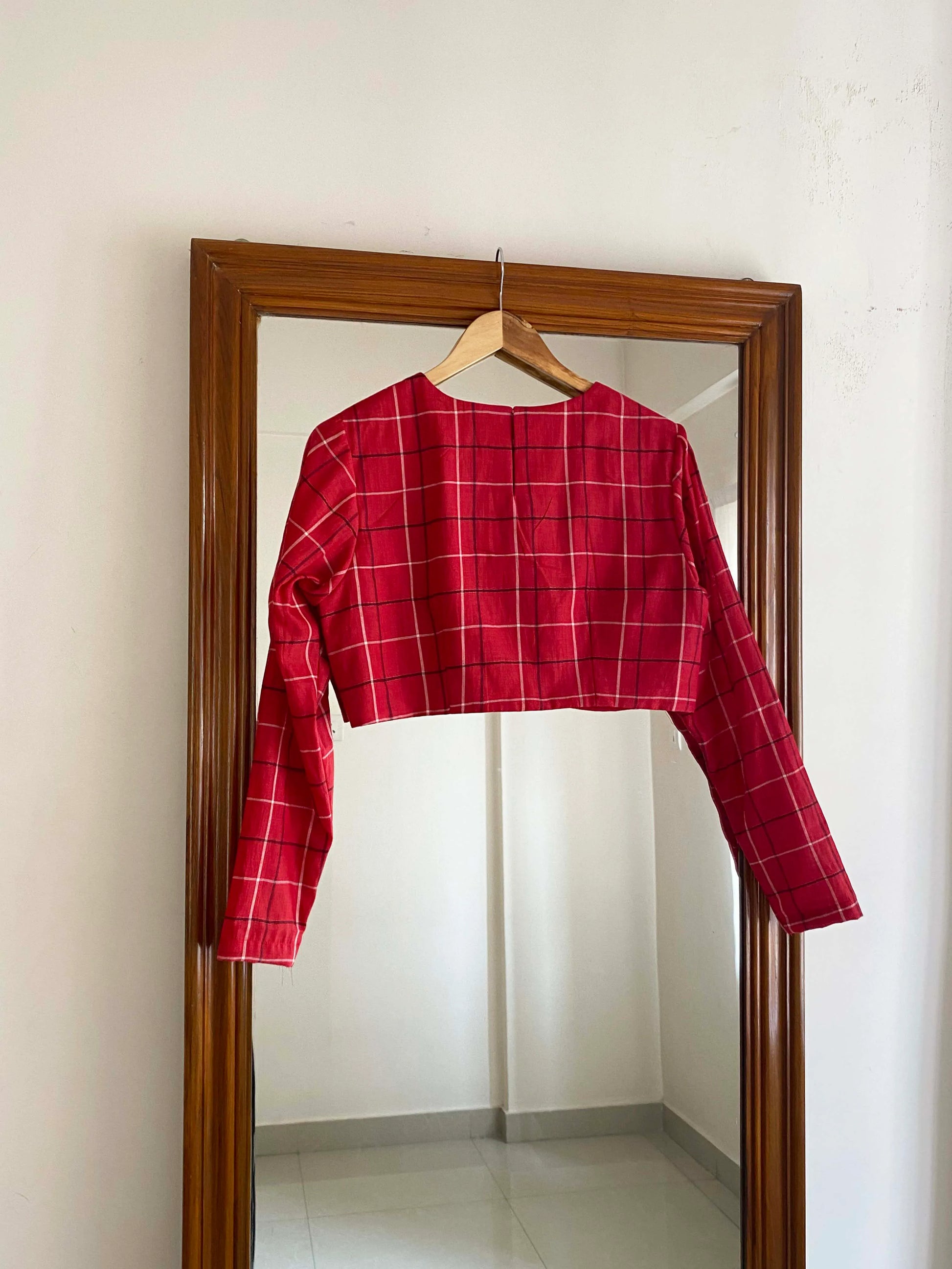 A gorgeous shade of ruby red with fine stripes of ox blood and white is handwoven in fine tussar and handspun khadi.