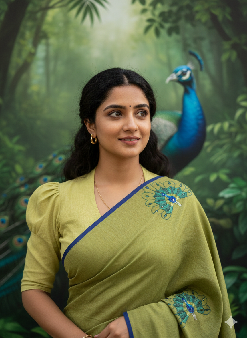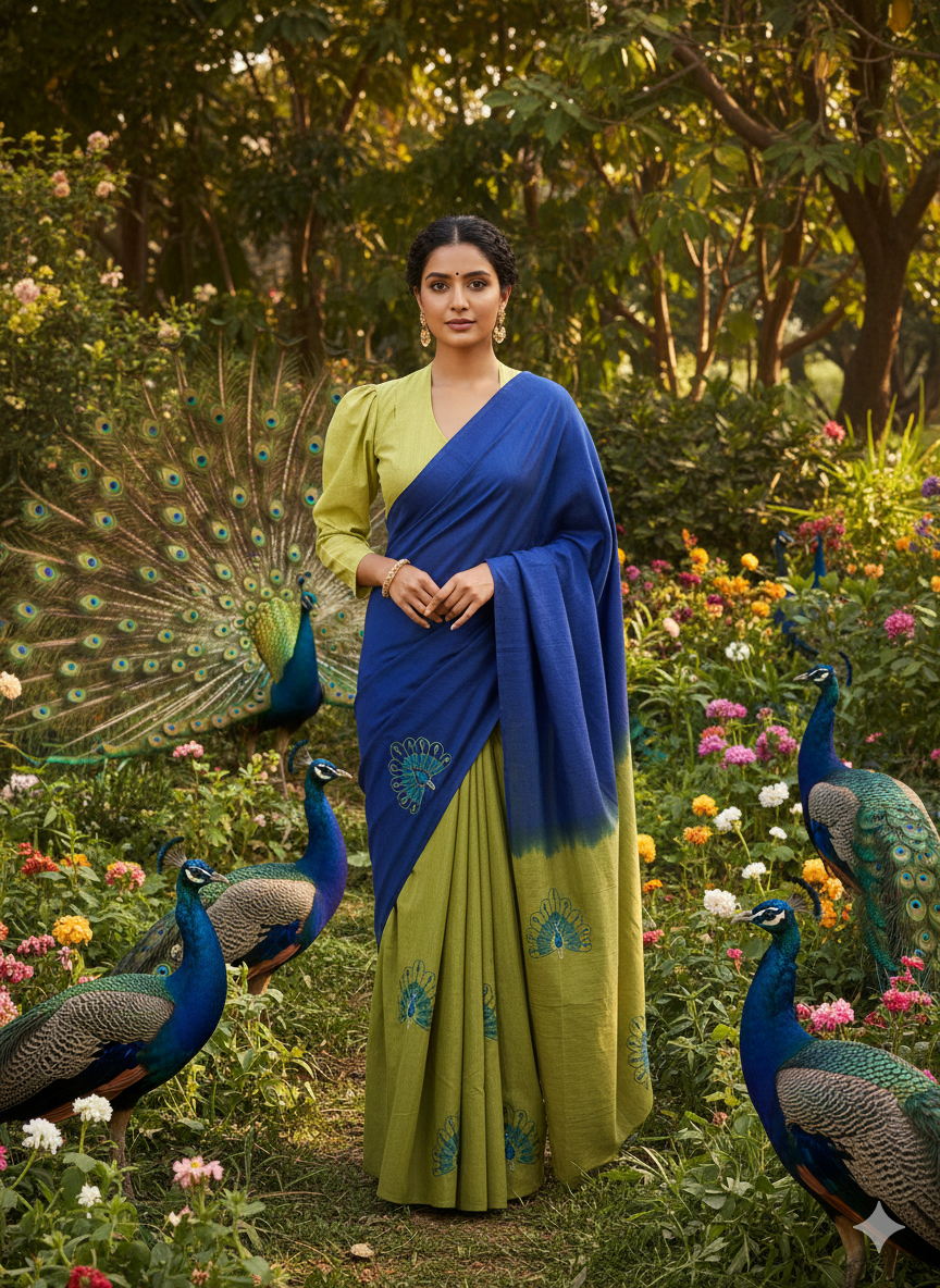 An ode to nature's wonder, our Mayur saree is handwoven in fine muslin khadi and hand dyed in dual shade or navy and green - colours taken from the impressive feathers of peacock themselves. Intricate kantha stitched peacock motifs all along one side of the saree makes this a very special piece.