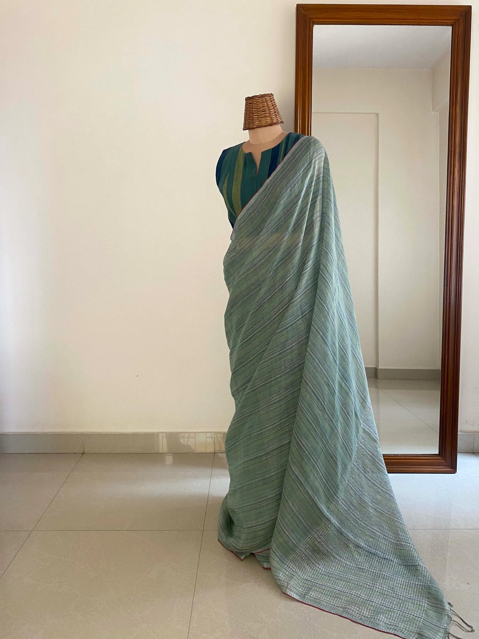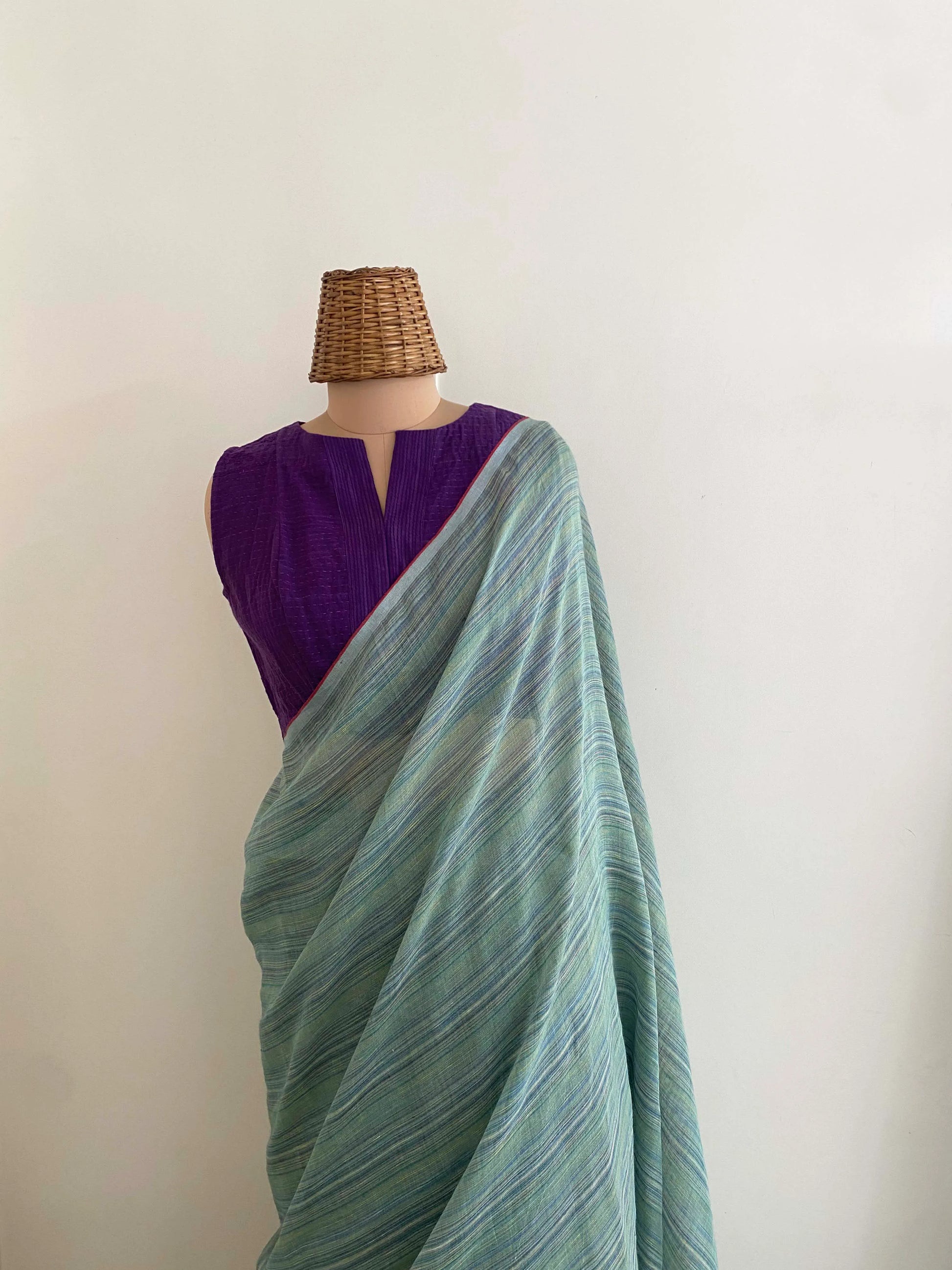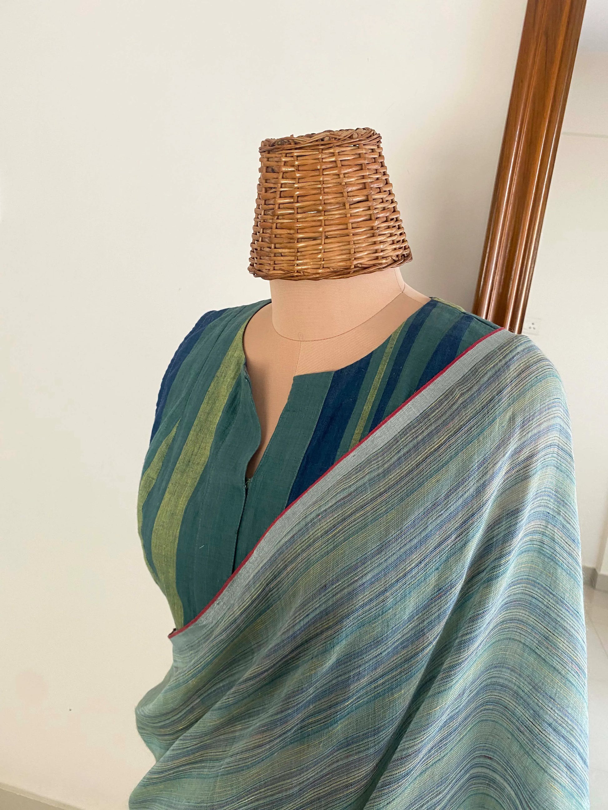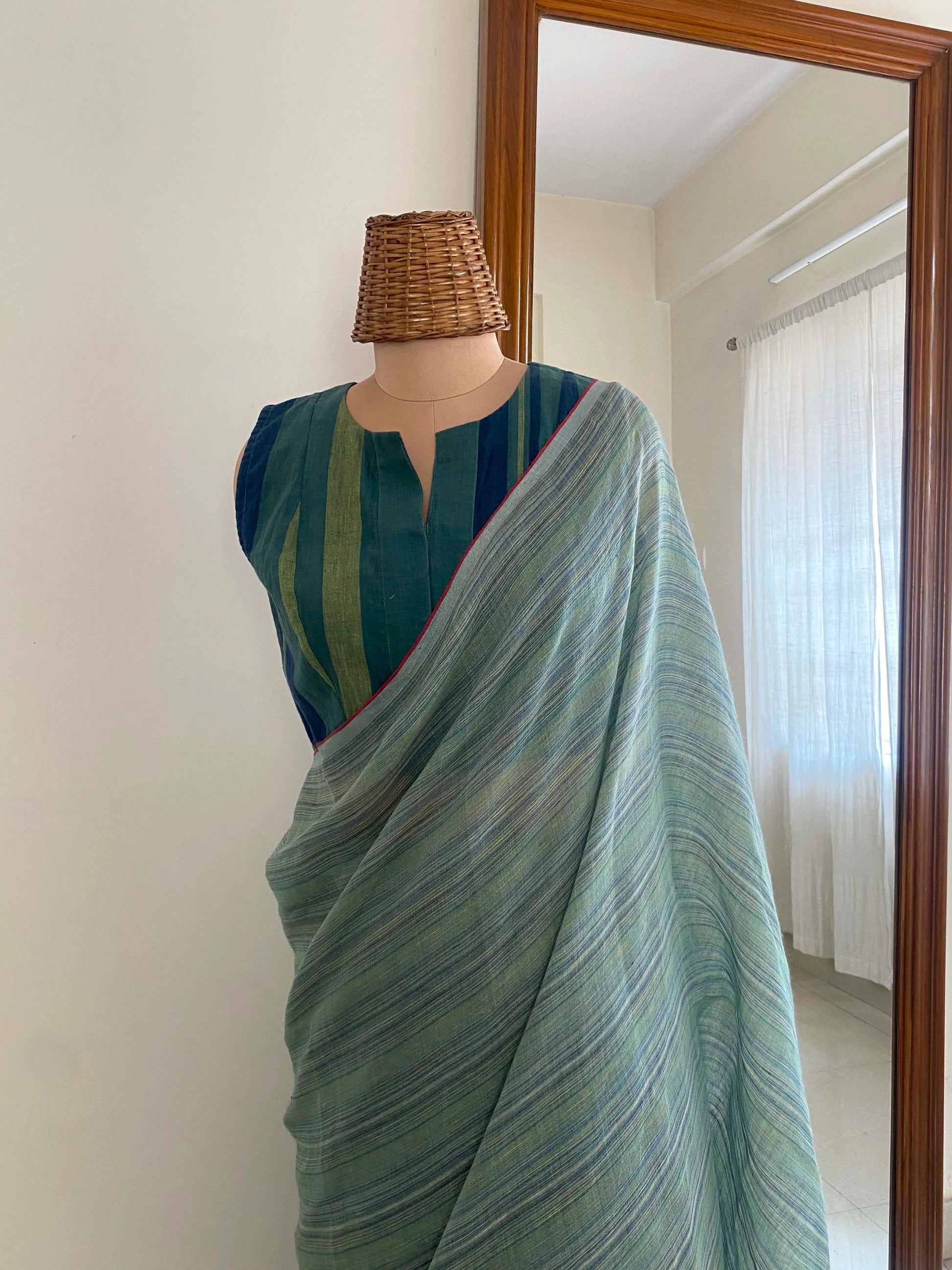 Our Recycled khadi saree in stripes of multiple hues ranging from greens to hints of yellows and blues has been handwoven using recycled yarns from all our previous collections.