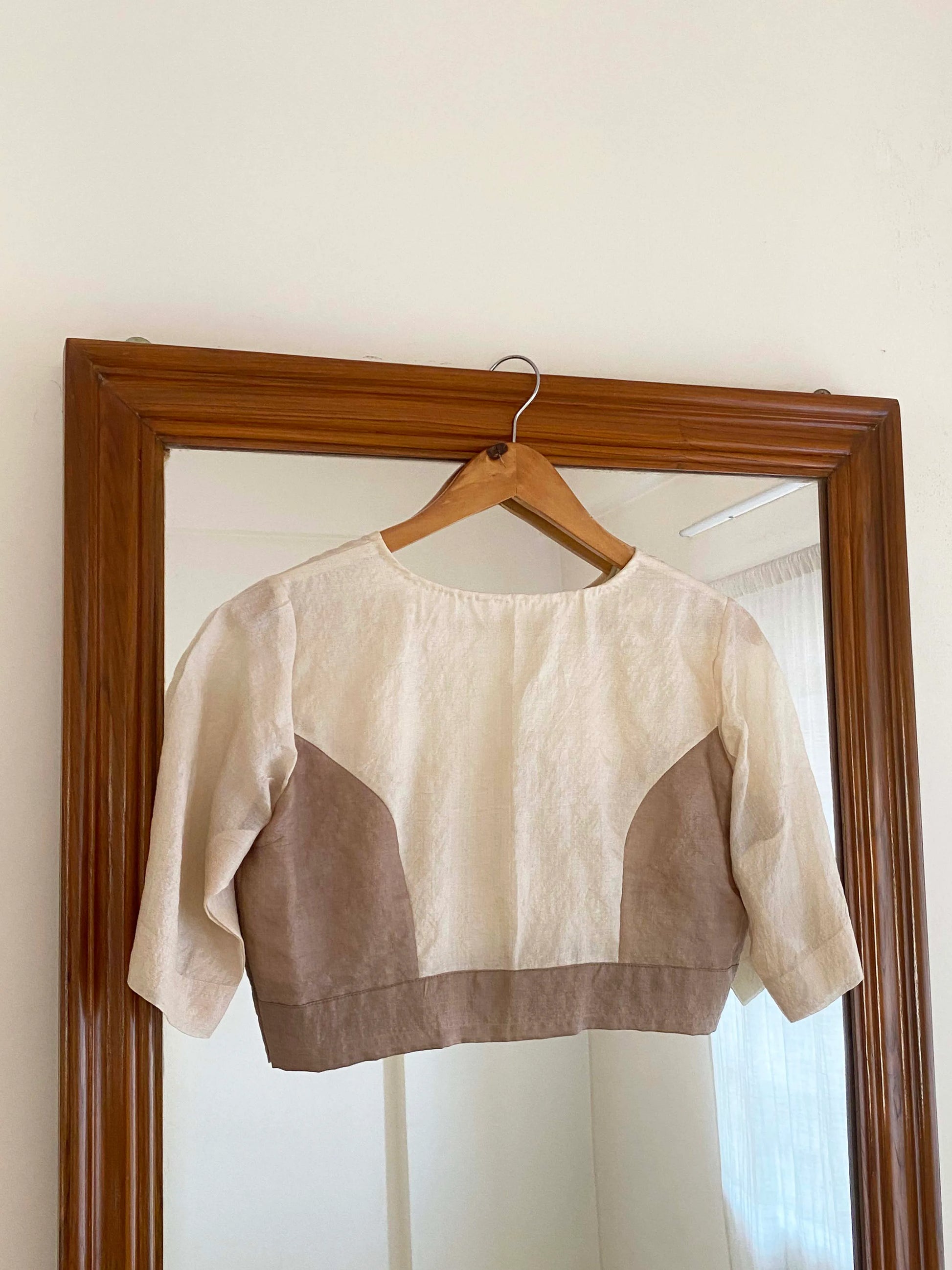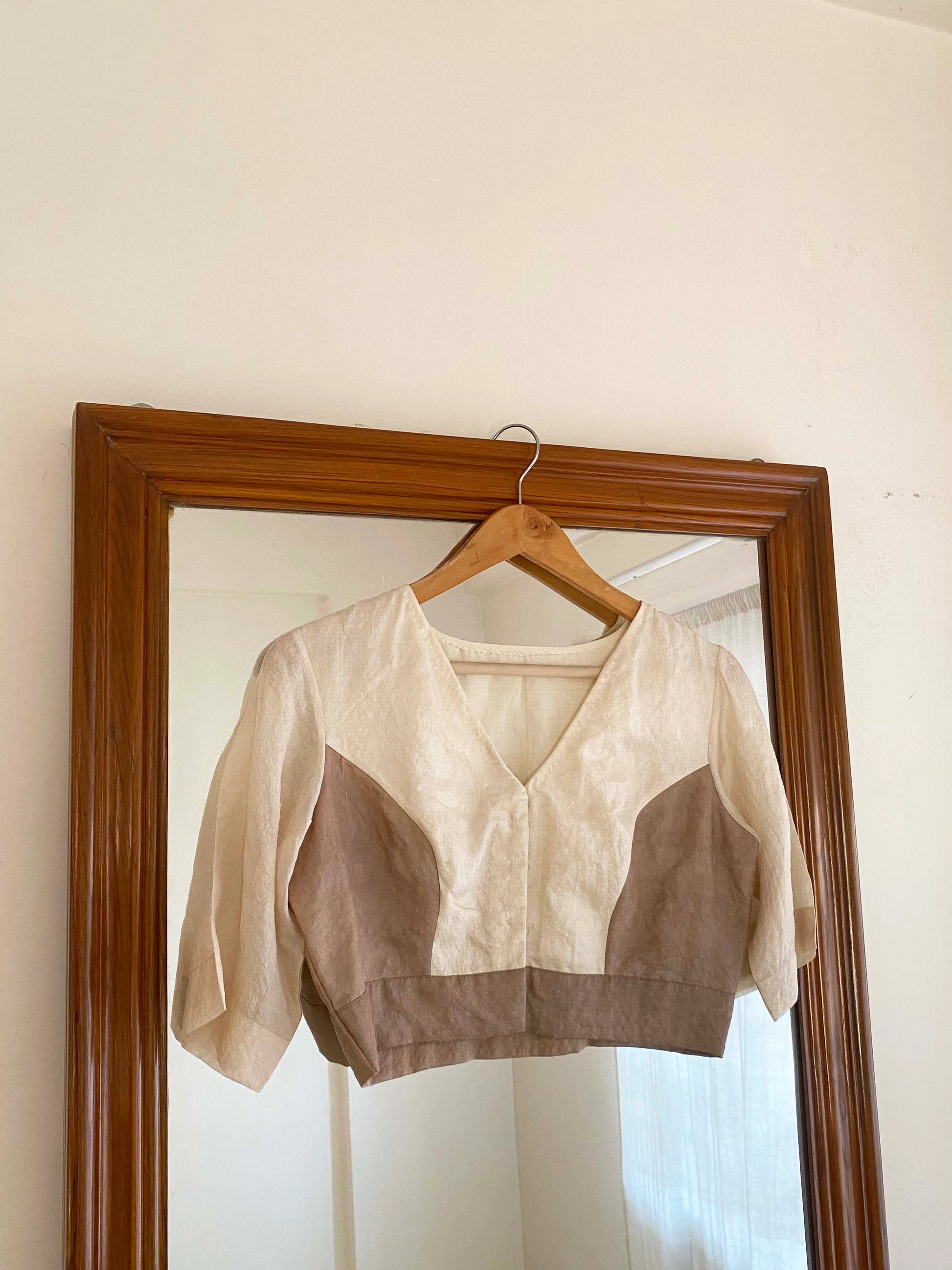 Our blouse features a silhouette in tones of brown and off-white, with a V neckline, detailed with button closure.