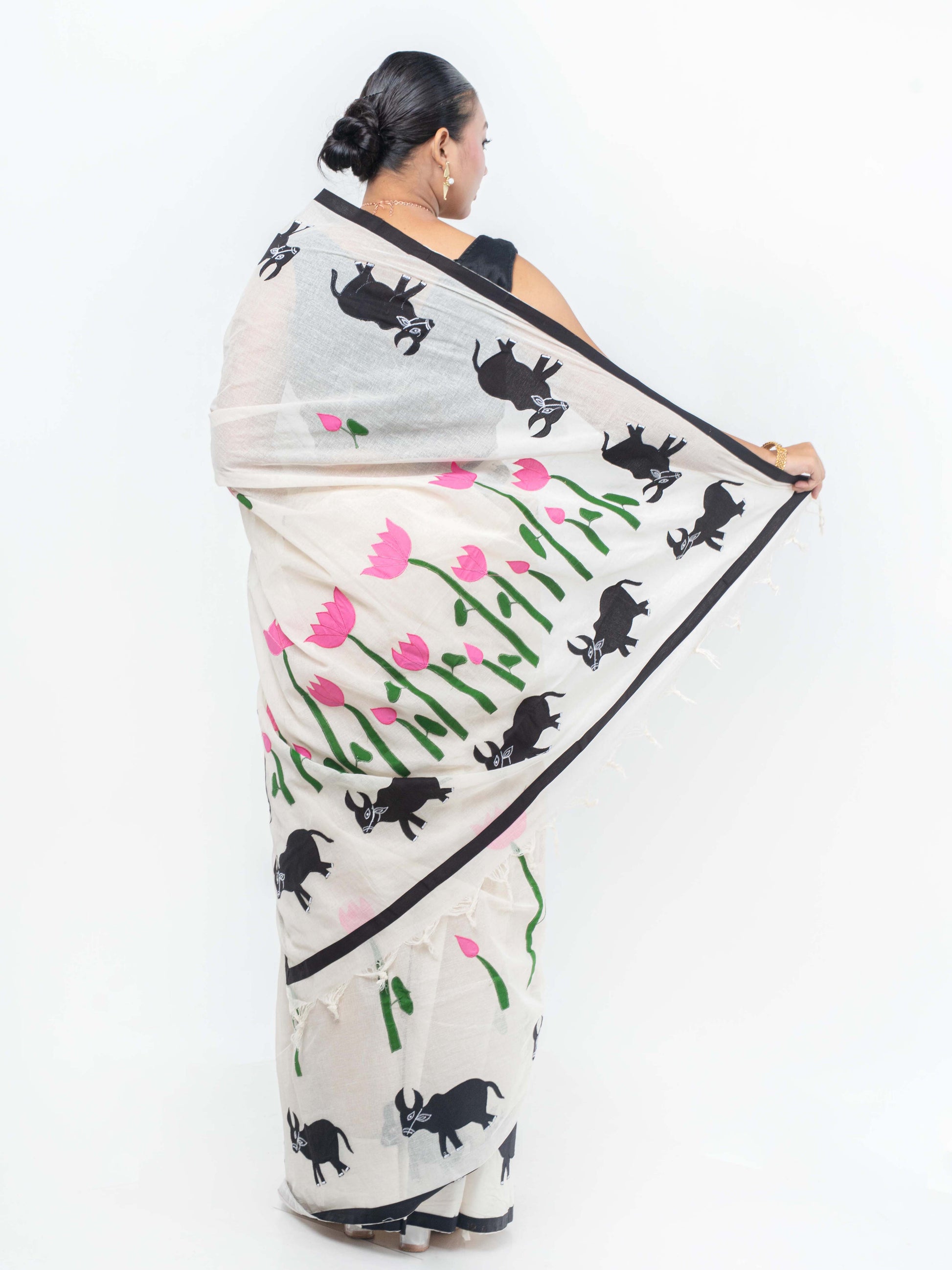 A handwoven cotton saree with pink lotus and nandi bull motifs makes this saree beautiful and unique in its own way.