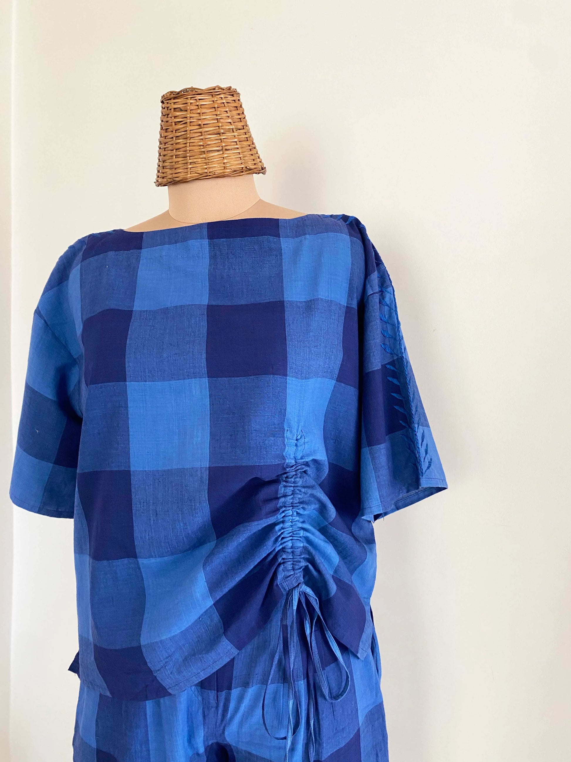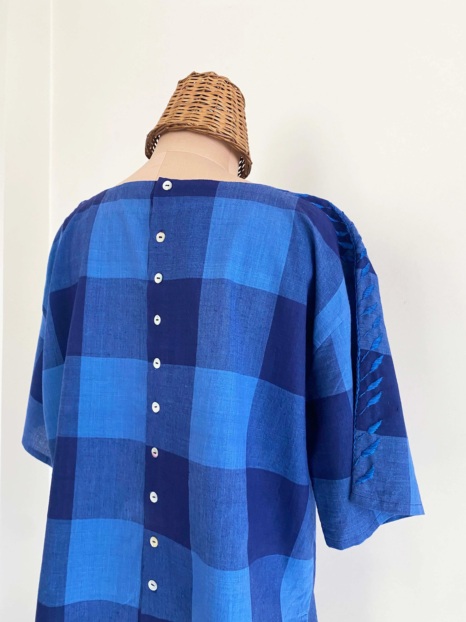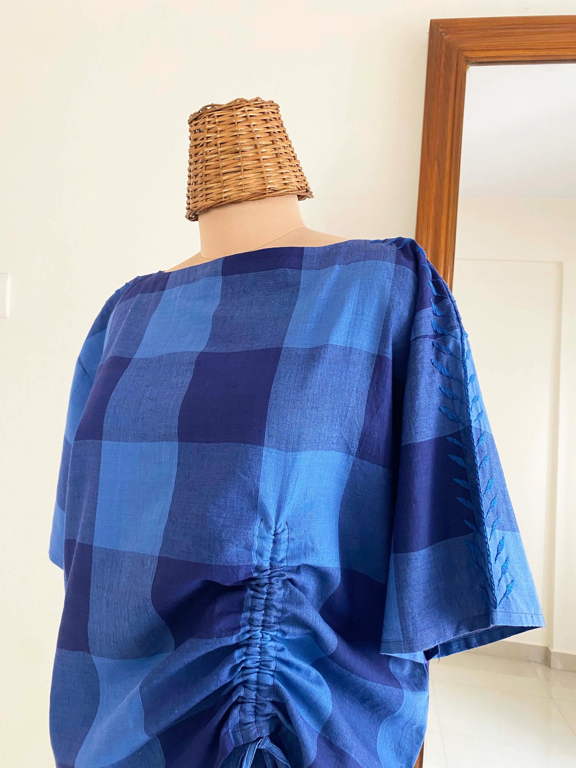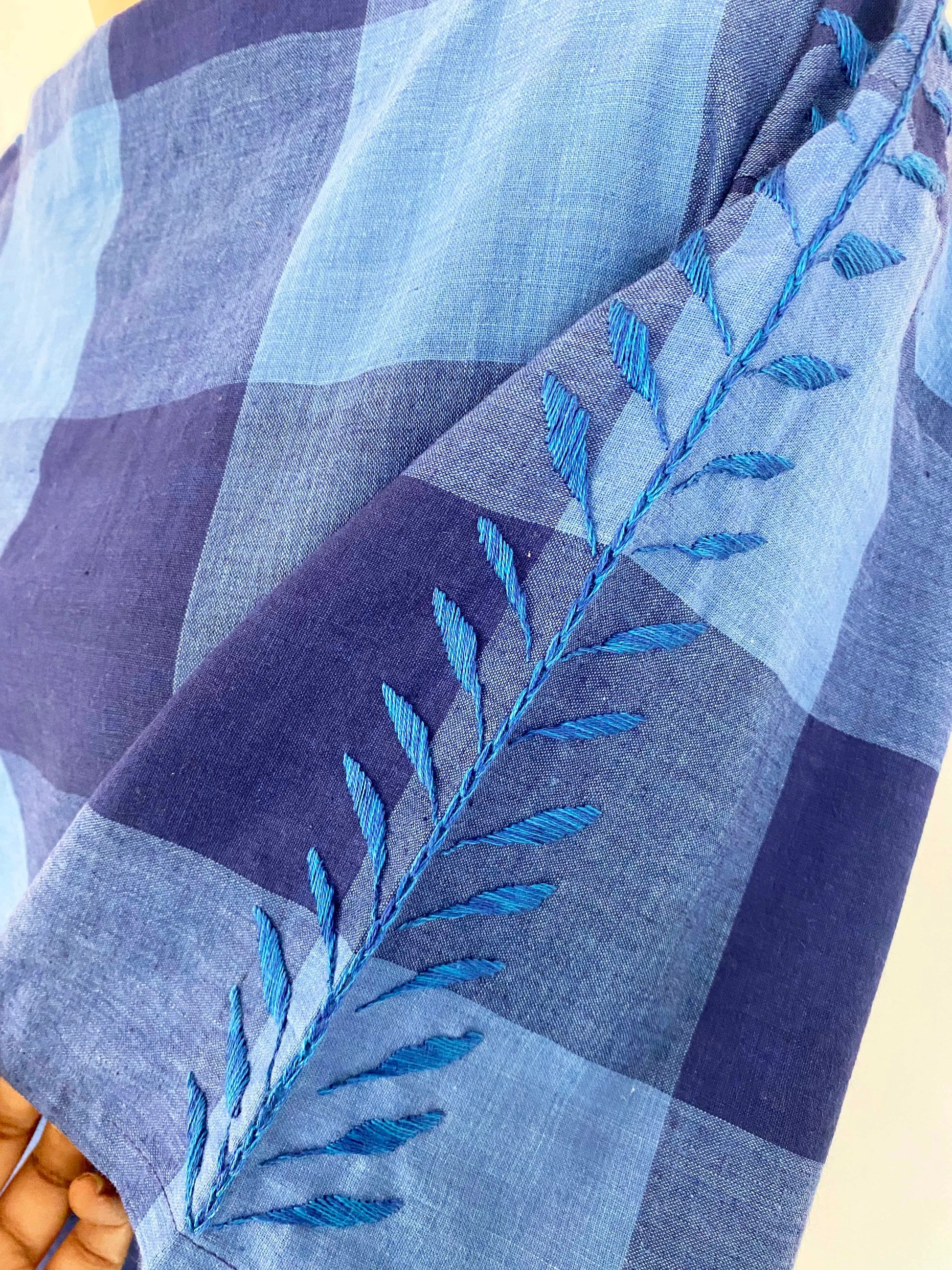 The top in a gorgeous shade of blue checks along with beautiful and intricate embroidery at sleeve.