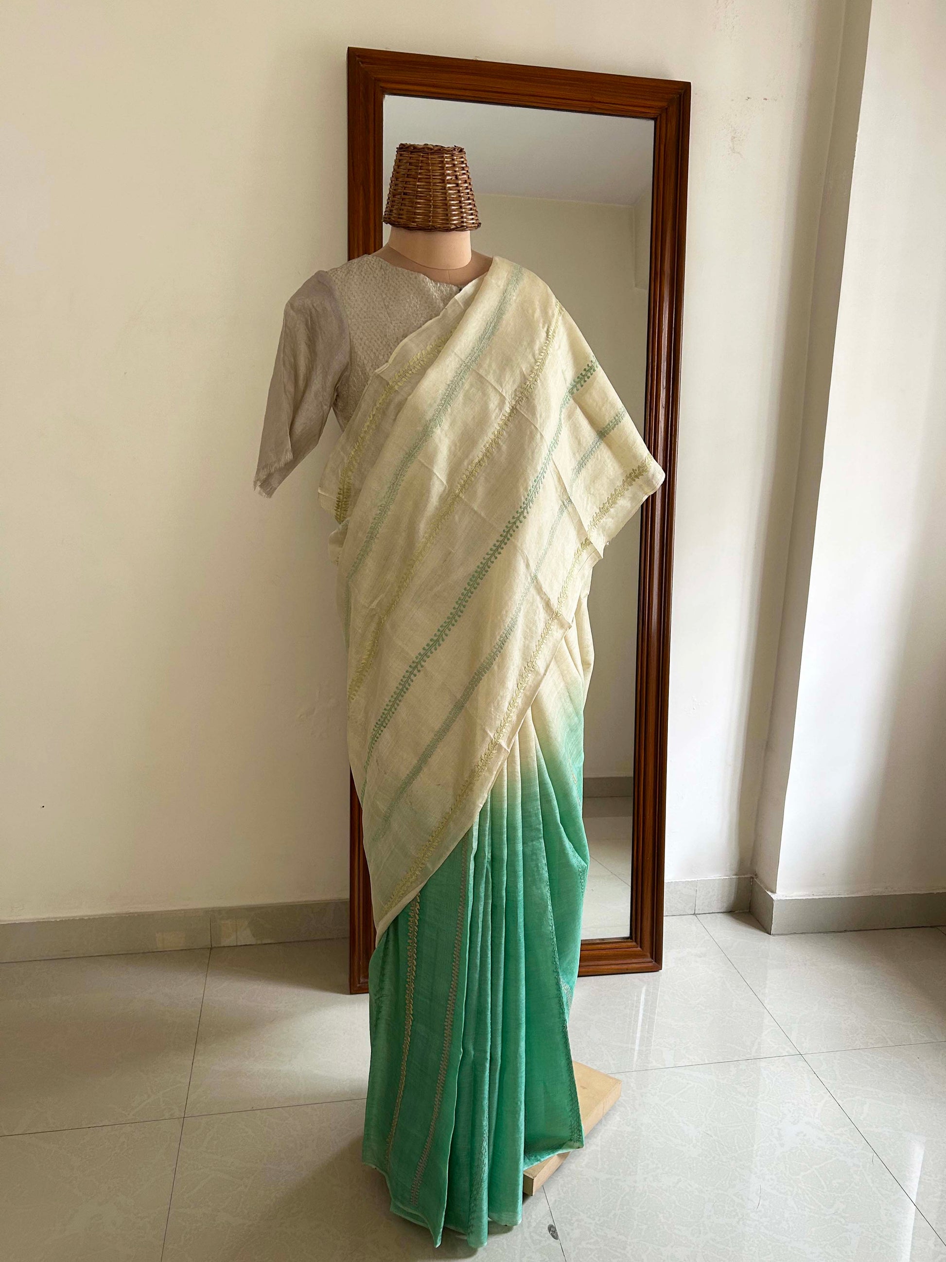Immerse yourself in elegance with this fine tussar silk saree, adorned with delicate underwater plant motifs in soothing pastel shades of green and blue, intricately crafted in chikankari. A timeless blend of luxury and simplicity. πΏπ