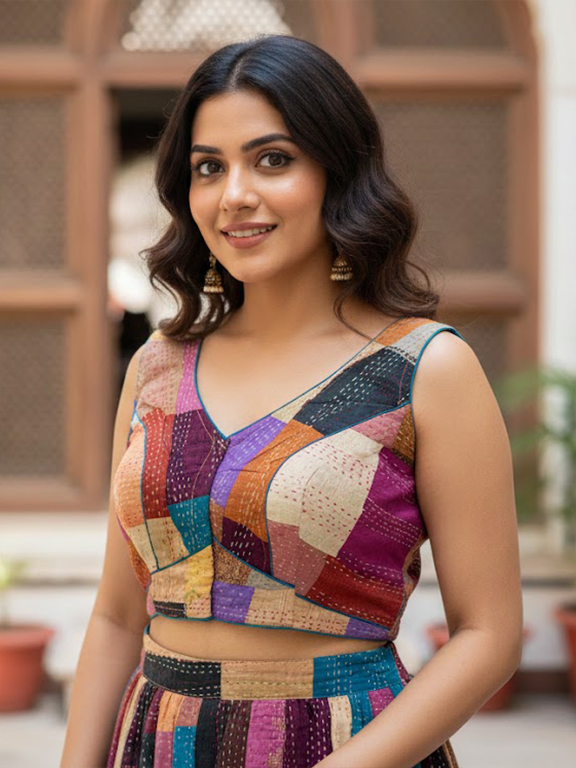 A patchwork kantha blouse made of patches of recycled silk fabric using, traditional kantha embroidery. A V neckline and front hook closure makes this sleeveless piece the epitome of ease and understated luxe.
