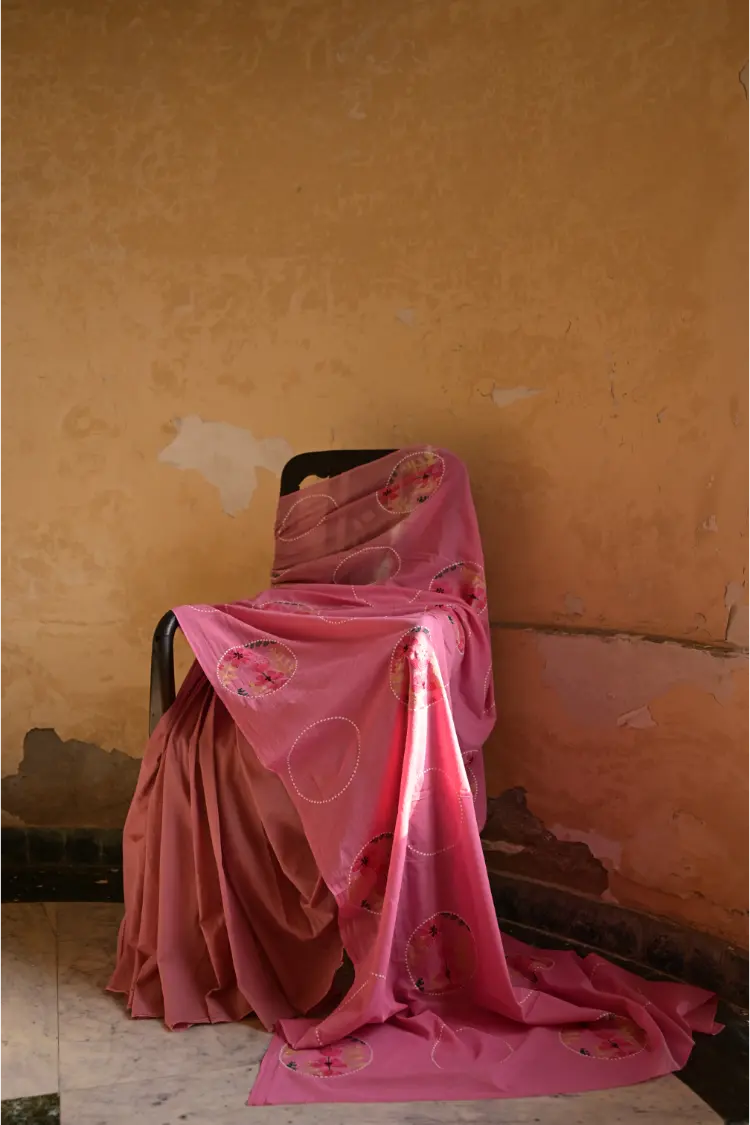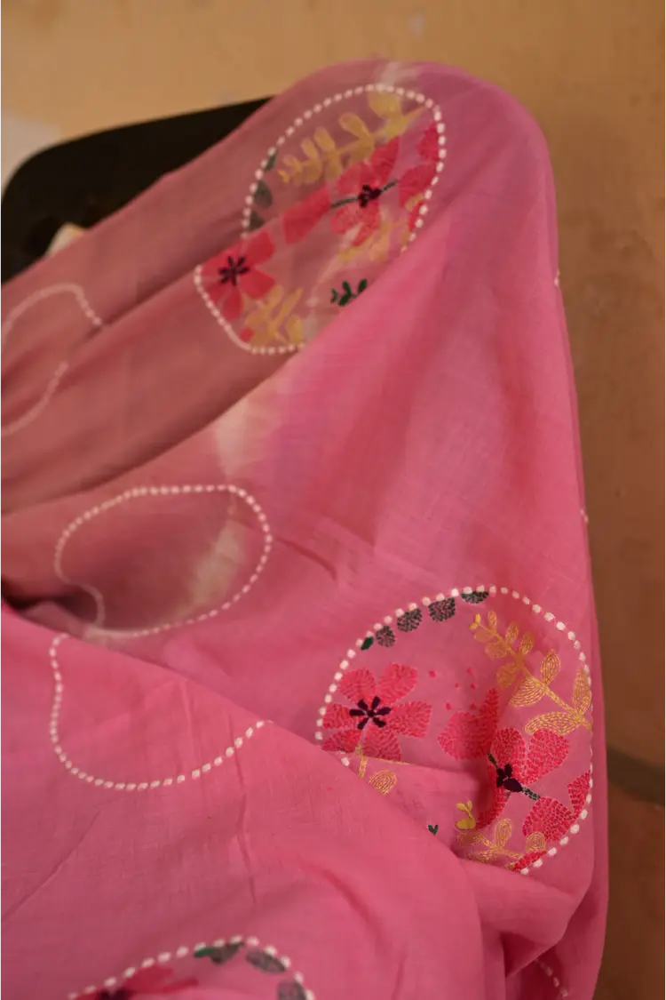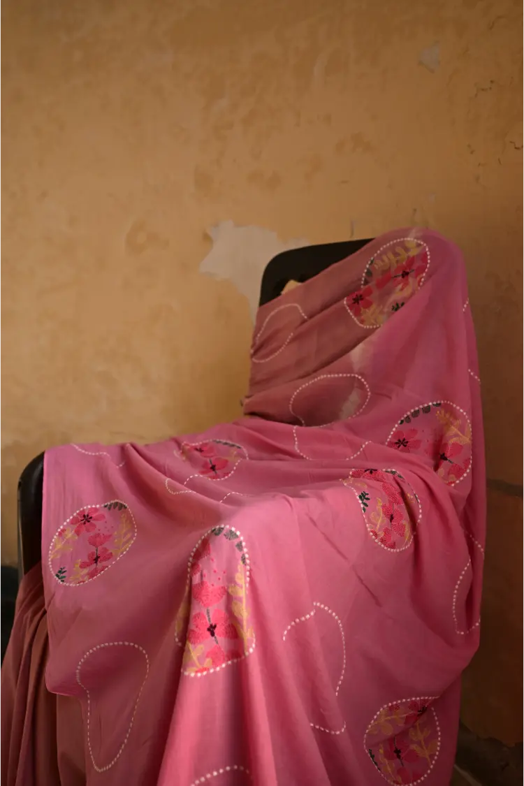 A two toned khadi muslin saree in pink and Indian red, this piece is adorned with contrasting kantha stitch floral motifs and circles.