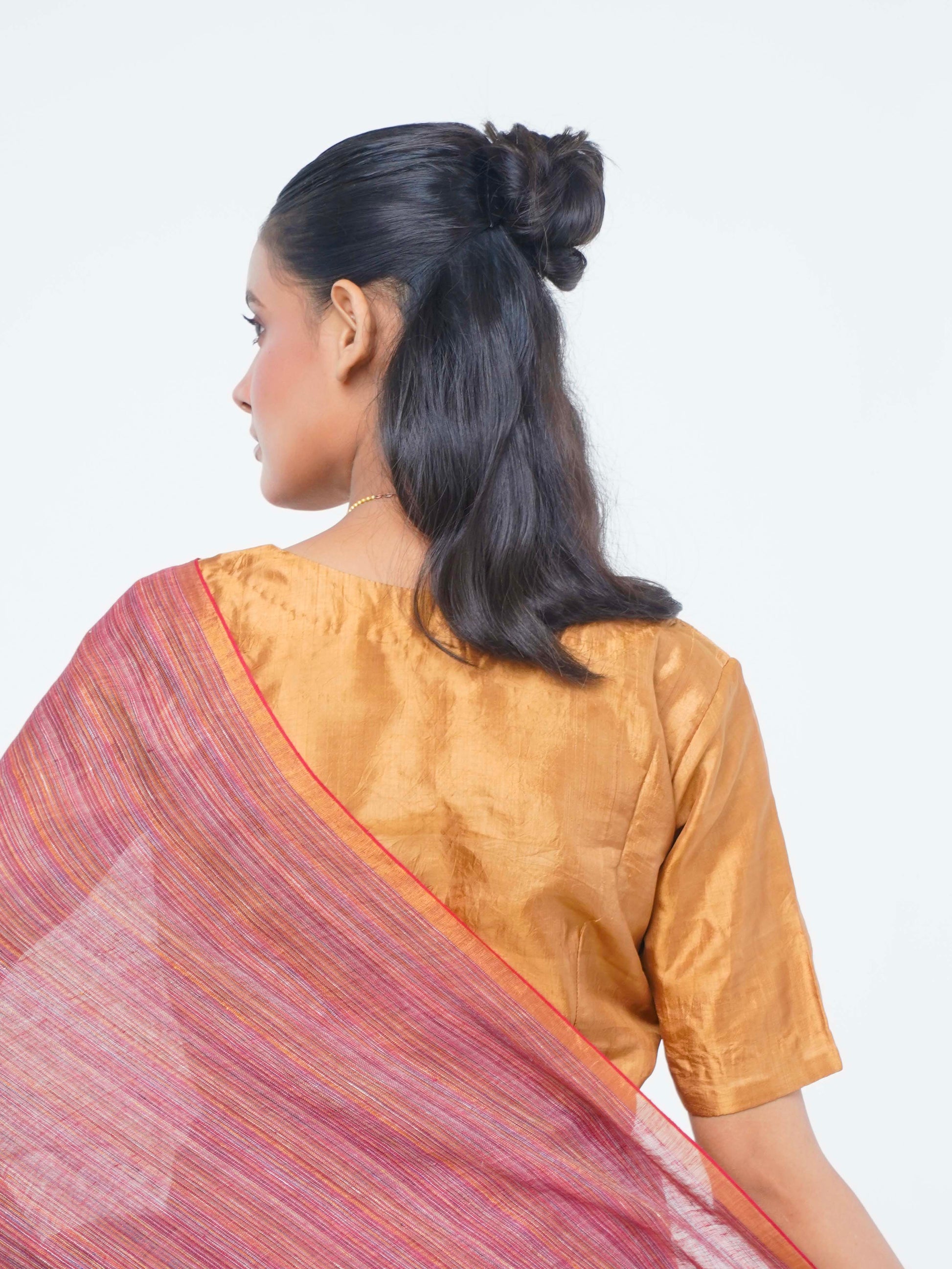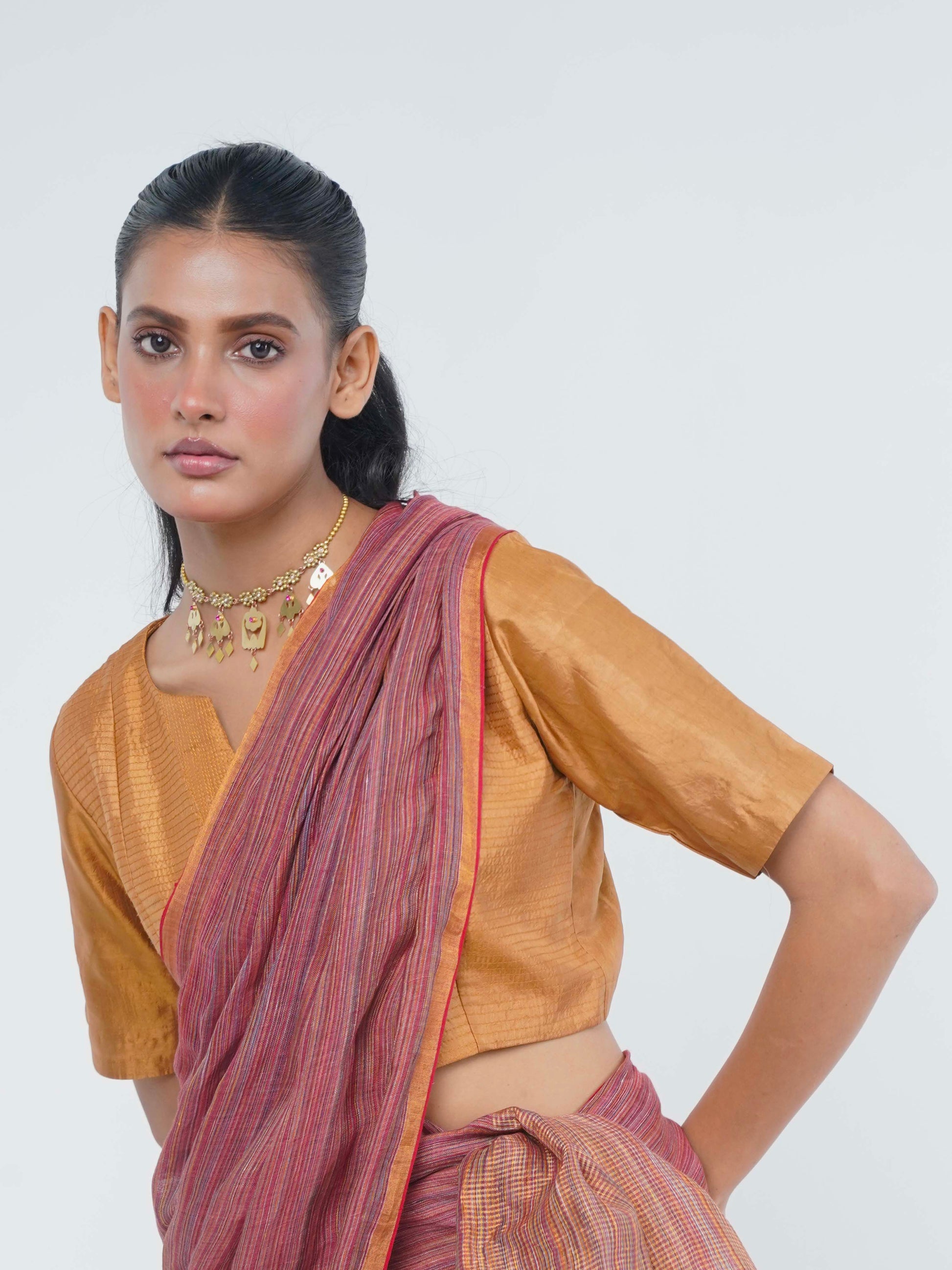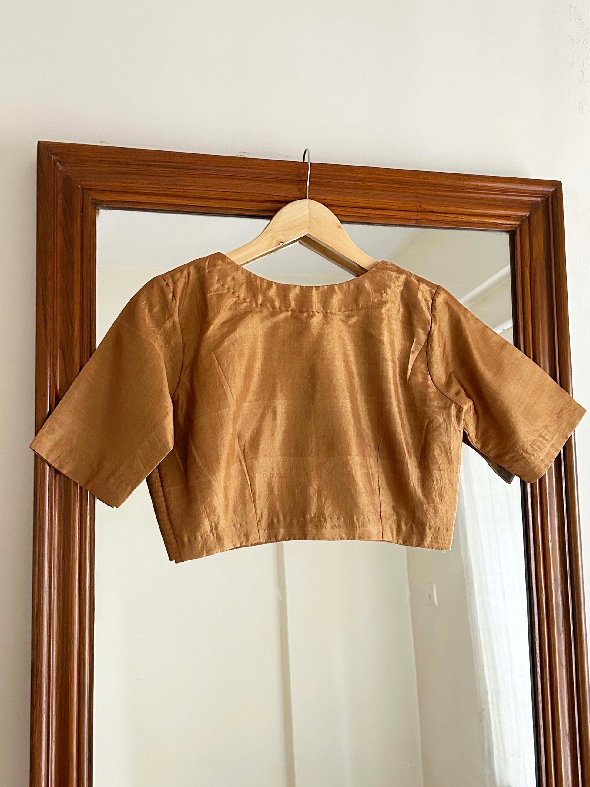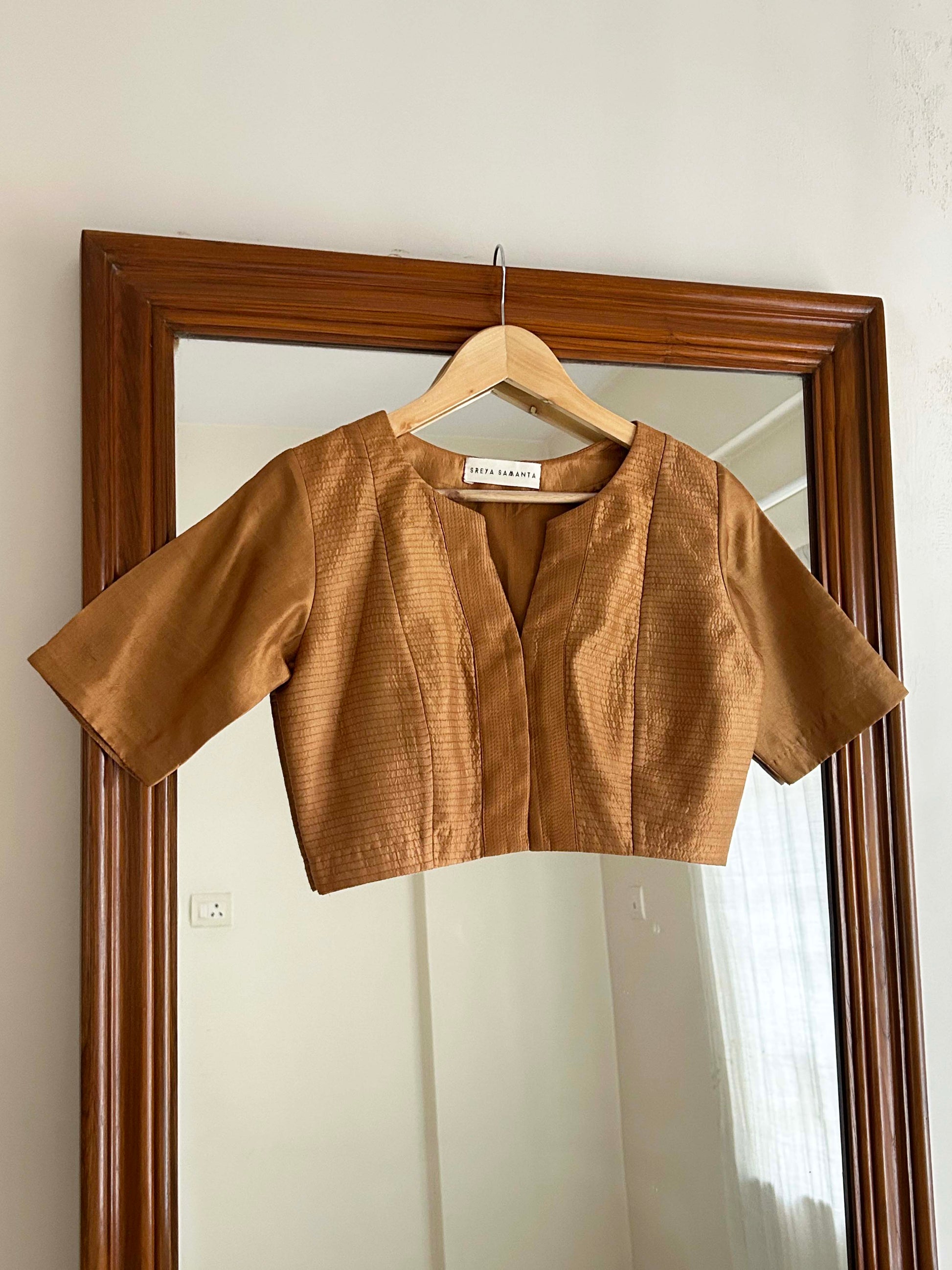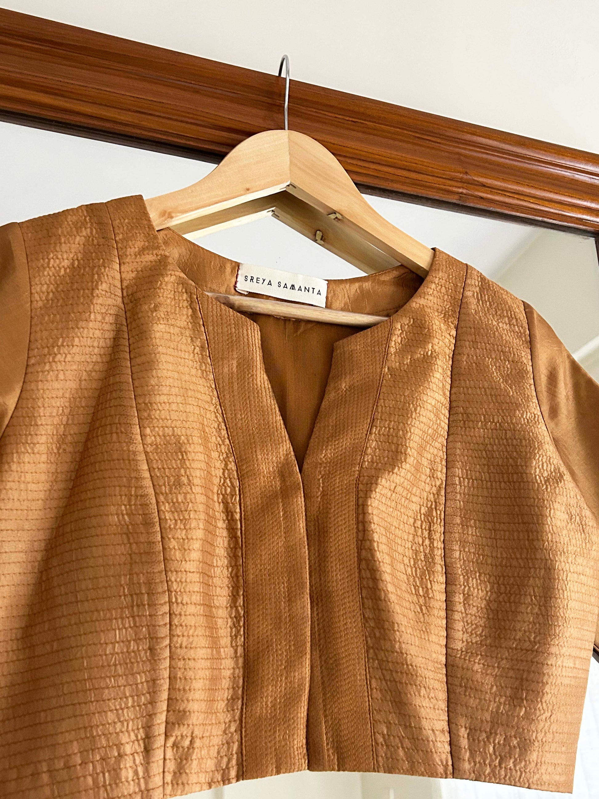 Our blouse comes in a textured golden bronze shade at the front with plain at the back.