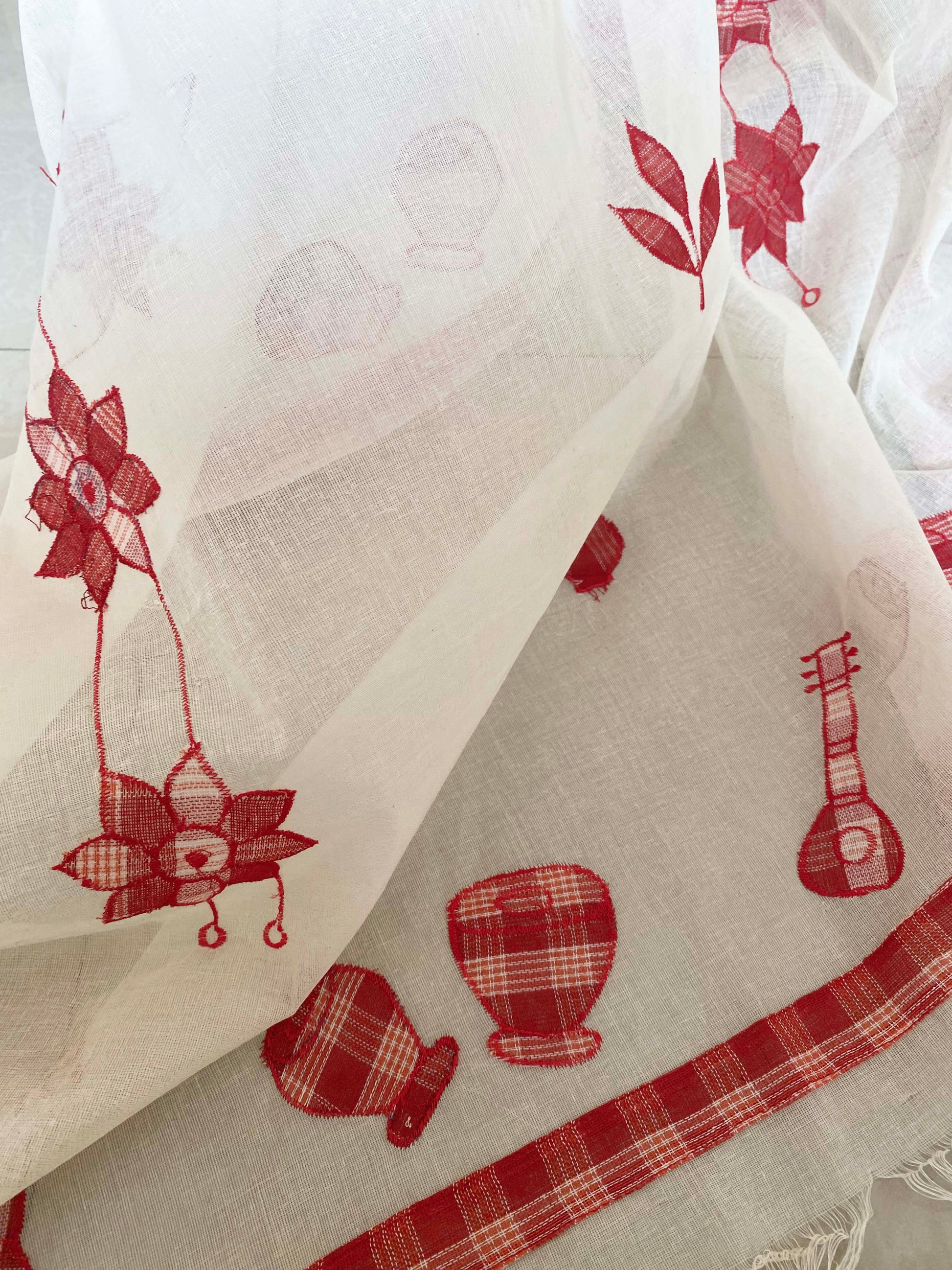 The applique material has been hand cut and machine stitched onto this handwoven soft cotton piece, giving a touch of tradition with modernity.