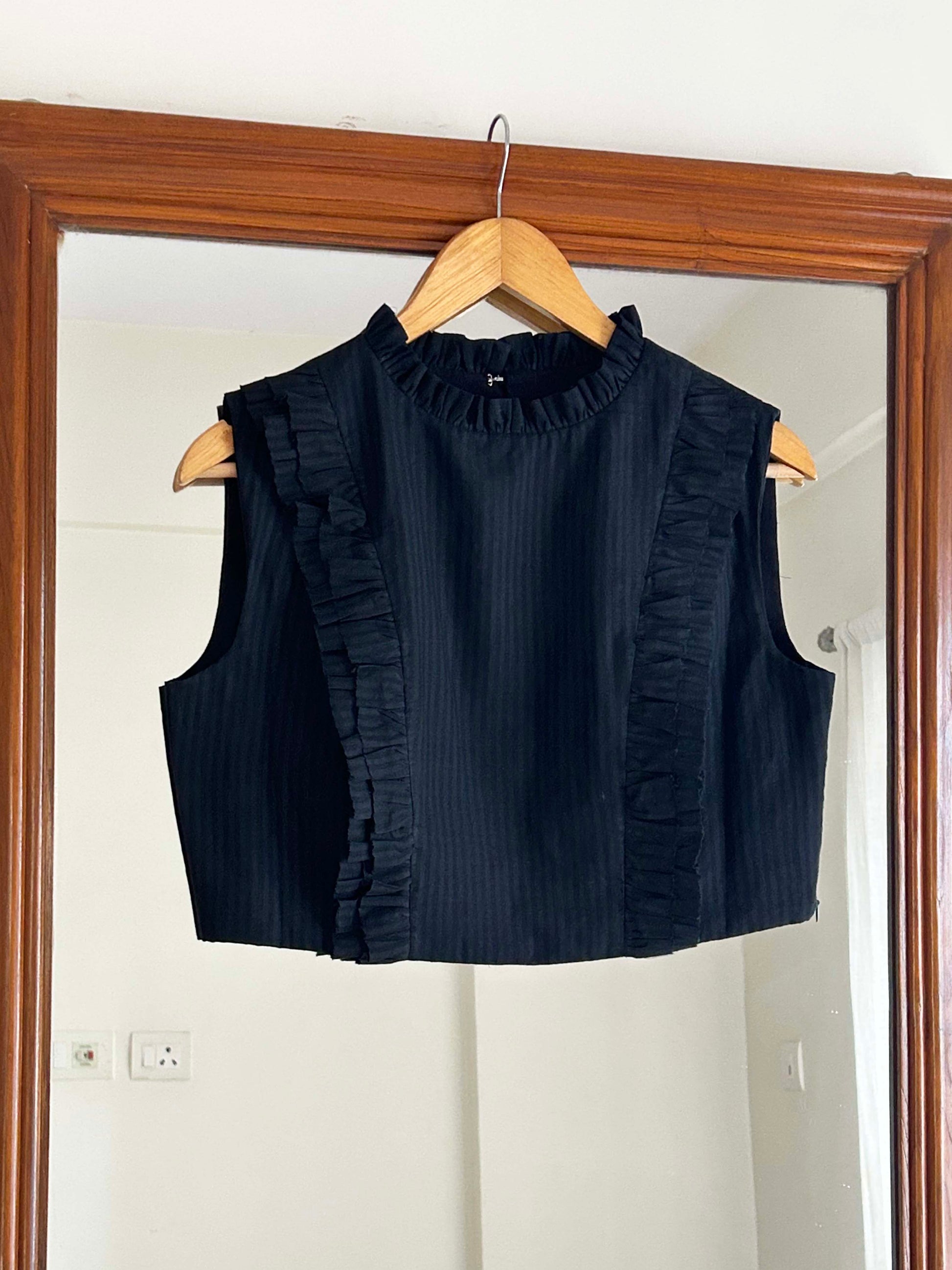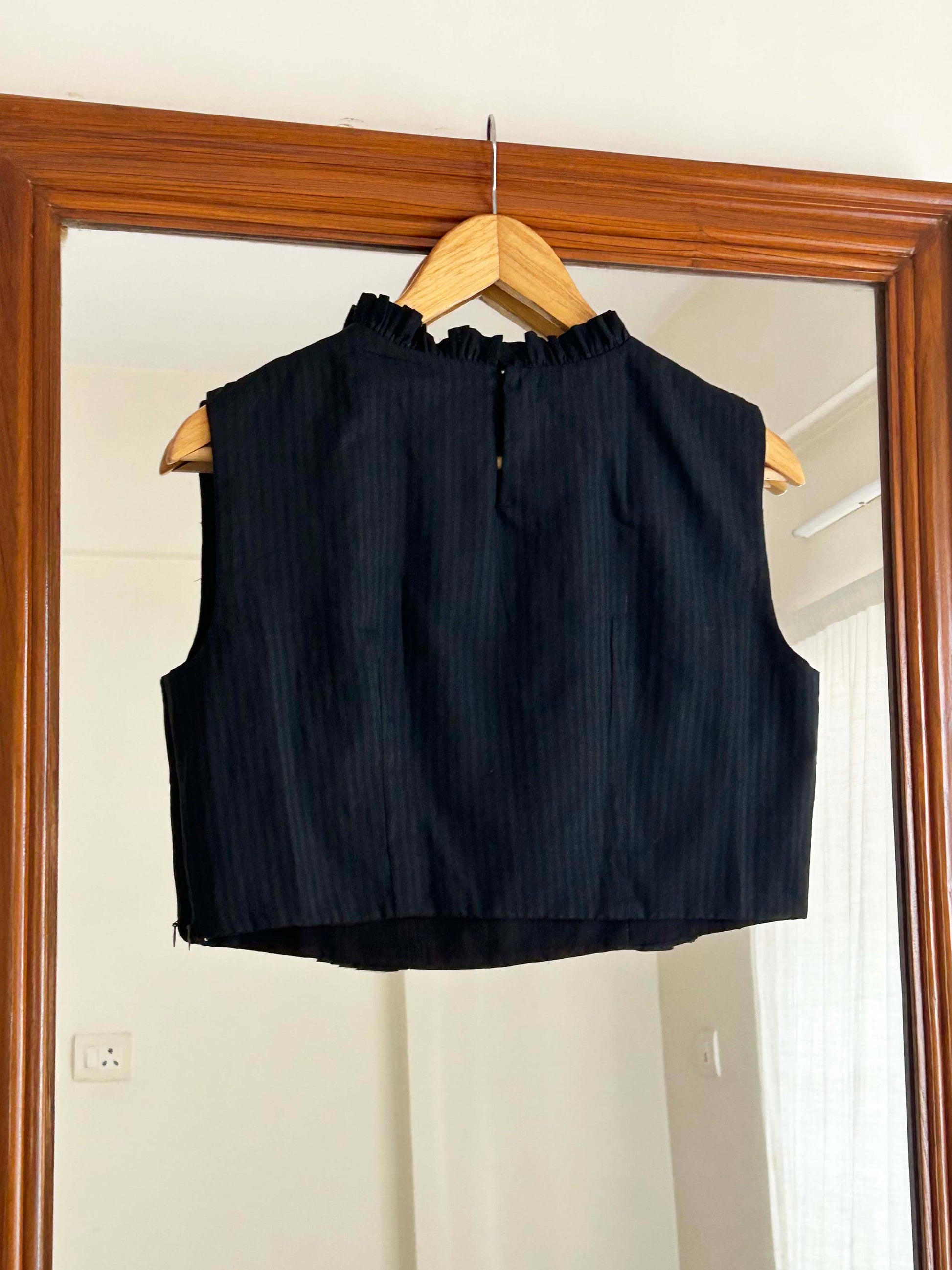 Our playful blouse comes in a tone of black. With ruffles along the edges and the neckline of the blouse, the piece is accentuated with a soft gleam of glamour. This piece is our favourite pick for a flamboyant evening party.