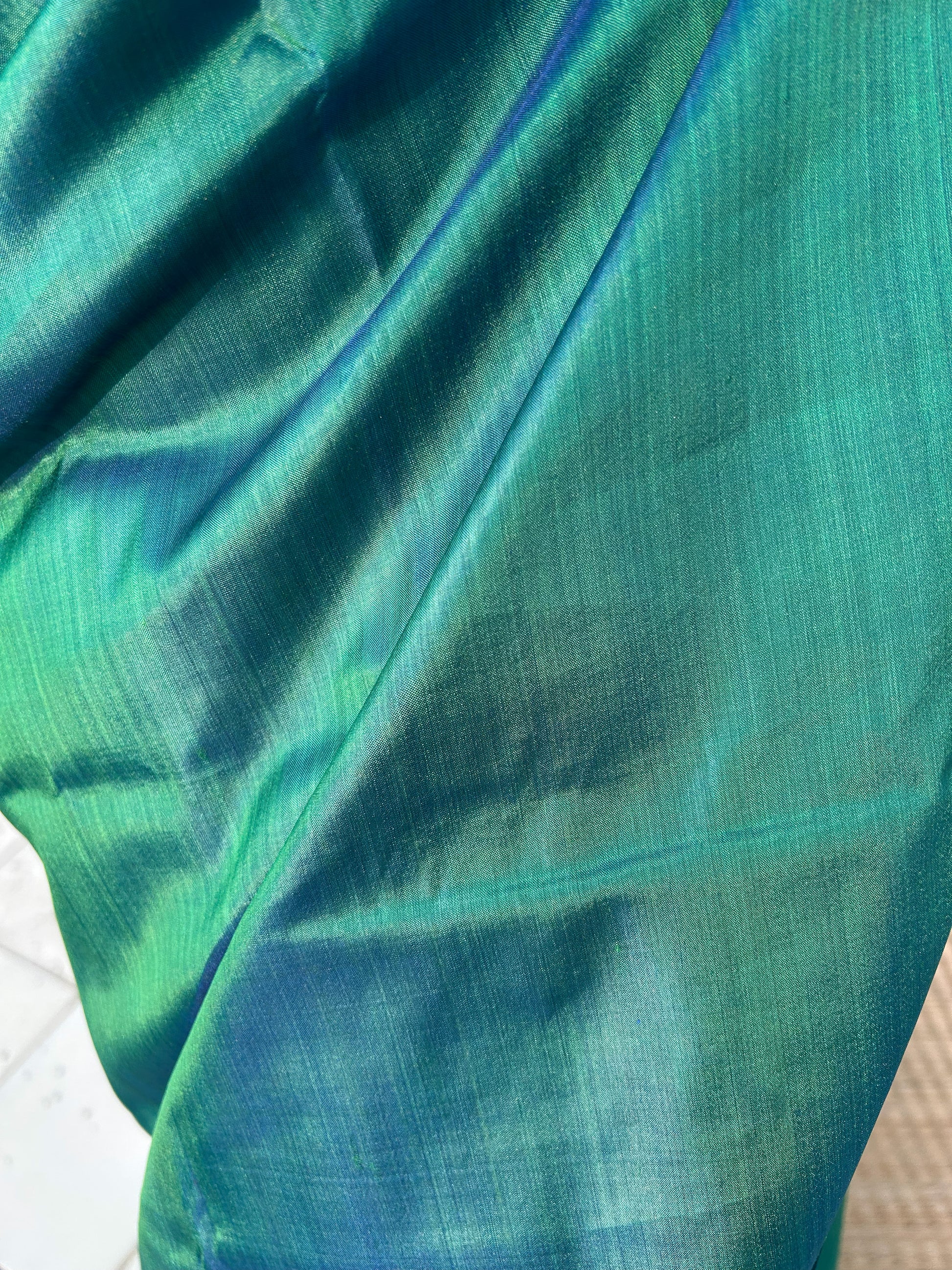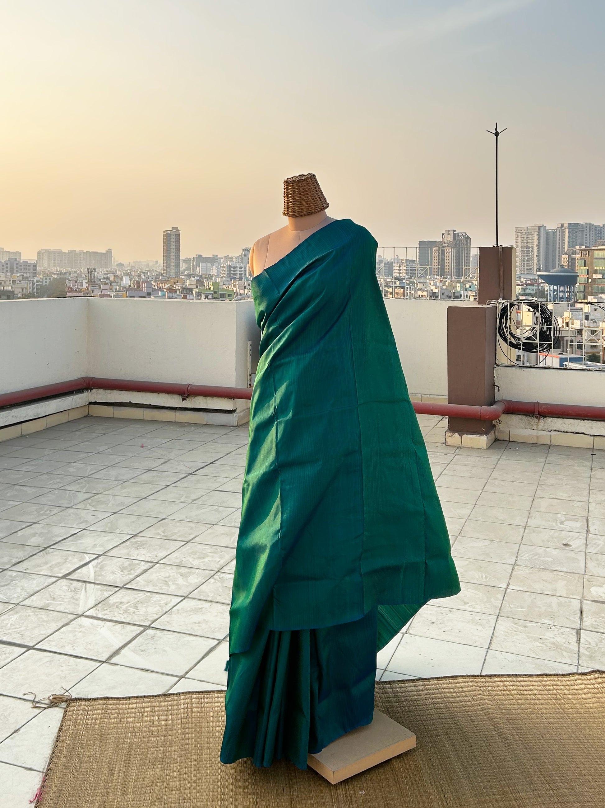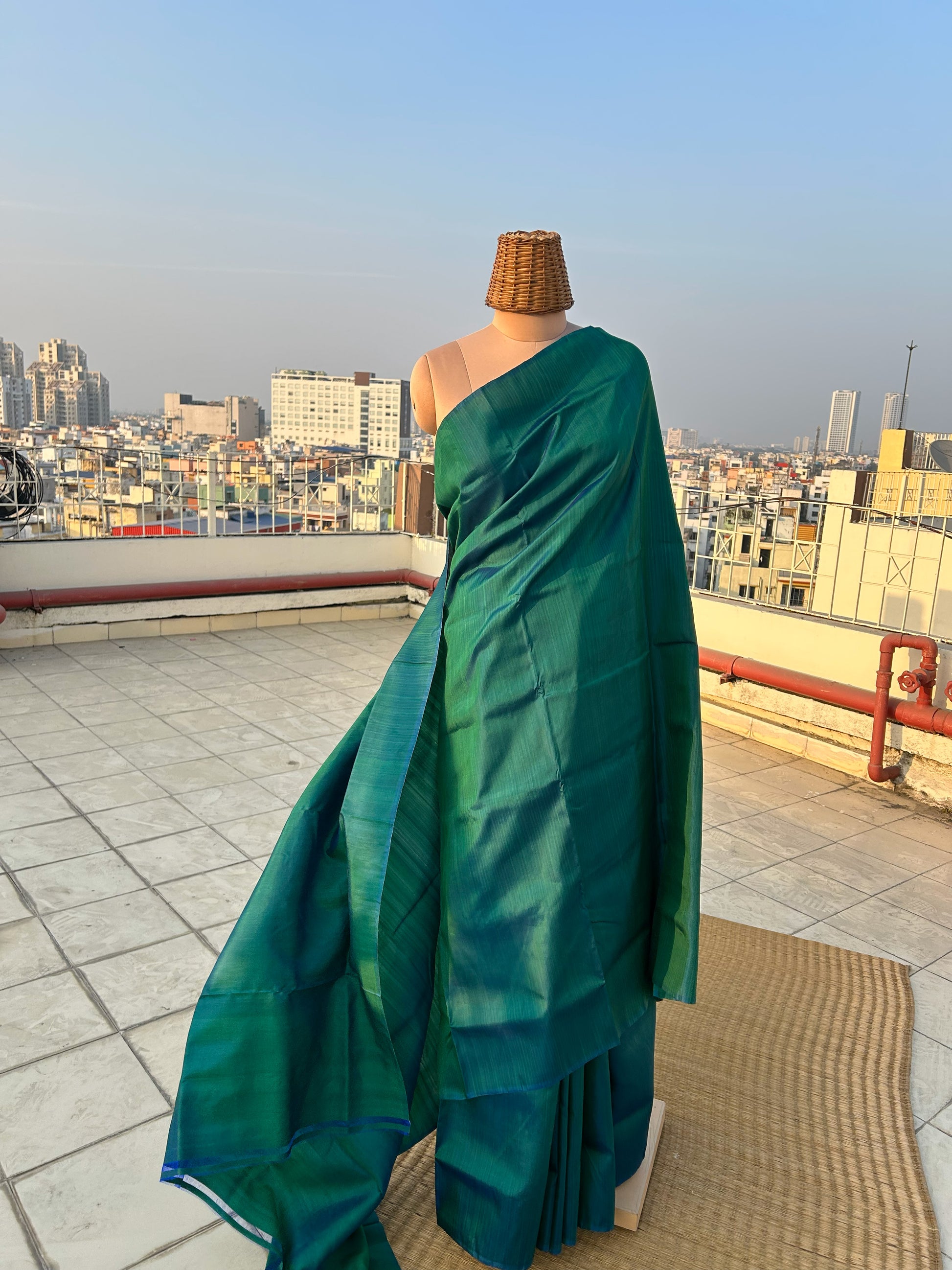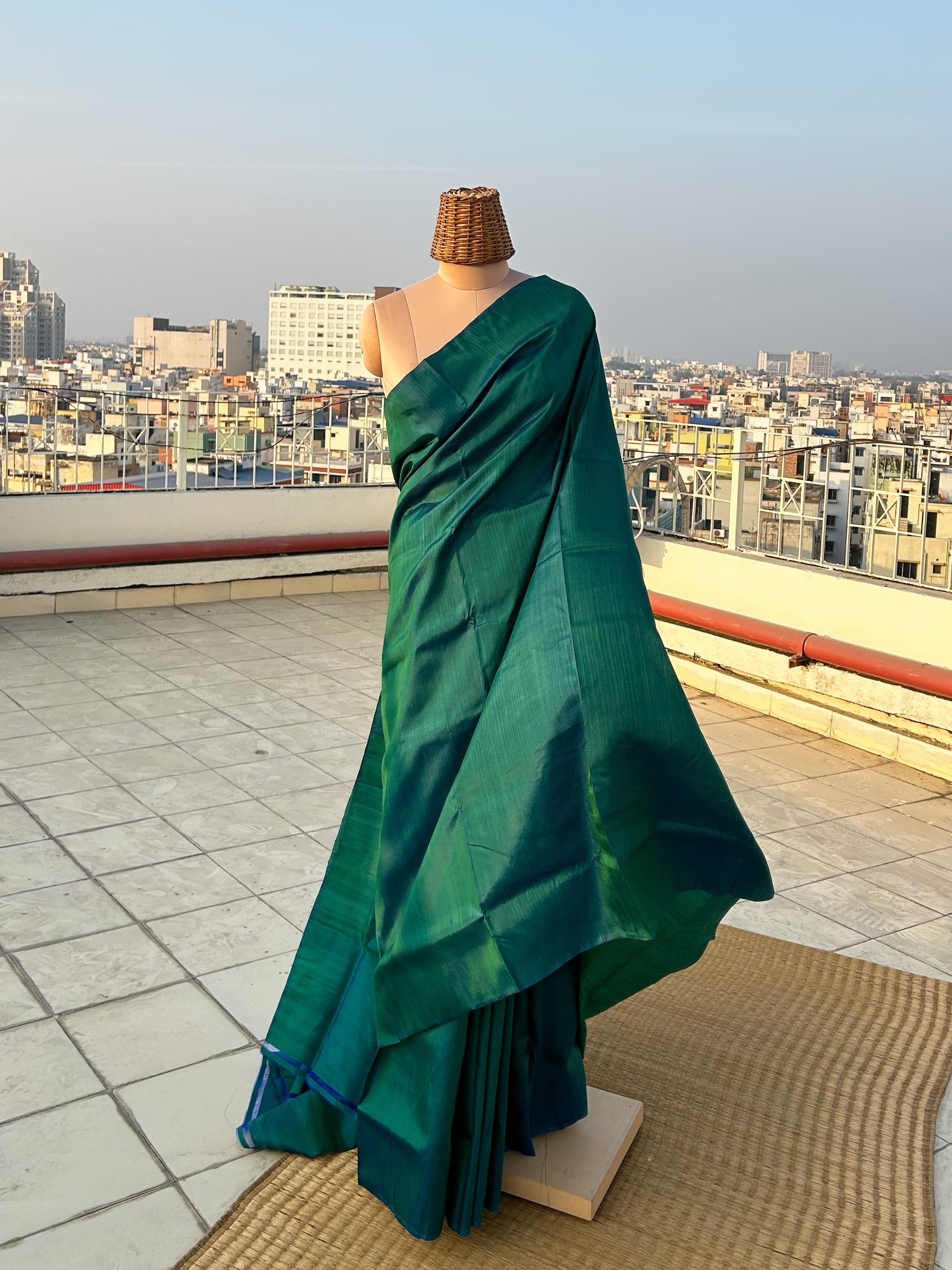 5.5 meters of mulberry silk saree in royal green colour that comes with a matching silk blouse piece. Please note that there may be slight variations in colour since each of our pieces are handcrafted.