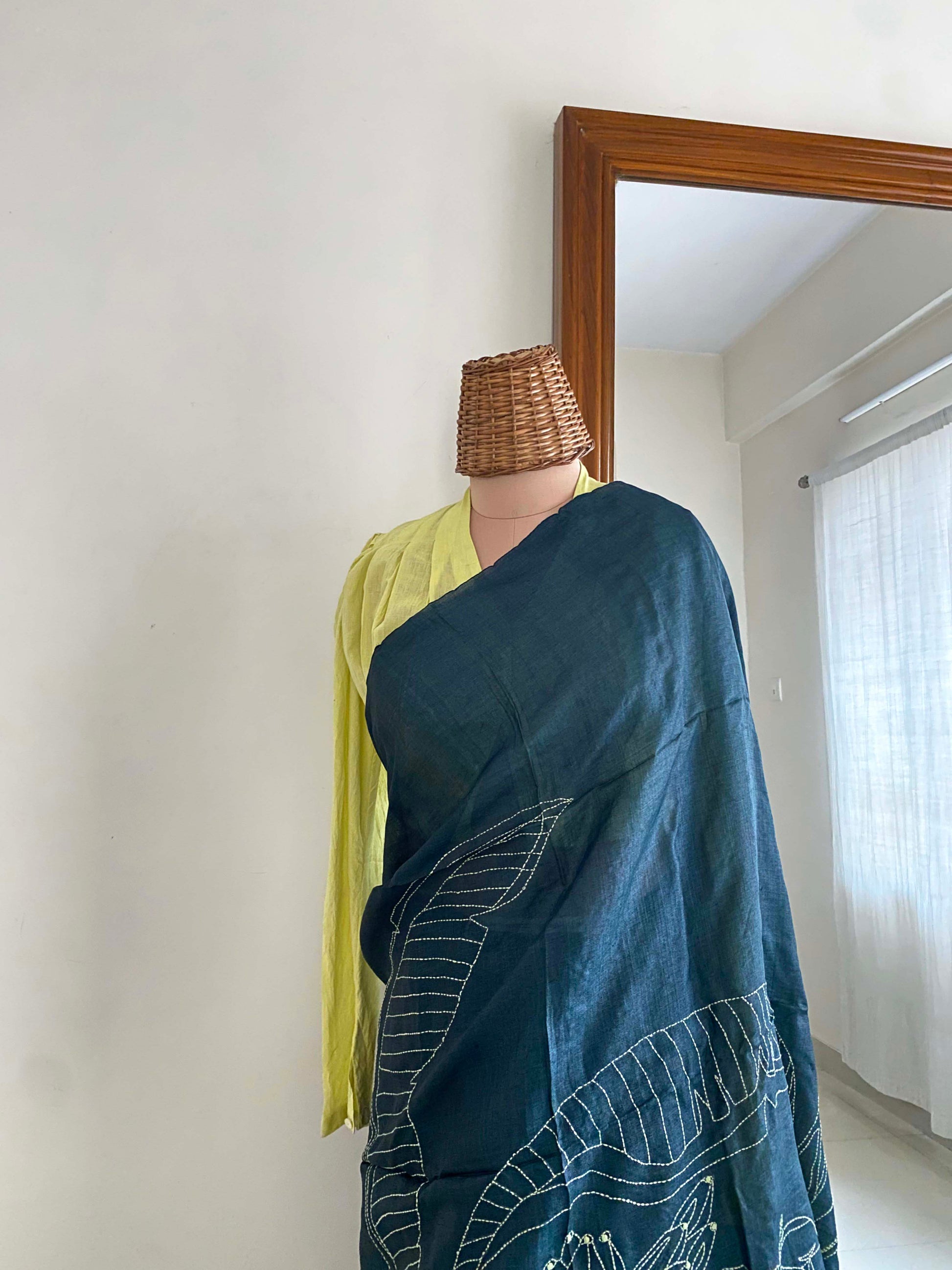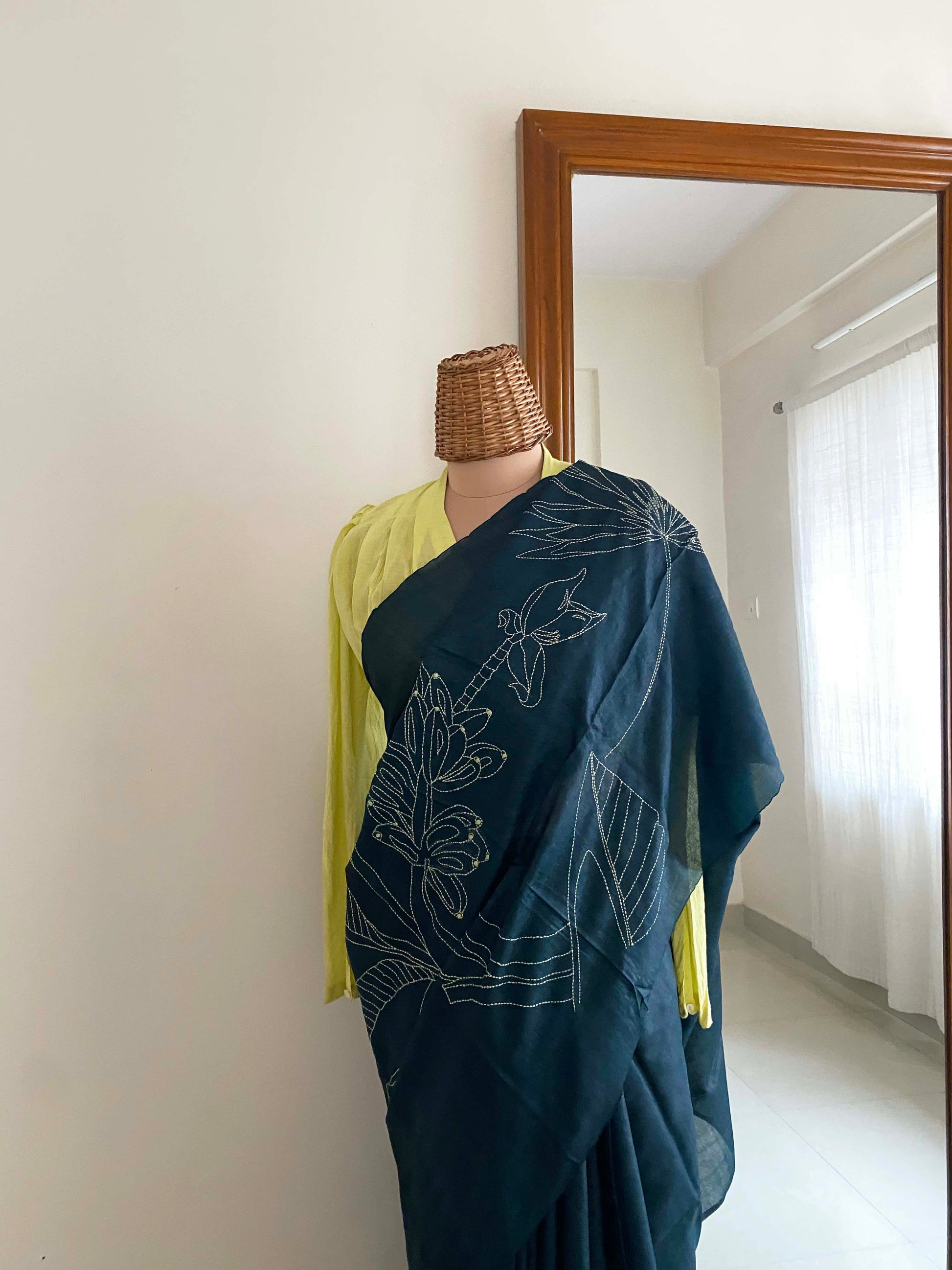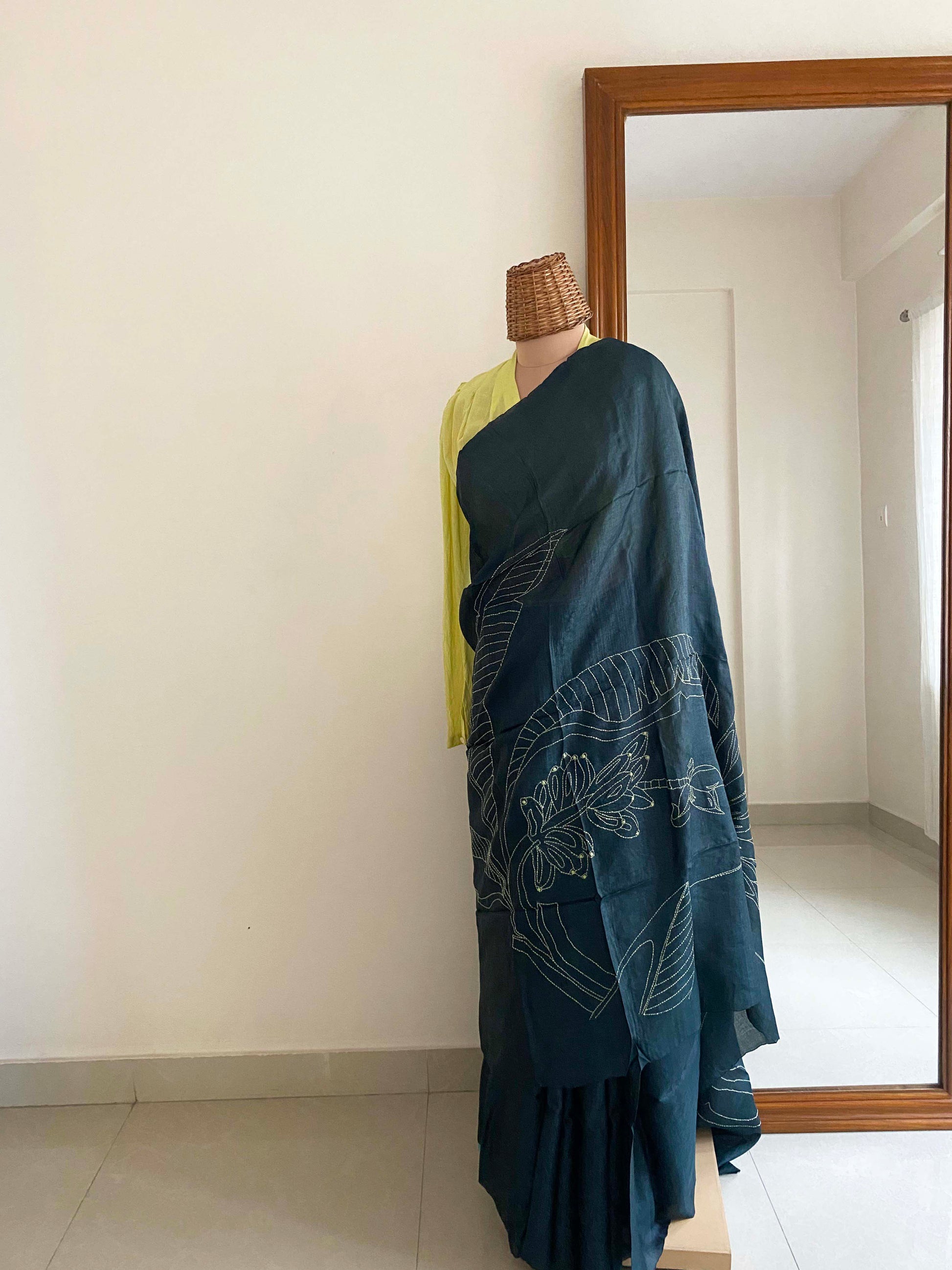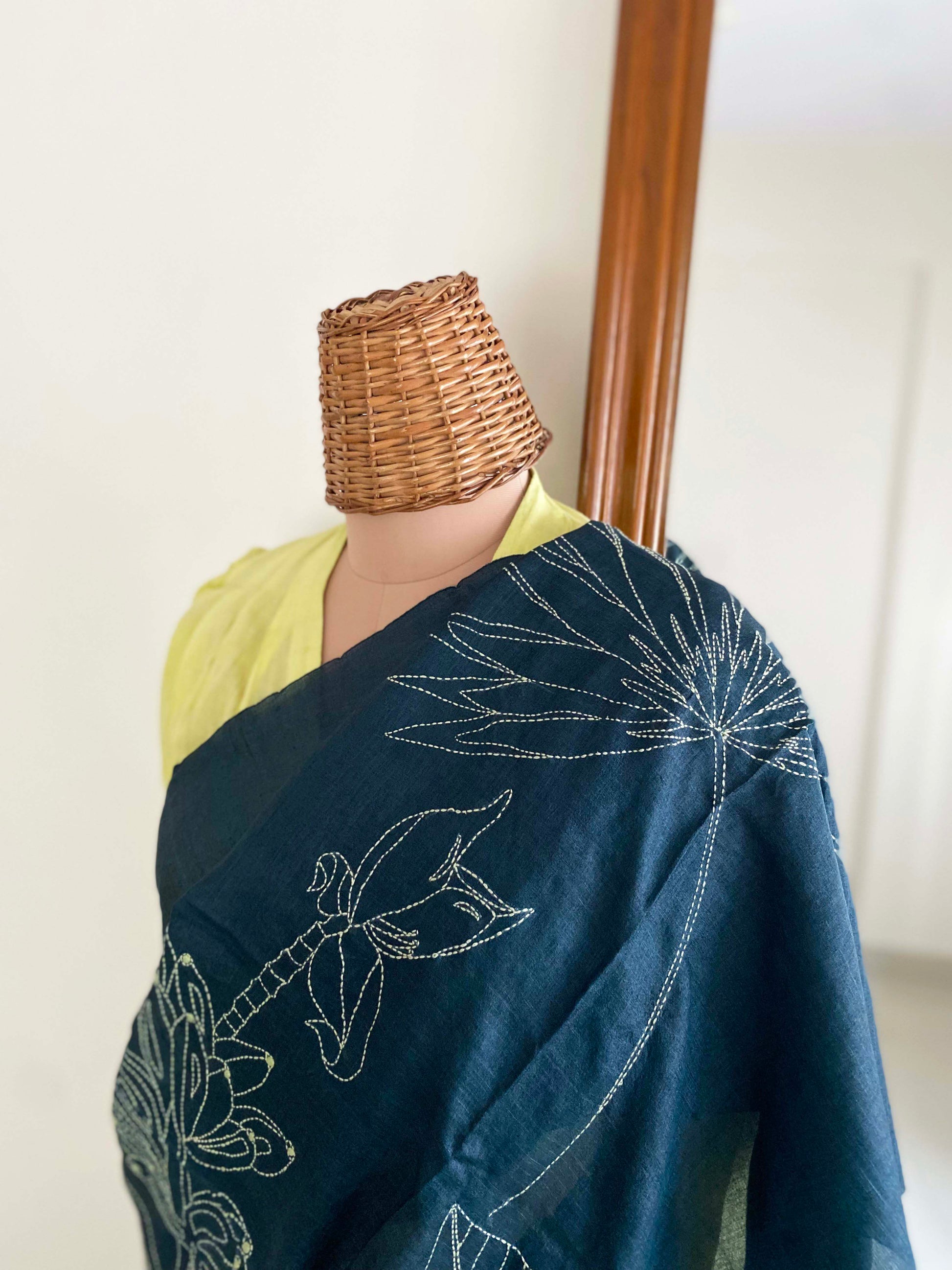 Our saree is adorned with motifs of palm trees and has been hand stitched in a single color kantha embroidery all over the pallu.