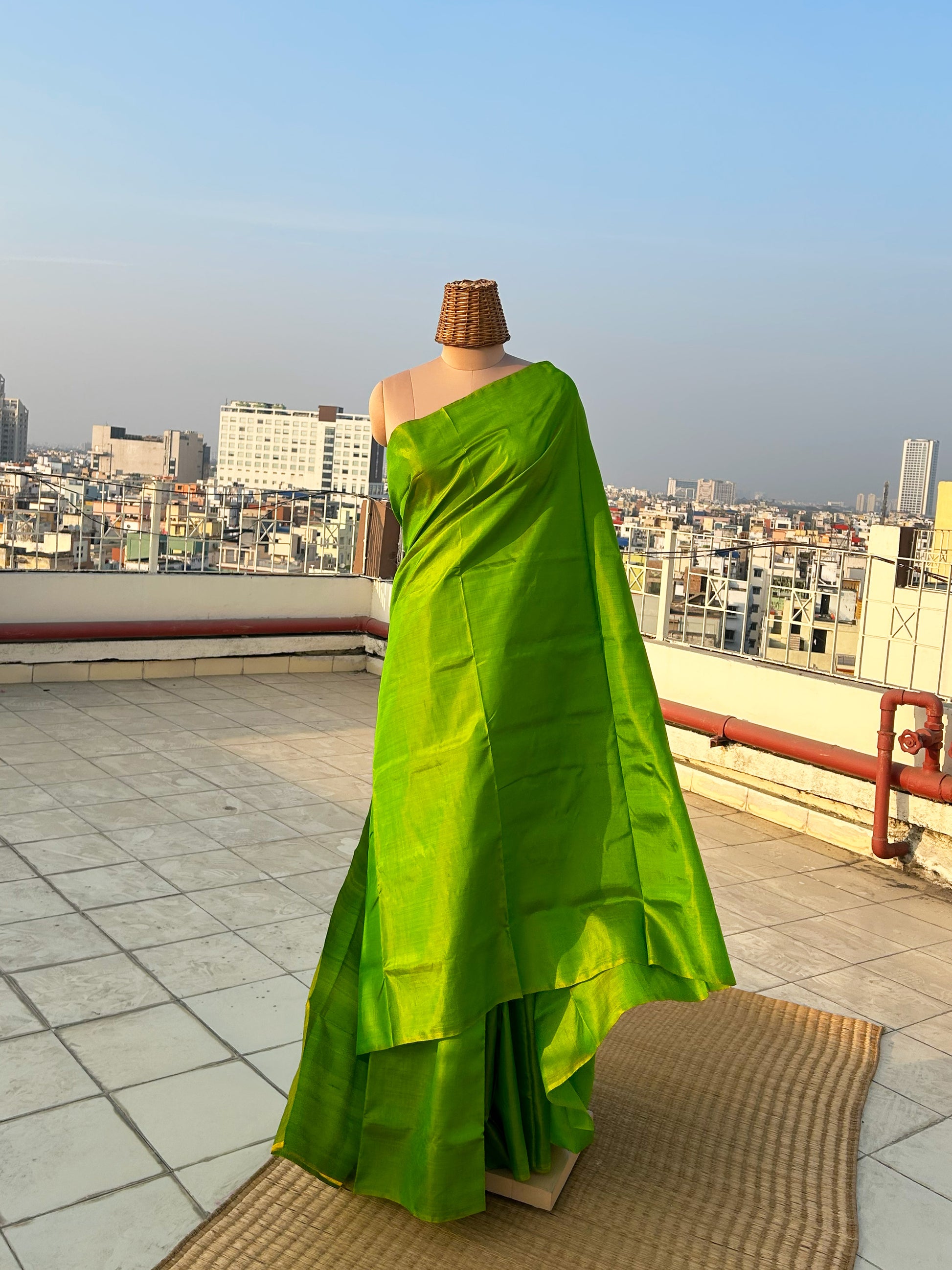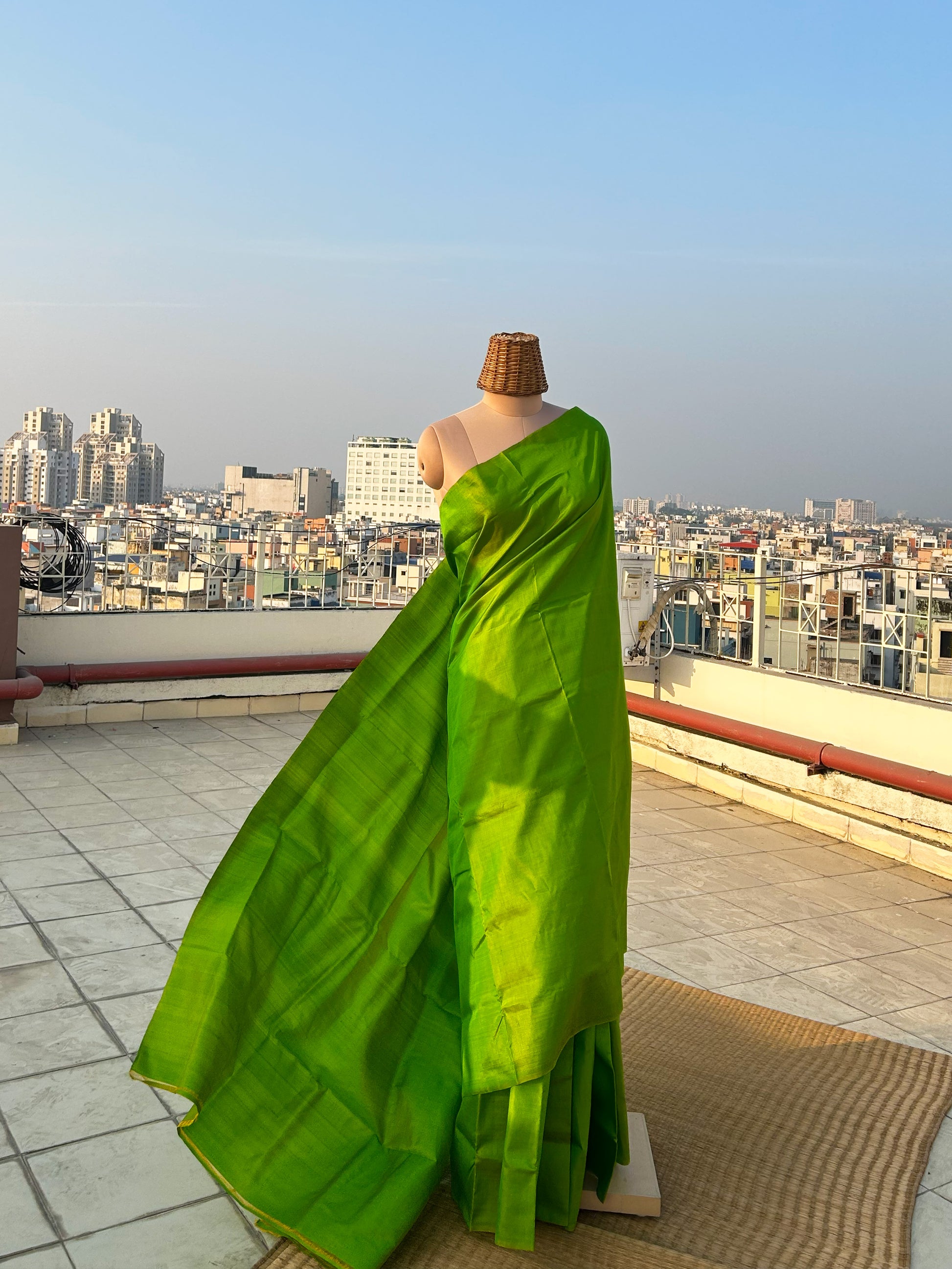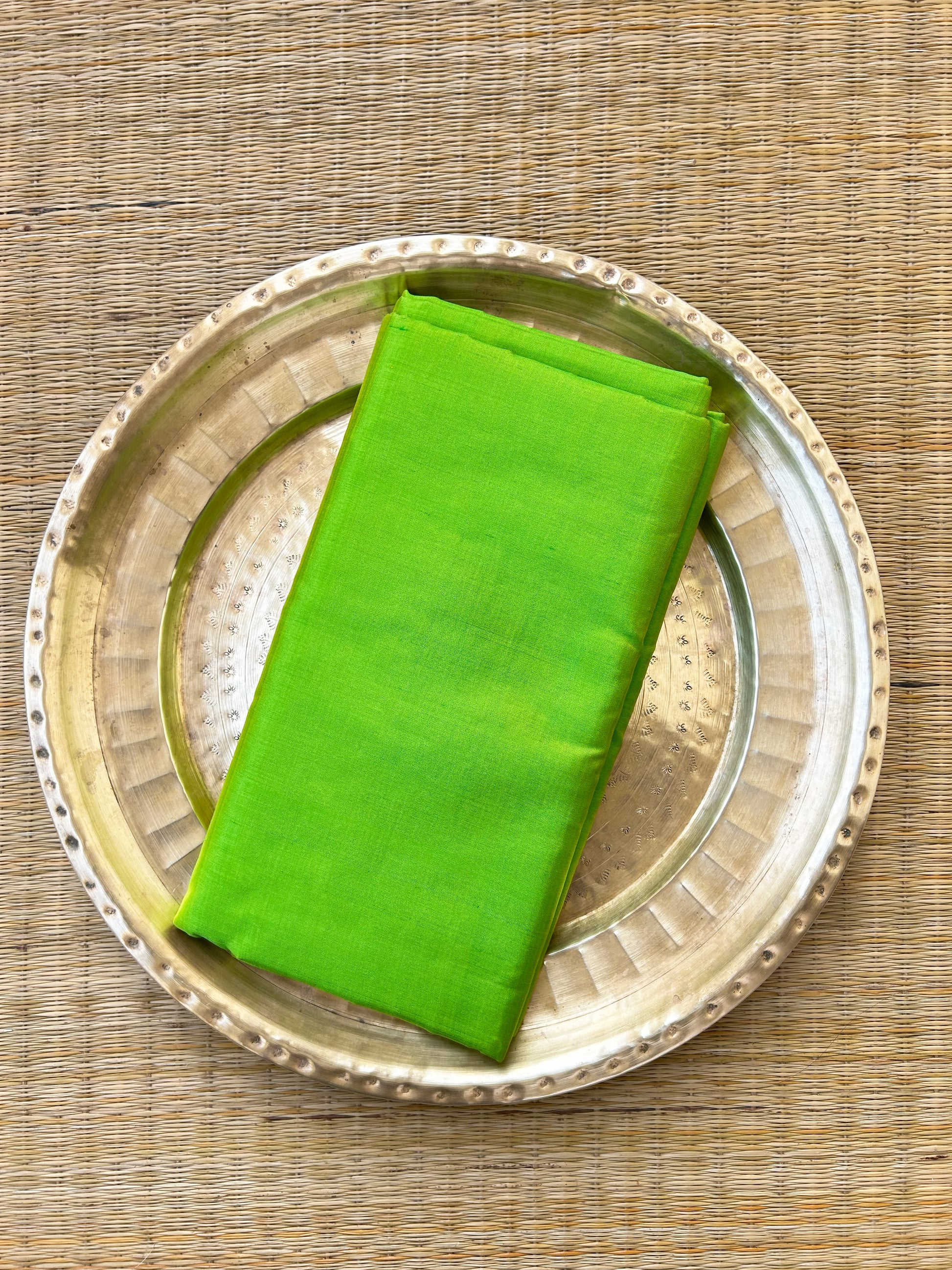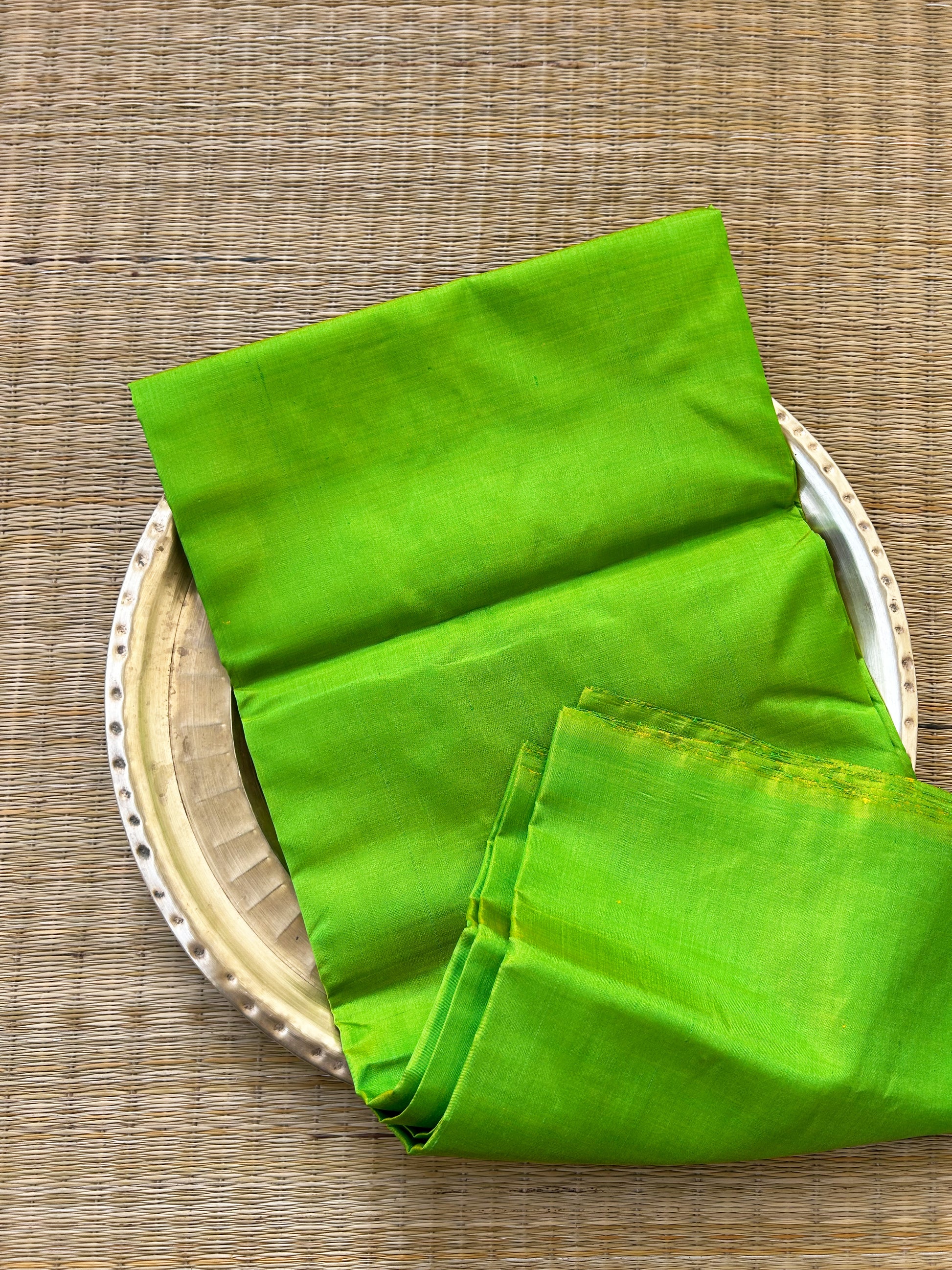 5.5 meters of mulberry silk saree in tia green colour that comes with a matching silk blouse piece. Please note that there may be slight variations in colour since each of our pieces are handcrafted.
