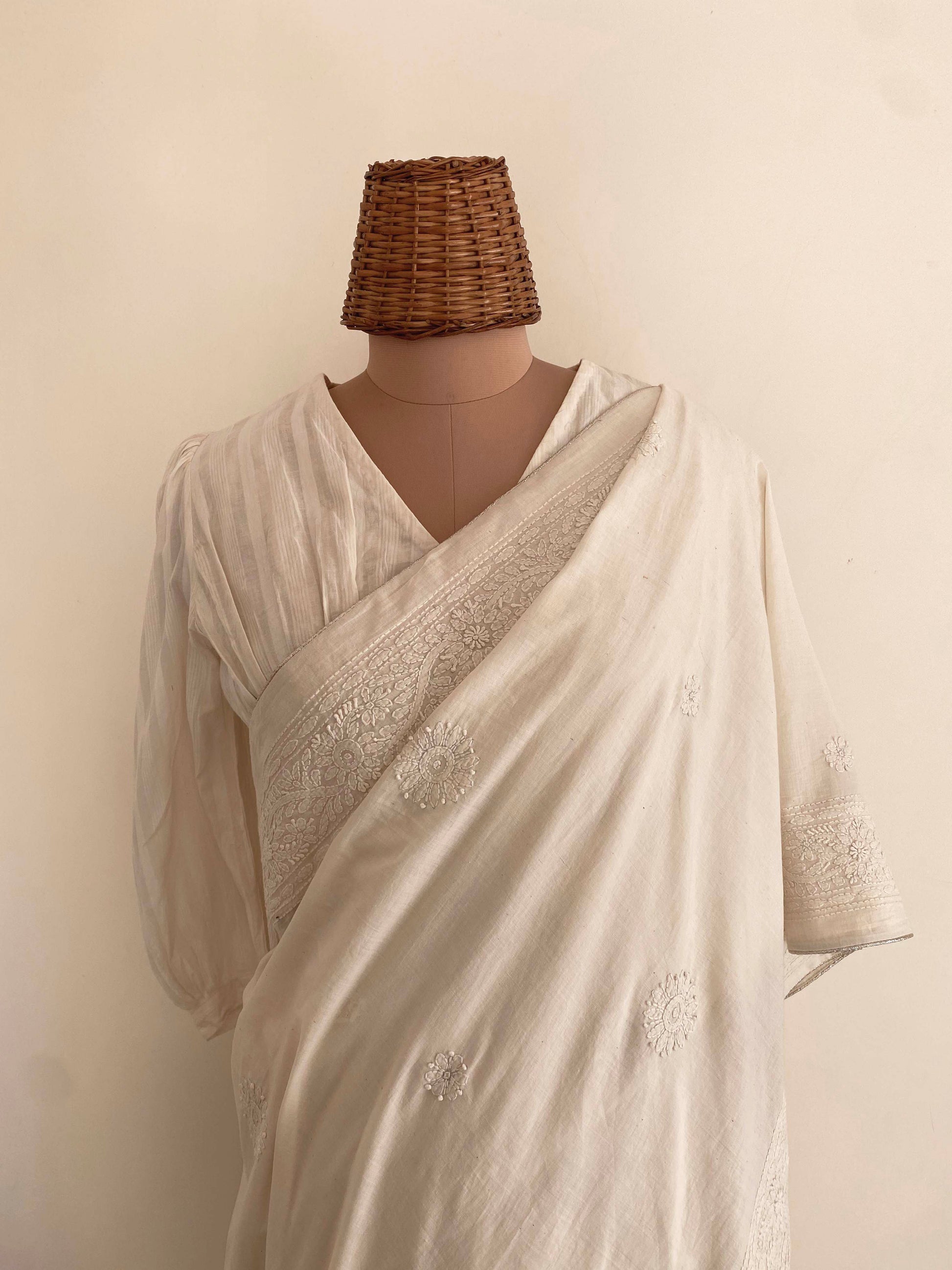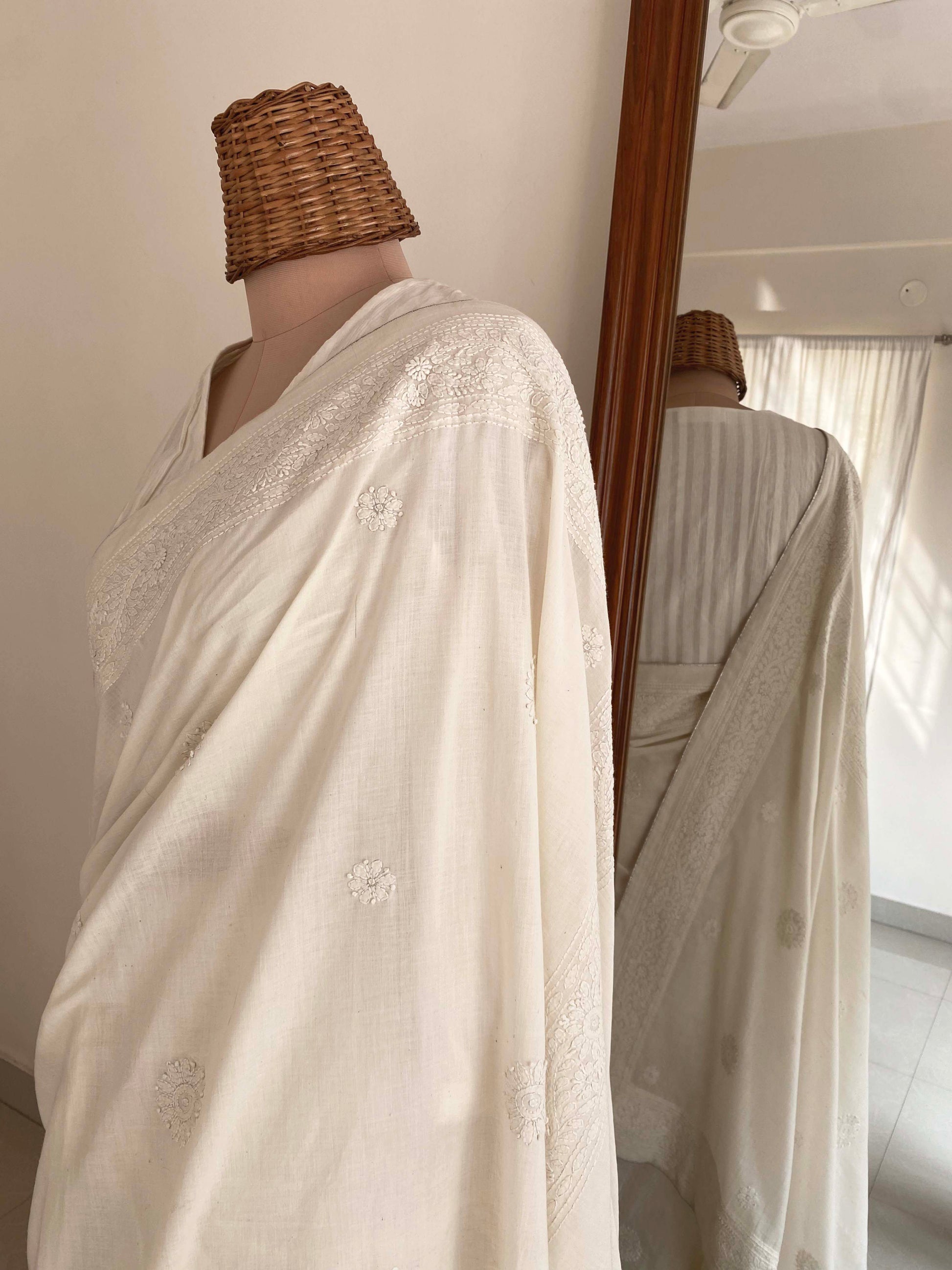 A fine khadi saree in a pure white along with subtle silver zari piping is adorned with meticulously intricate and delicate vintage floral motifs done in chikankari technique.